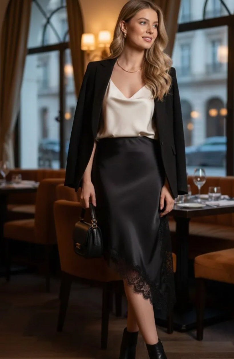 Upptäck denna asymmetriska satinkjol med spetsdetaljer. Dess elastiska midjeband ger både komfort och elegans. Perfekt för en elegant och raffinerad look, den passar enkelt med olika toppar. En storlek passar 36-40.