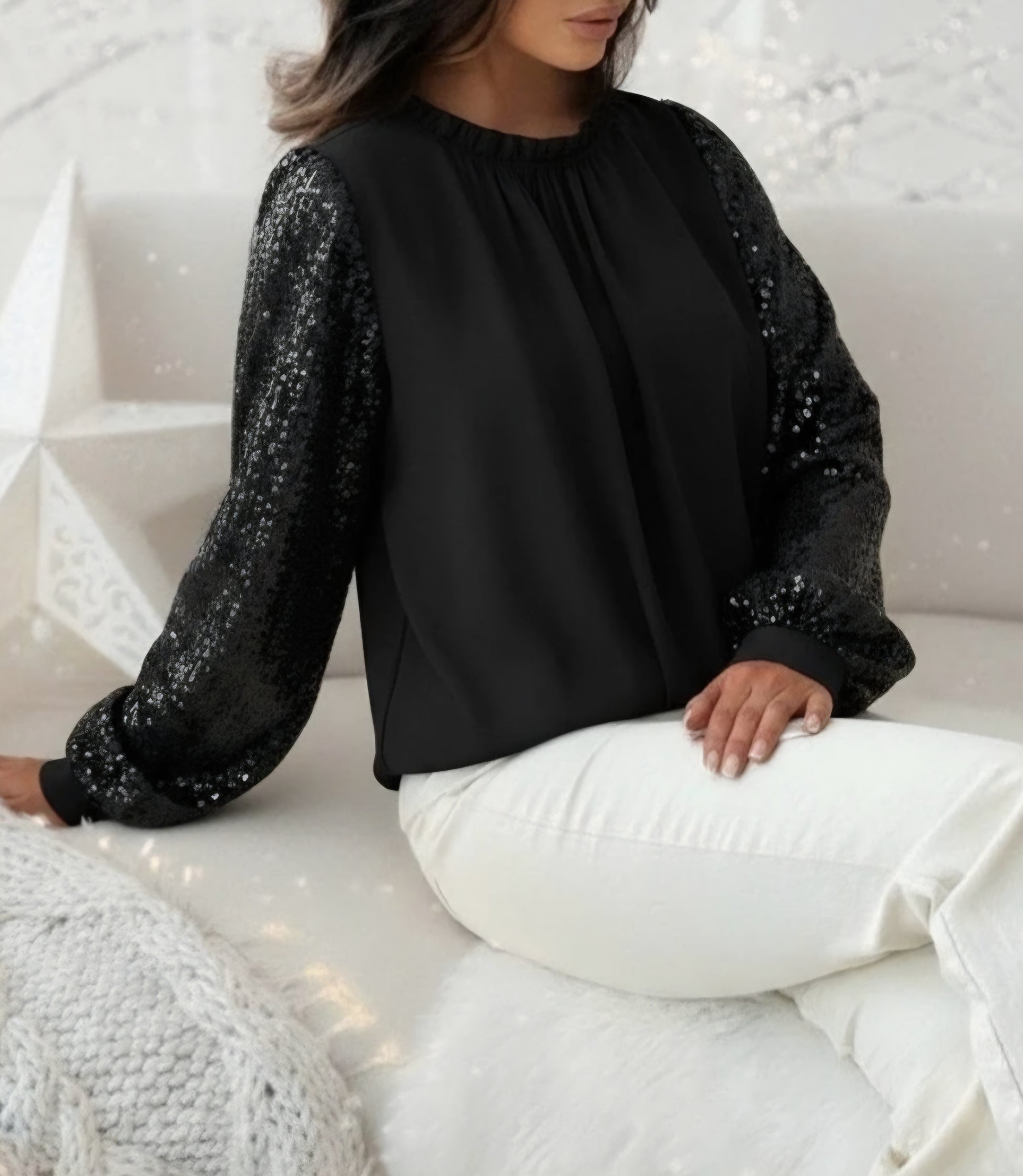 Blus med rynkad halsringning, paljettärmar och viskosfoder