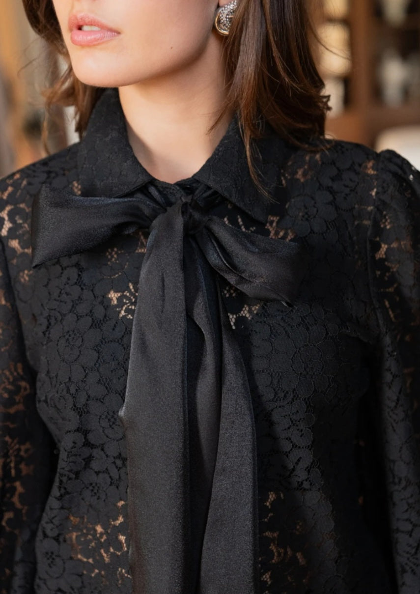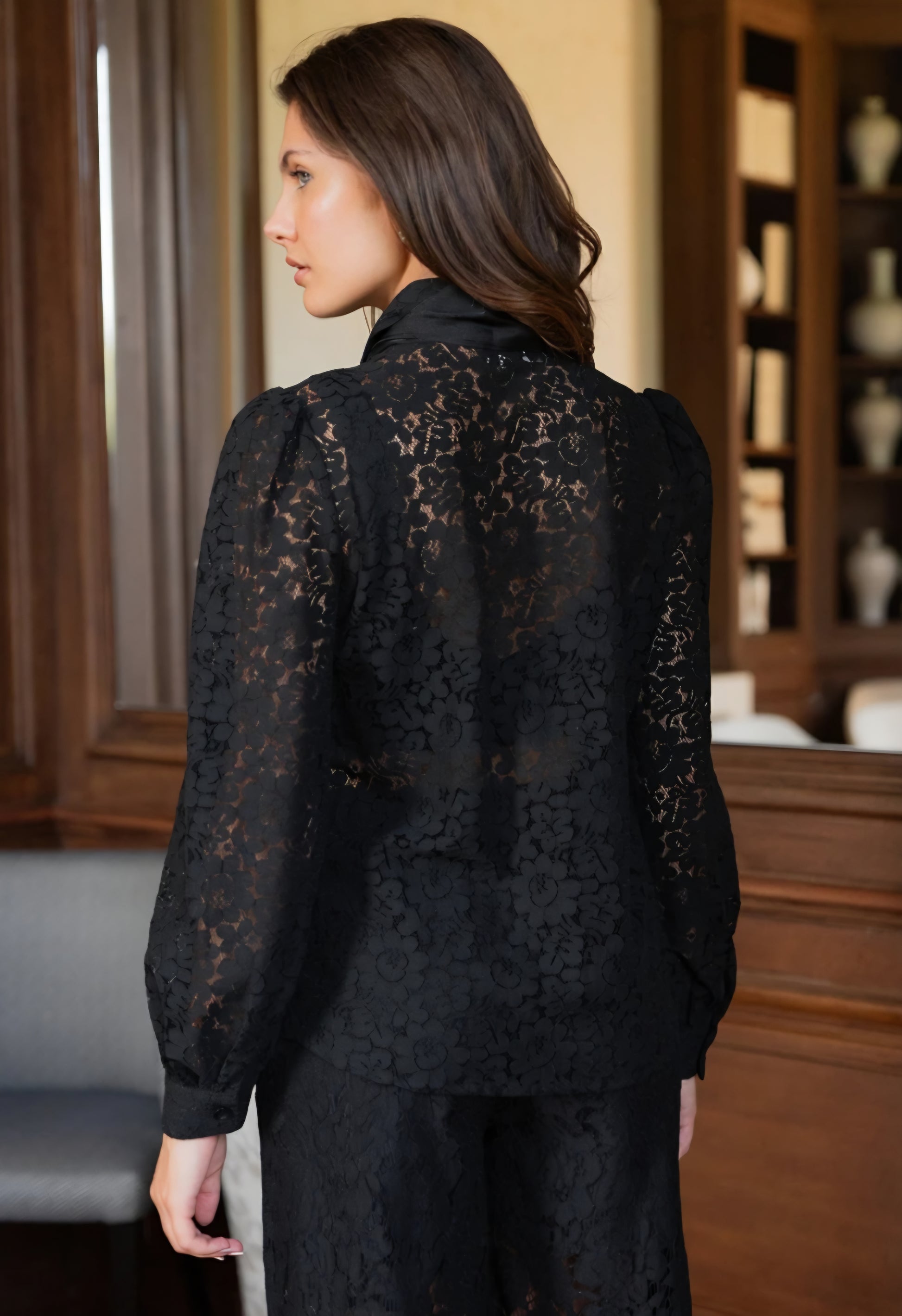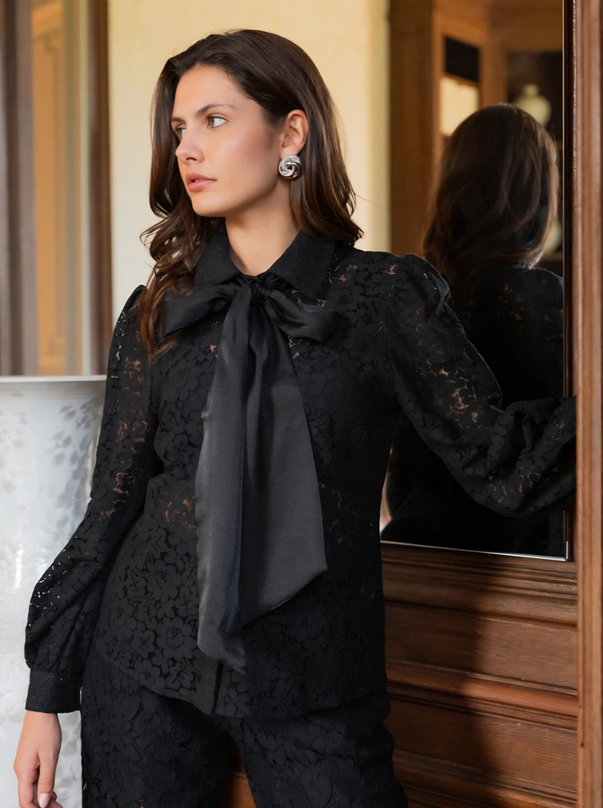 Med sin delikata spets och avtagbara lavallièrerosett framkallar denna skjorta en femininitet som är både djärv och poetisk. Ett sant statement-plagg från höstkollektionen som blandar vintage-anda med modern elegans. Bär den med högmidjade byxor för en djärv look eller instoppad under en kavaj för en sofistikerad stil. Tack vare den avtagbara rosett kan du anpassa din stil som du vill – elegant och klassisk eller mer minimalistisk.