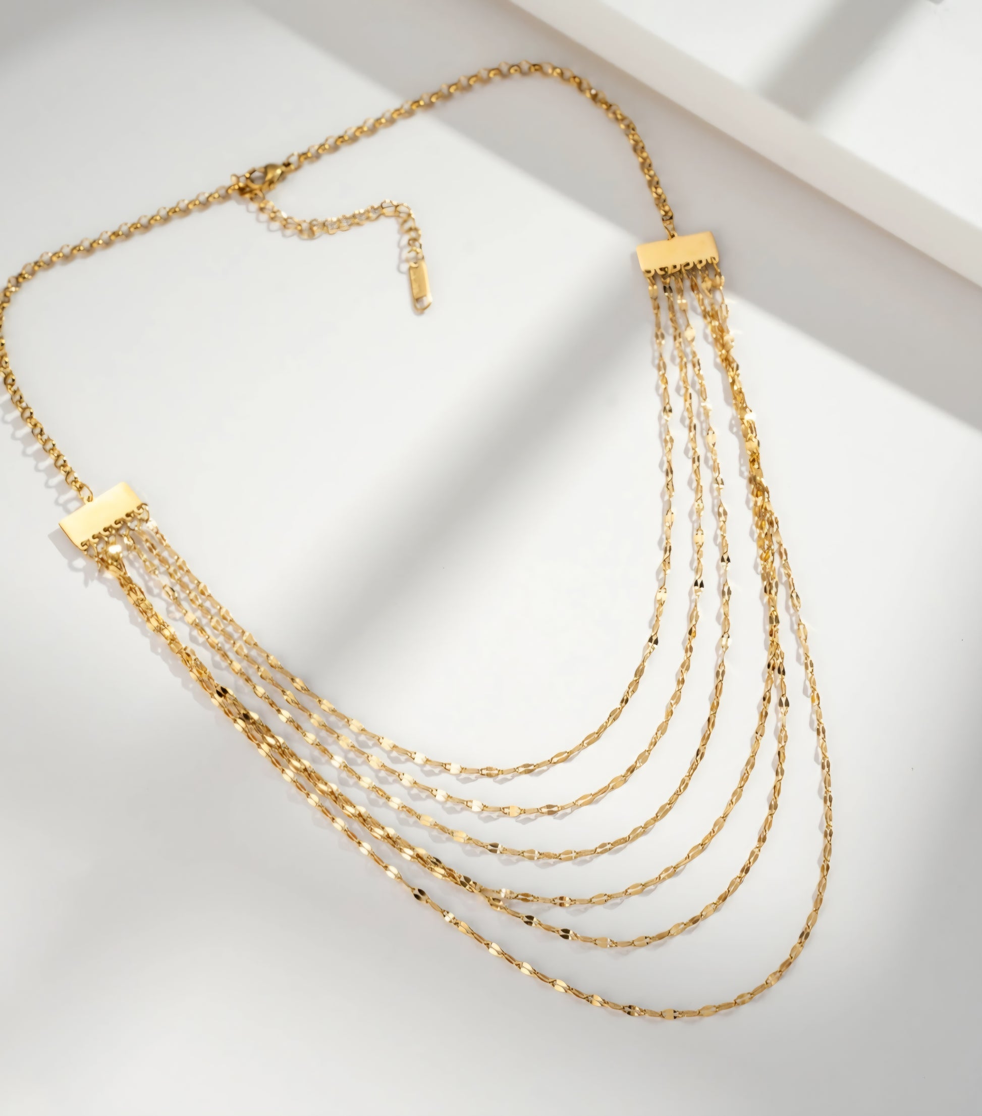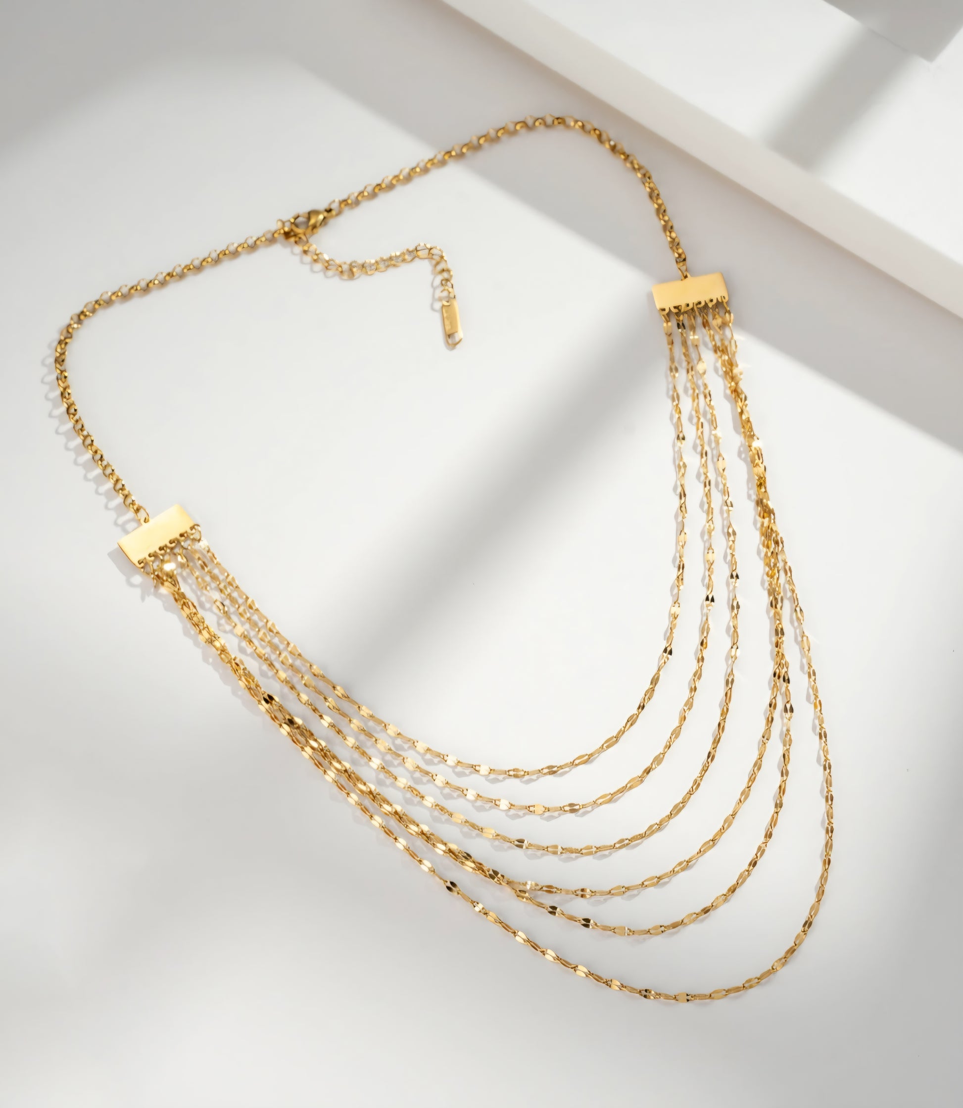 Detta guldfärgade halsband med fem fina kedjor erbjuder en lysande och raffinerad kaskad, perfekt för att förbättra dina outfits från dag till kväll. Dess flytande design, rektangulära kopplingar och justerbara spänne gör det till ett mångsidigt och trendigt smycke. Perfekt för älskare av minimalistiska smycken, ger detta flertrådiga halsband en elegant och modern touch. Ett måste-ha modeaccessoar, det lyser elegant upp halsringningen.