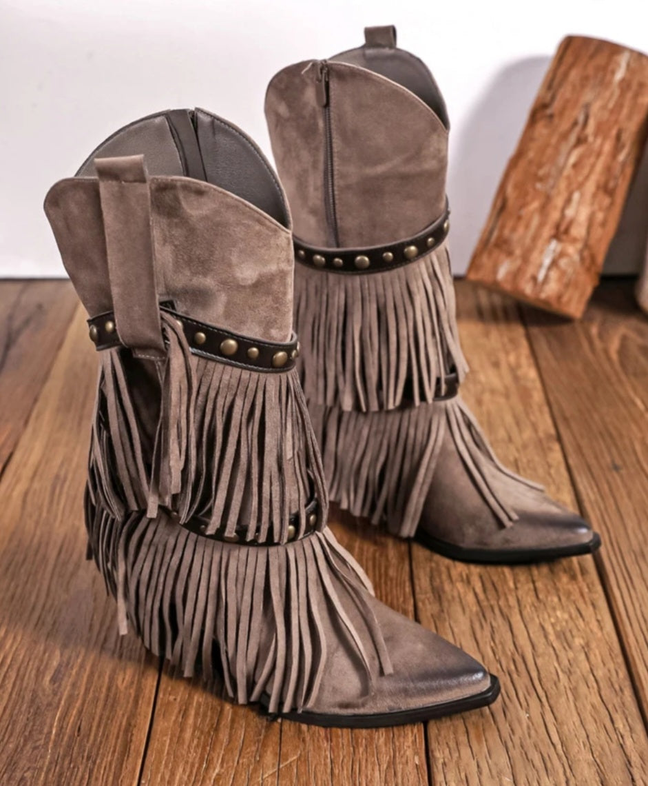 Fransiga cowboystövlar, avtagbara fransar Taupe