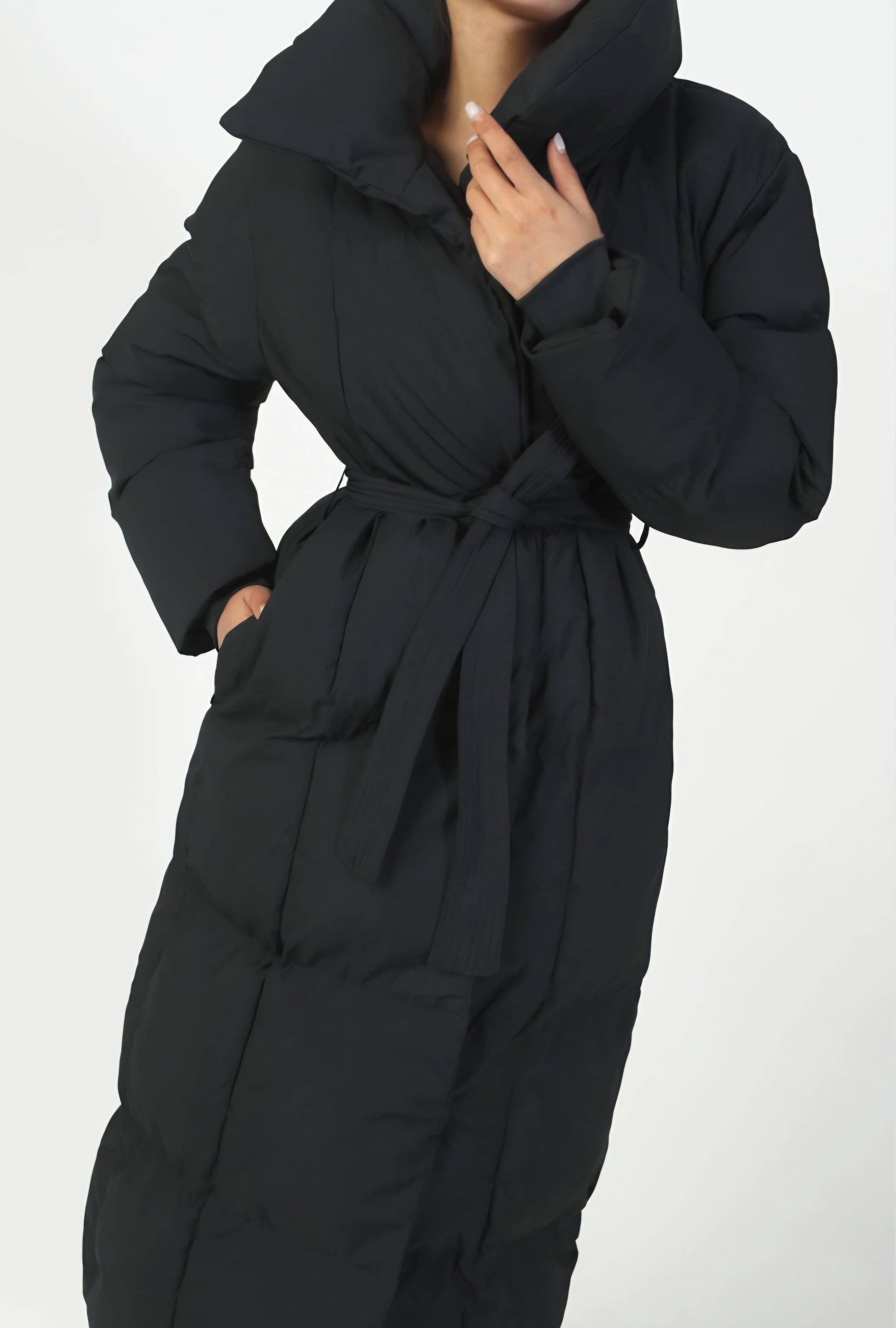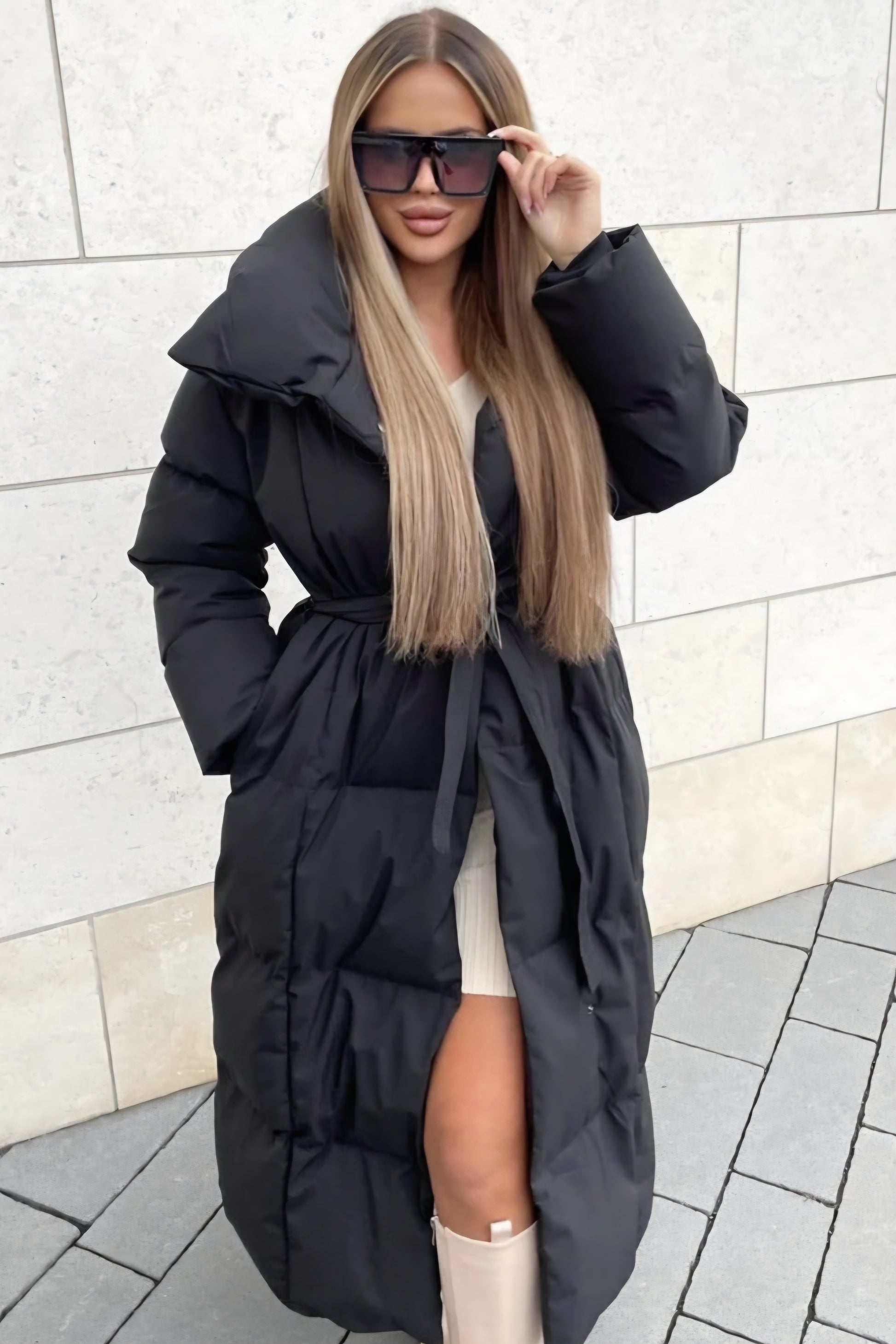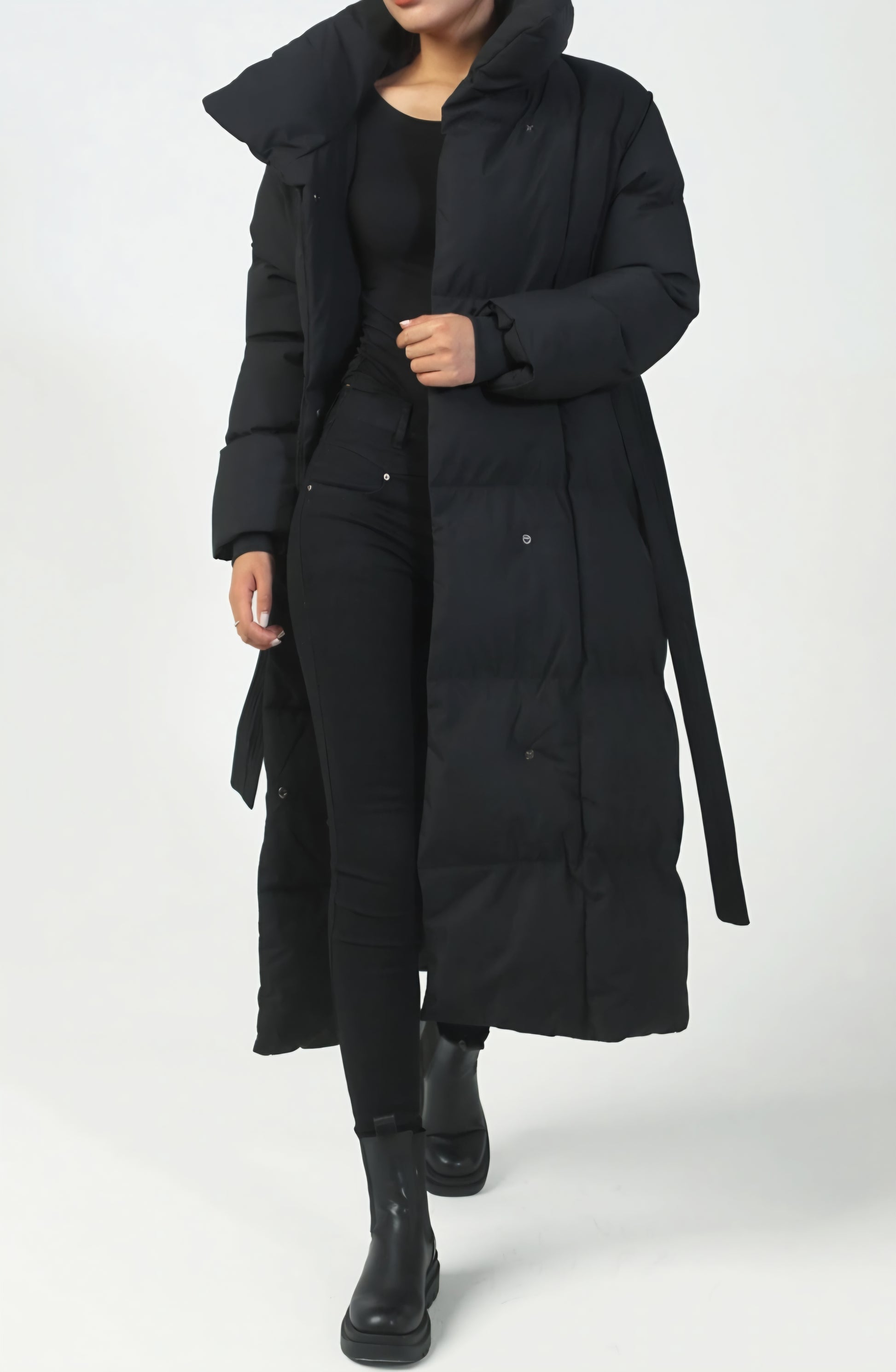 Lång vinterjacka med krage, knappar och justerbart bälte. Osynlig fickor