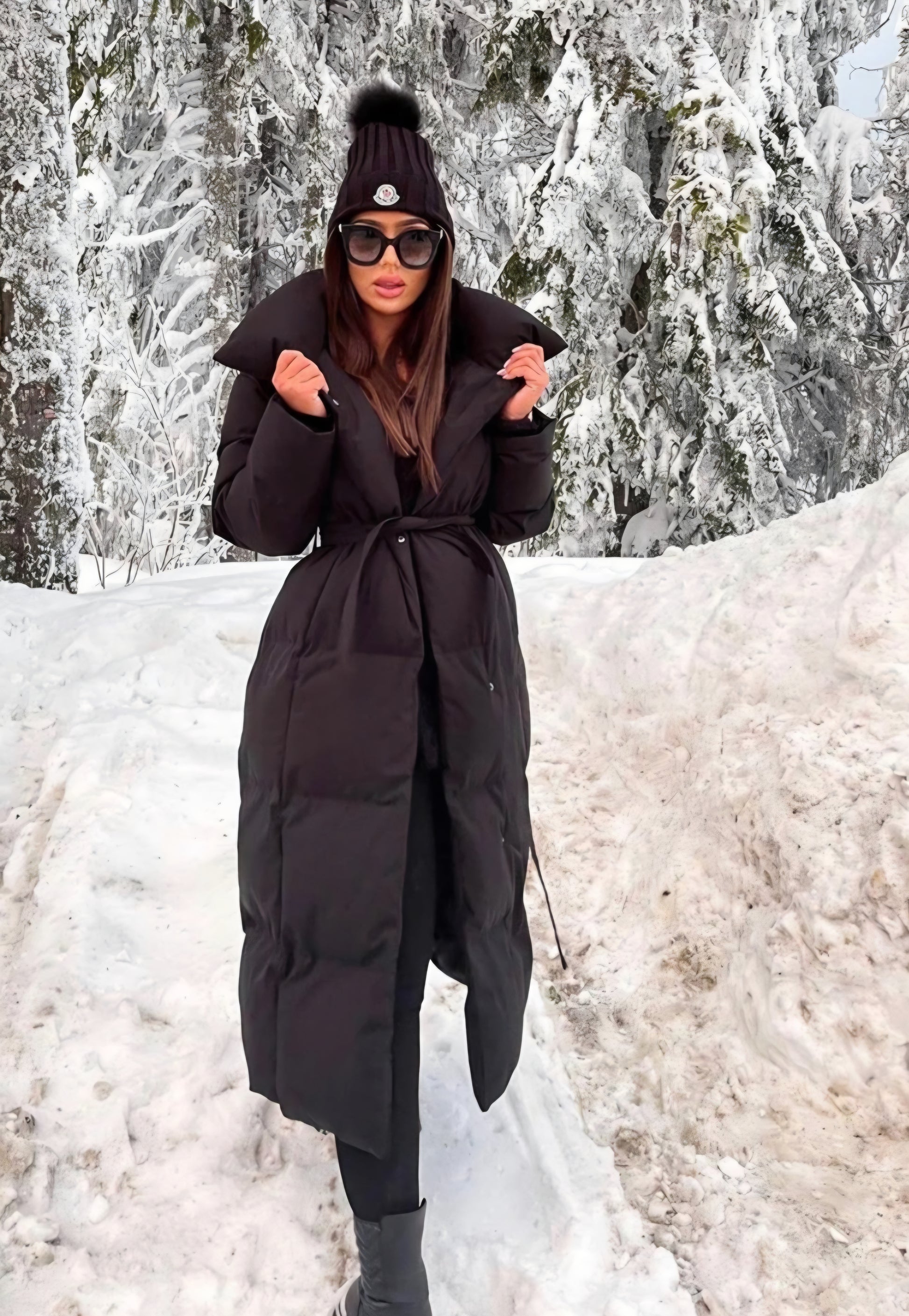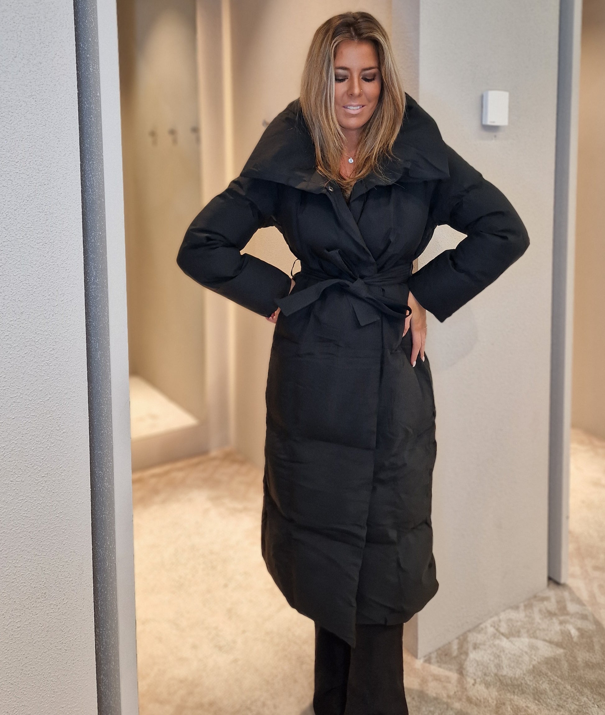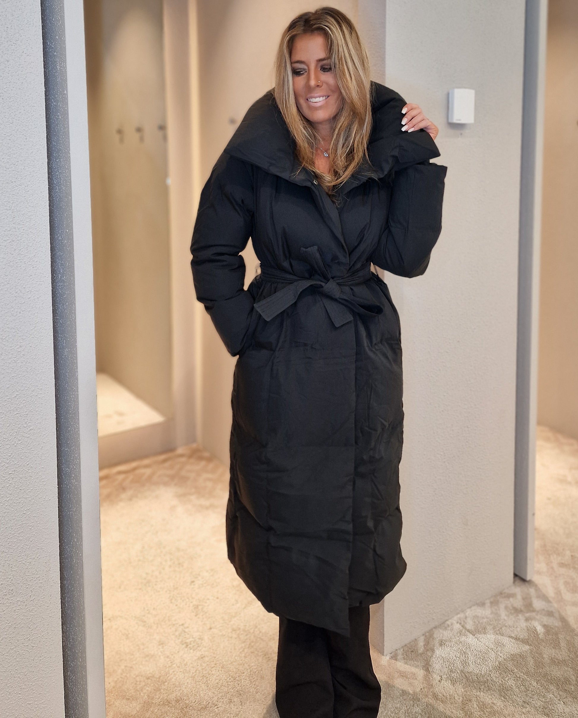 Lång vinterjacka med krage, knappar och justerbart bälte. Osynlig fickor