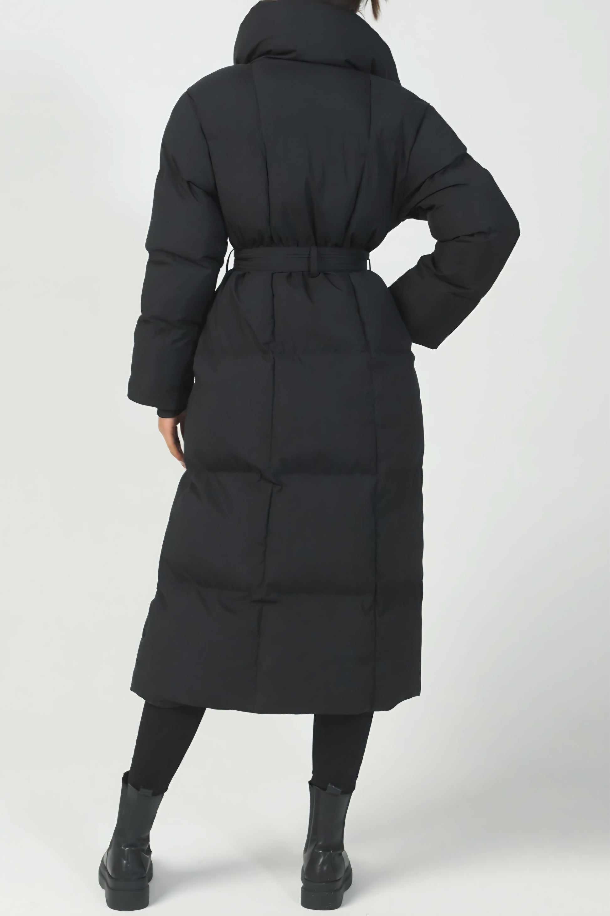 Lång dunjacka i quiltat tyg med hög krage med slag. Långärmad modell med infällda ärmhål. Ribbade muddar i ärmsluten. Åtsittande modell. Tryckknappsknäppning fram. Avtagbart knytbälte. Fickor dolda under sömmarna på sidorna. Fodrad inuti. Modellen är 176 cm lång.