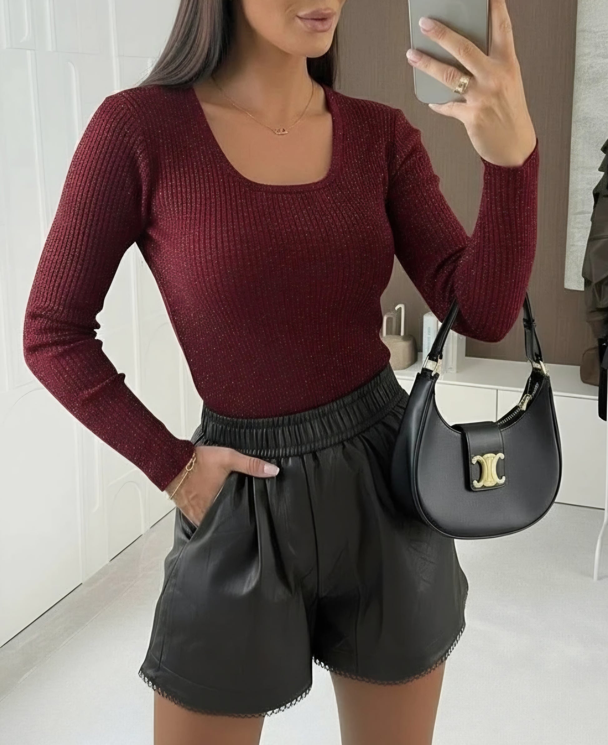 Denna skimrande topp framhäver silhuetten med sin åtsittande skärning och subtilt glittrande effekt. Elegant och bekväm, den passar perfekt med jeans eller kjol för en chic look, både dag och kväll. Ett feminint must-have i varje garderob.