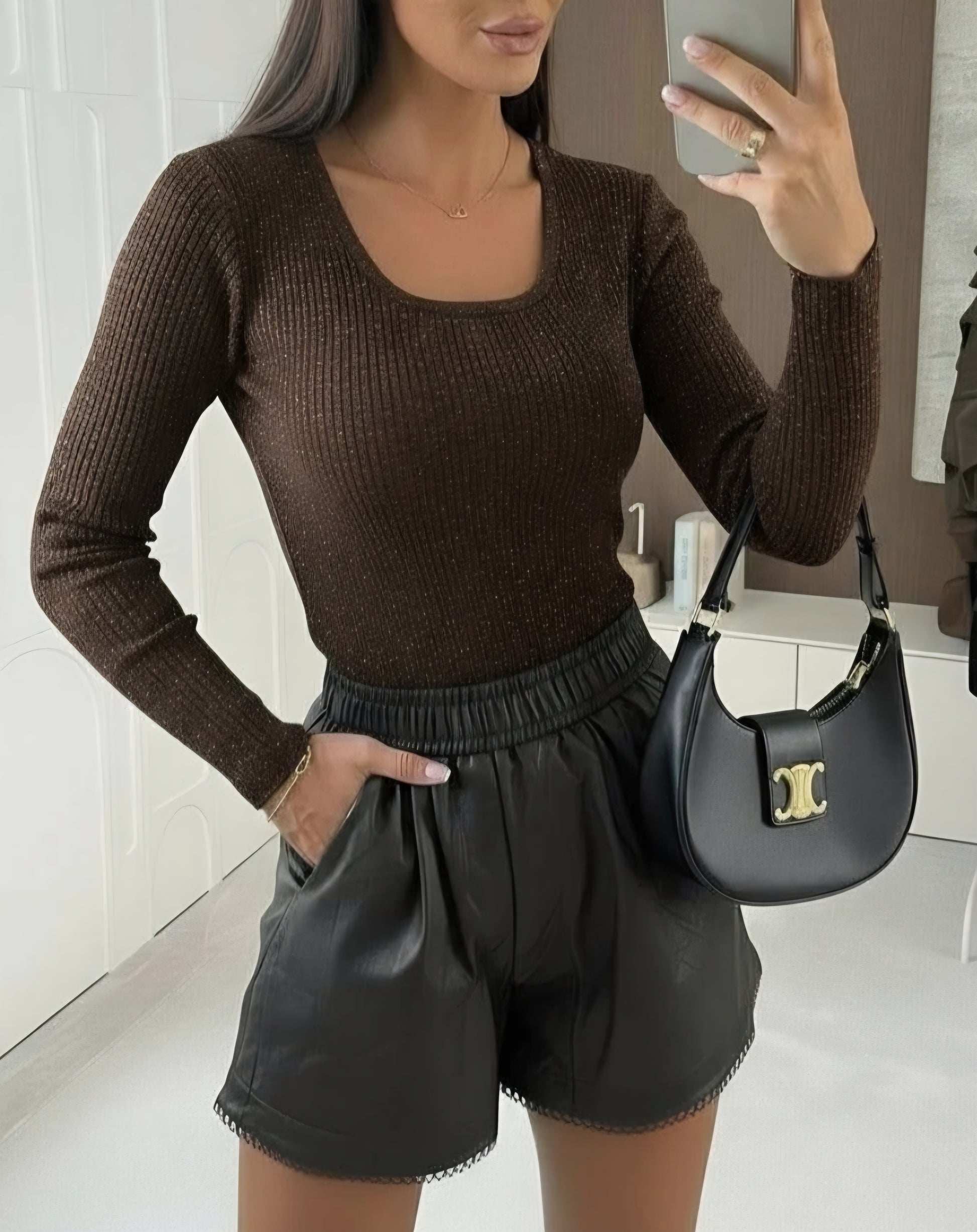 Denna skimrande topp framhäver silhuetten med sin åtsittande skärning och subtilt glittrande effekt. Elegant och bekväm, den passar perfekt med jeans eller kjol för en chic look, både dag och kväll. Ett feminint must-have i varje garderob.