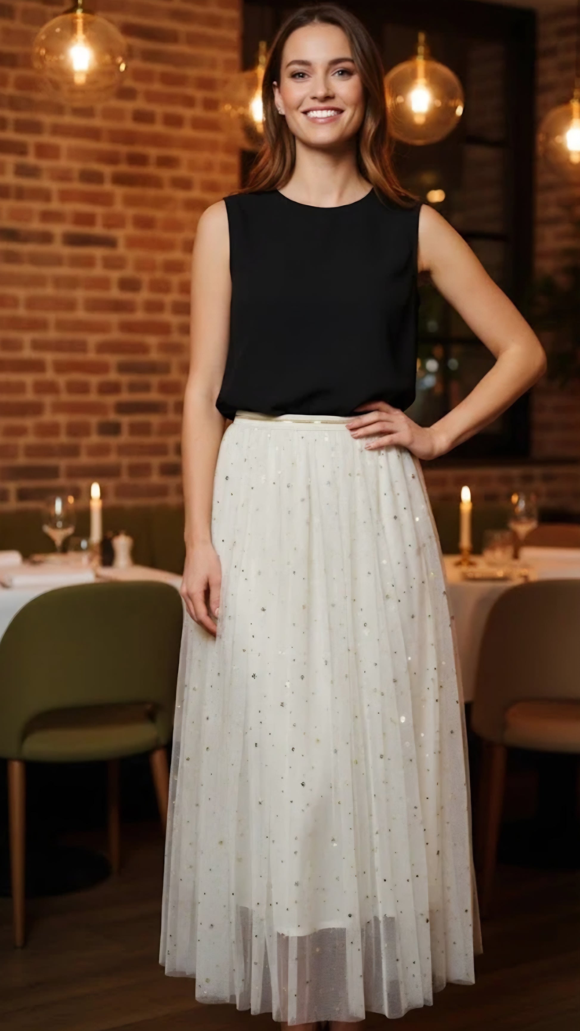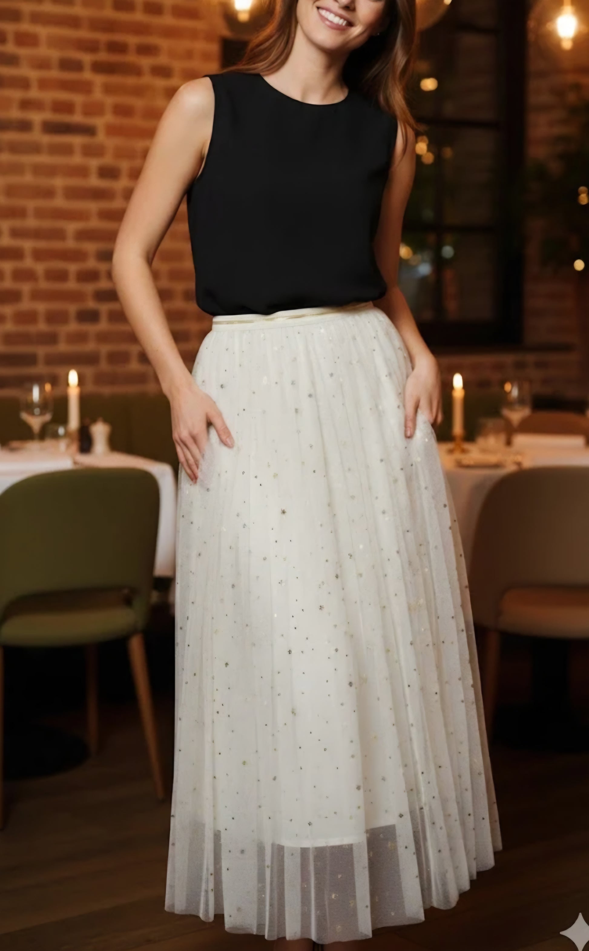 Mellanlång tyllkjol, lätt och luftig, prydd med glittrande stjärnor. Resår i midjan för optimal komfort. Perfekt för både formella och vardagliga tillfällen, den ger en touch av magi till vilken outfit som helst