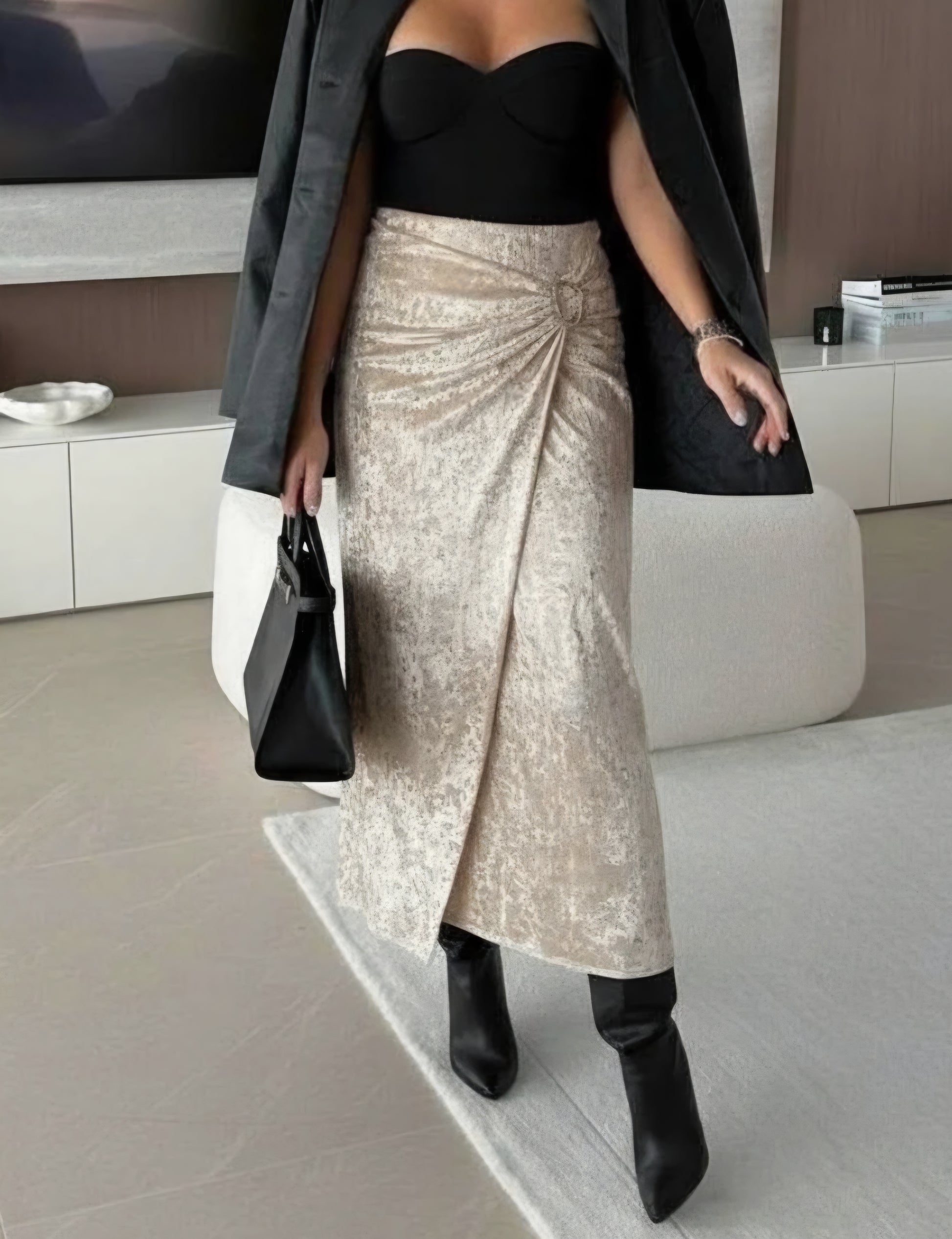 Paljettkjol med resår i midjan och guldfärgad ring Beige