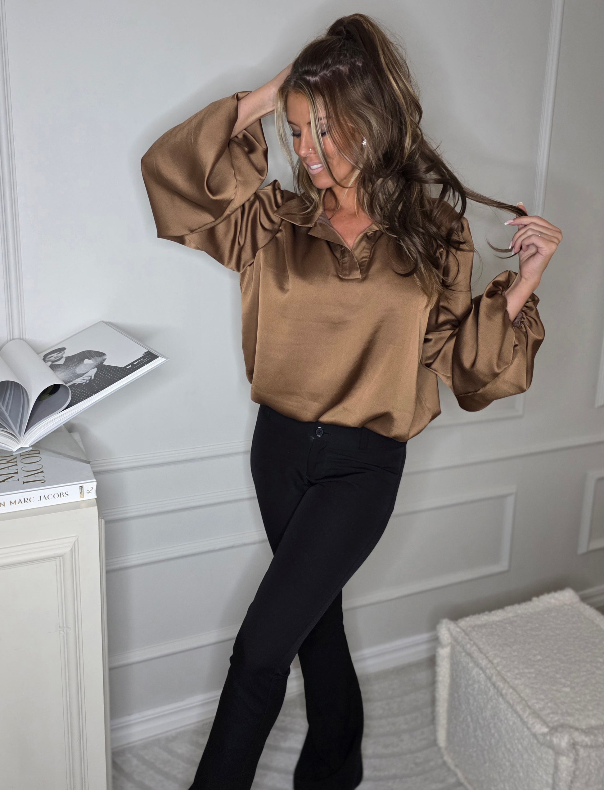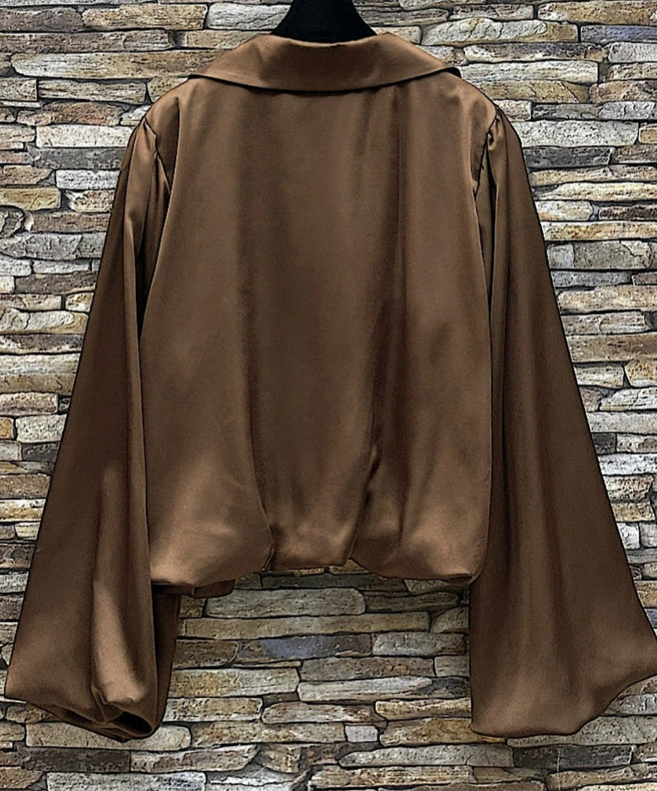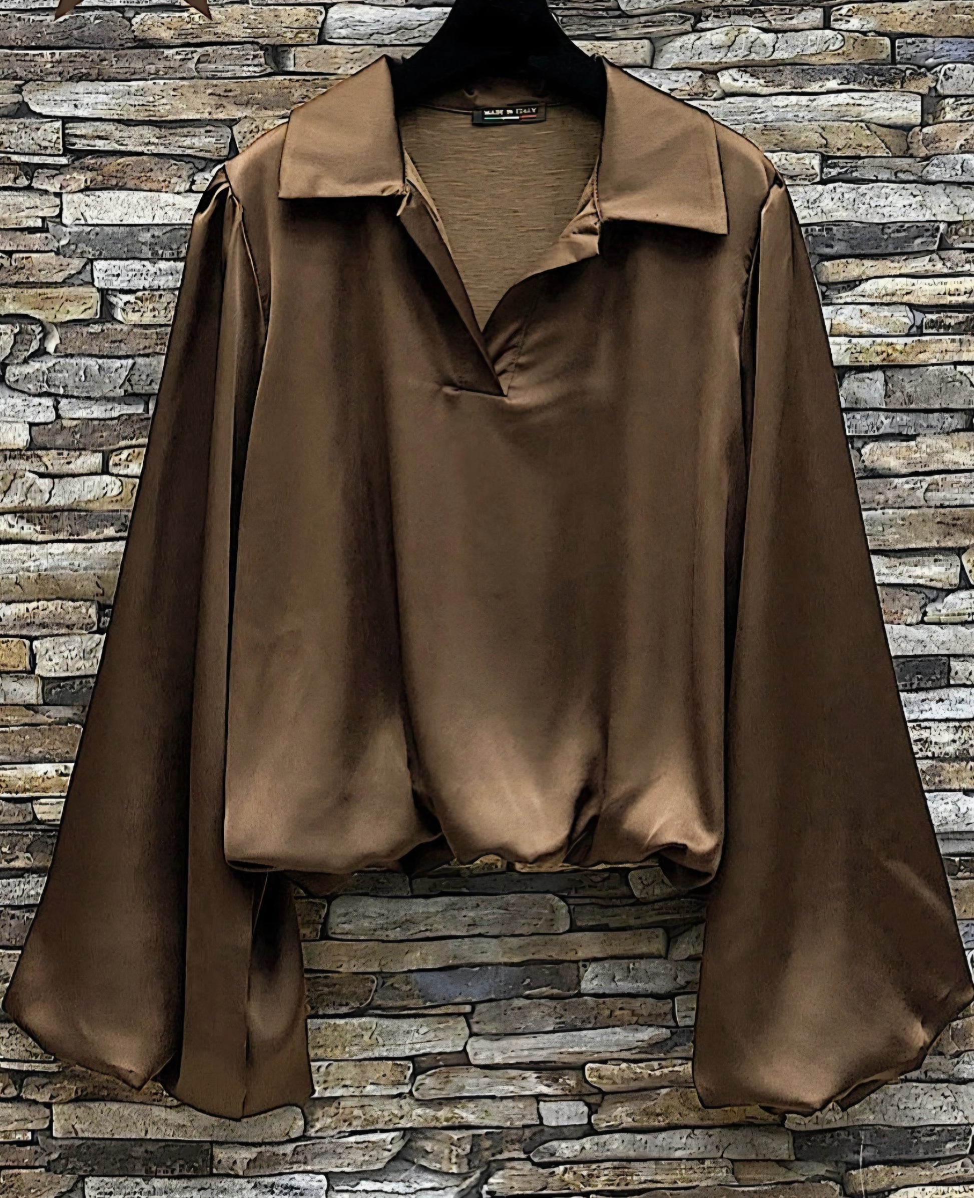 TARA-blus, romantiska, böljande ärmar i satin med ett elegant och trendigt viskosfoder.