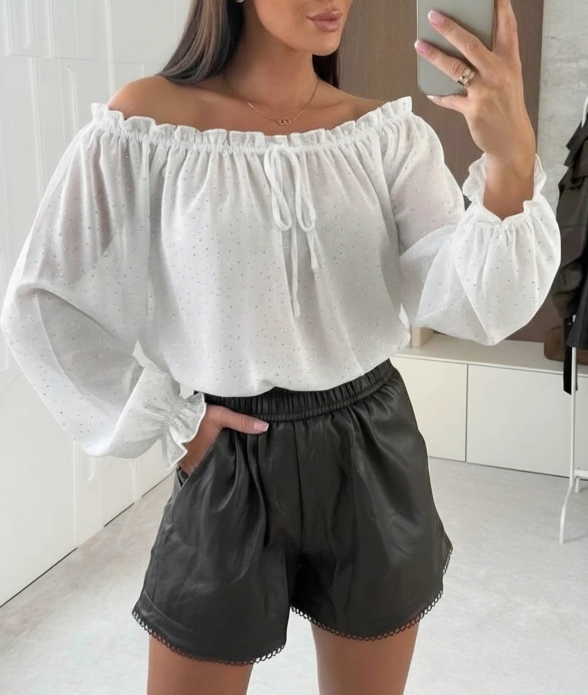 Böljande chiffongtopp, bara axlar, med små glittriga detaljer för en elegant och lysande look. Justerbar resår i halsringningen med knytband, långa, lätt puffärmar med volang. Smockad nederkant för perfekt stöd och en smickrande skärning. Perfekt för eleganta looks, utflykter och kvällar.