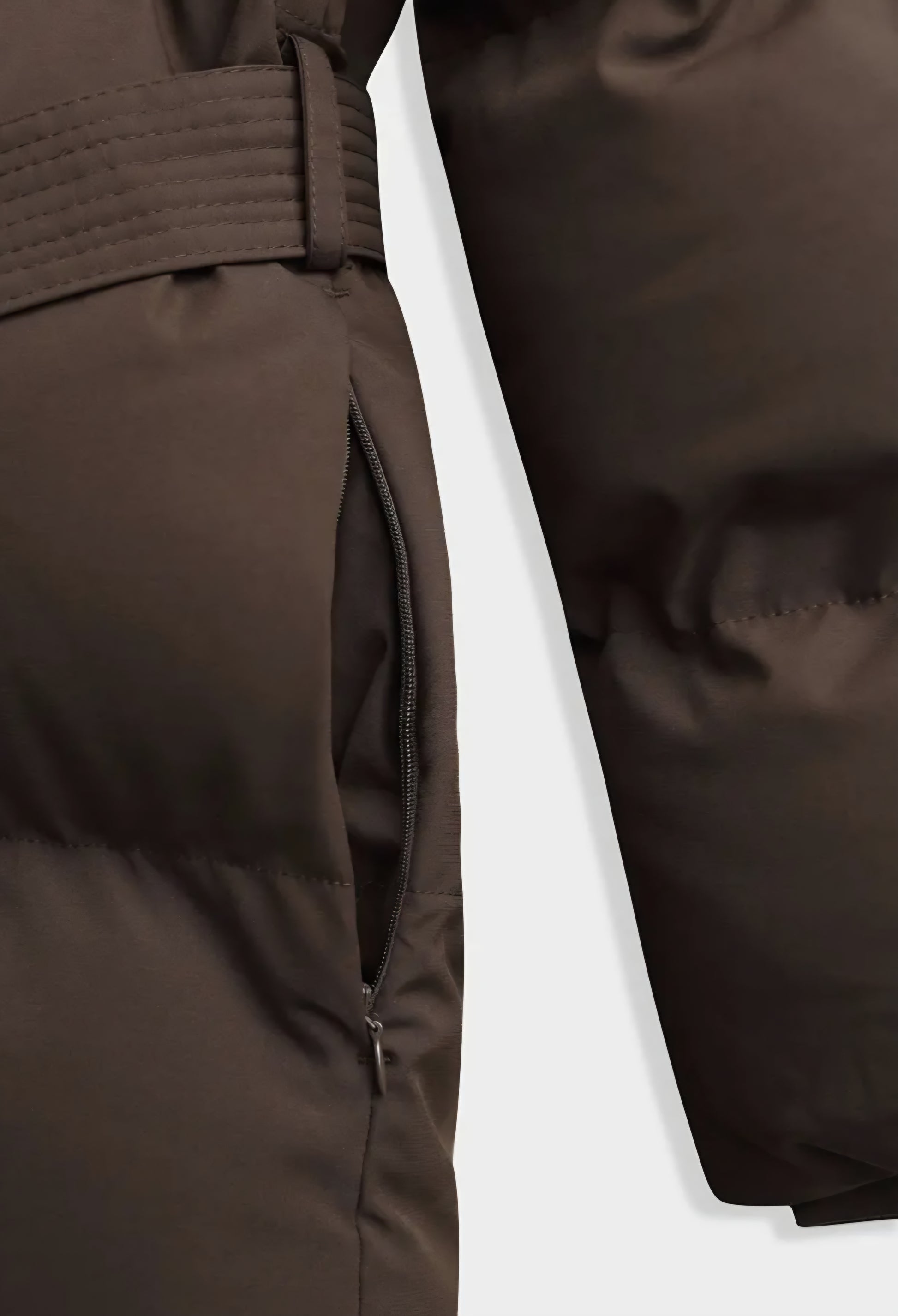 Lång vadderad dunjacka med huva. Långa ärmar med ribbad kant. Avtagbart skärp att knyta. Sidofickor dolda under sömmarna. Dold tryckknappsknäppning. Dubbel.