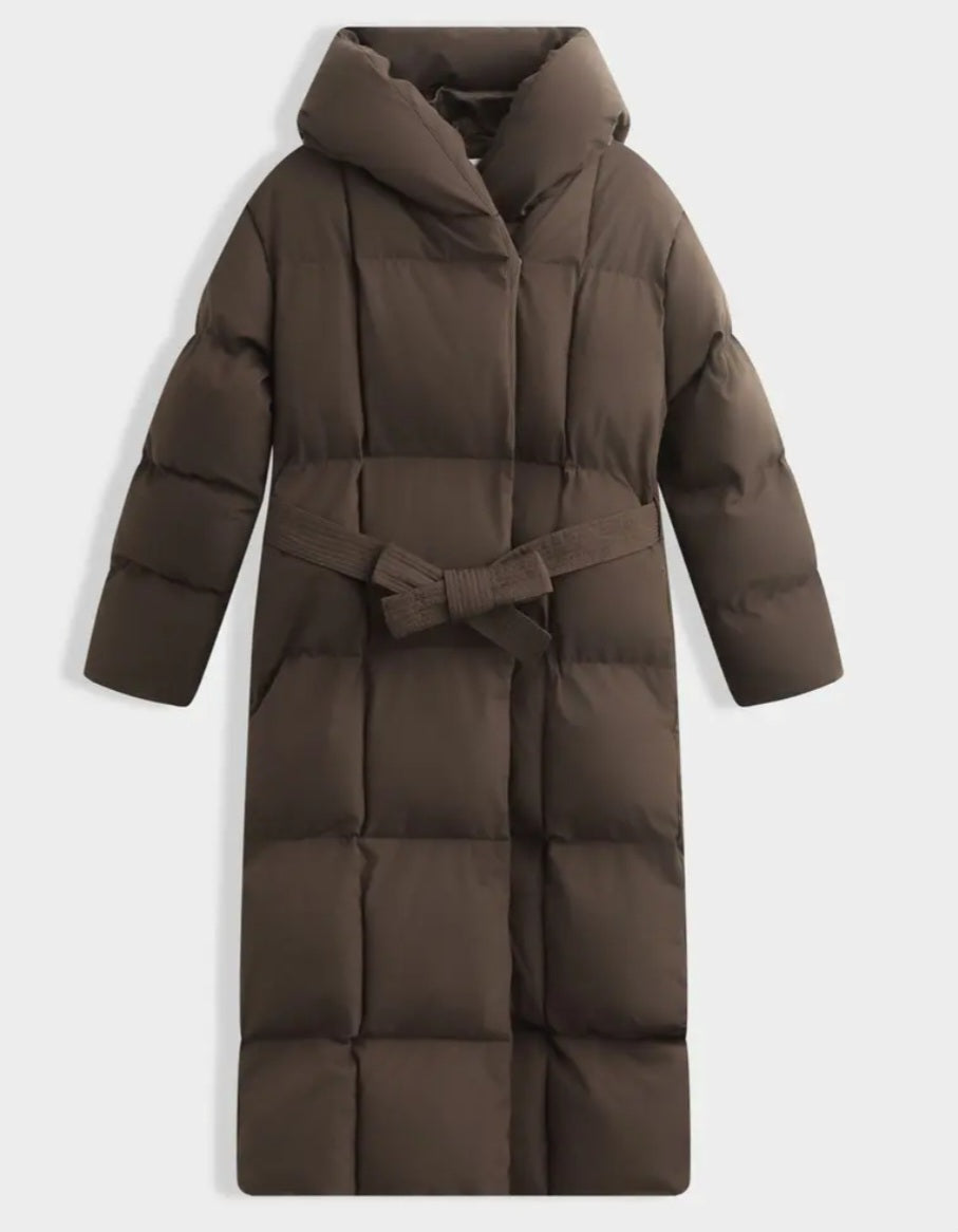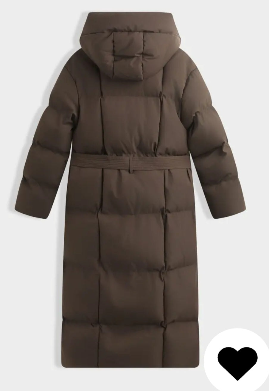 Lång quiltadjacka med bälte, huva Brown