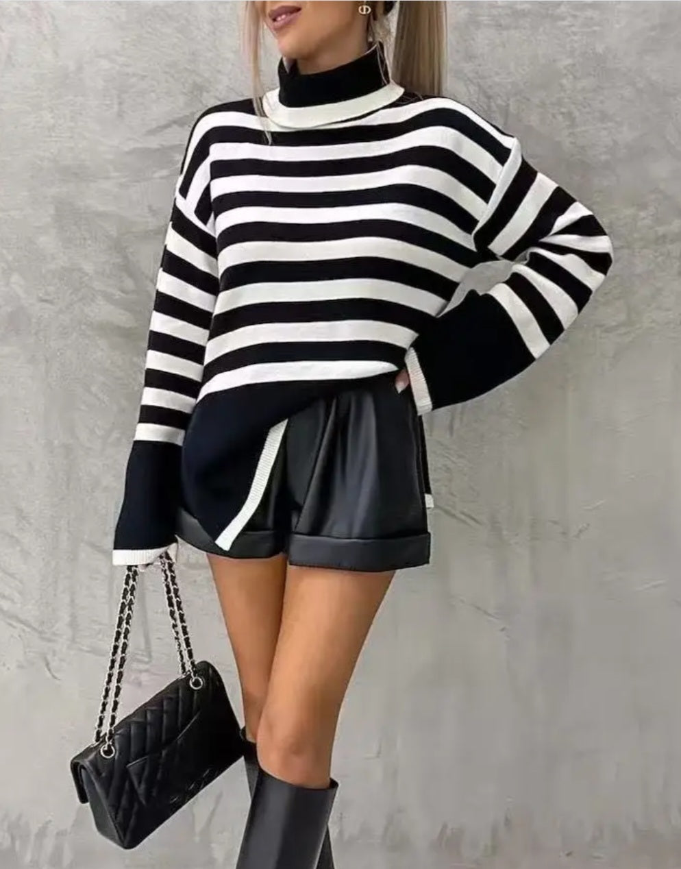 Randig stickad tröja med polotröja. Den stickade toppen finns i en storlek som passar alla.