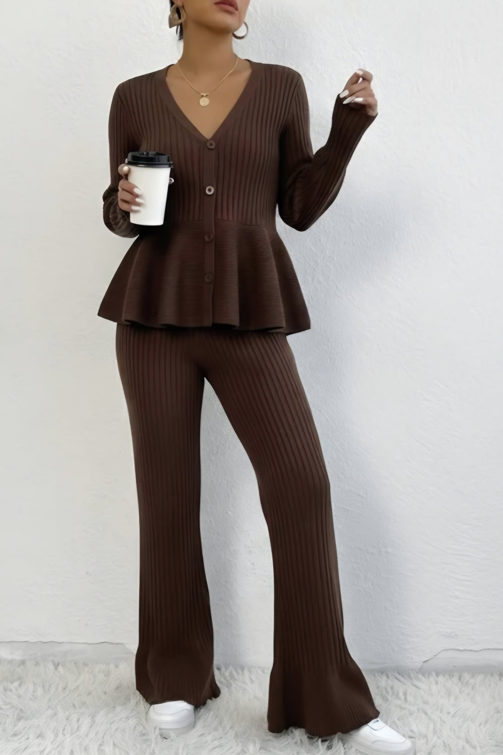 Ribbstickat set med V-ringad topp med långa ärmar och peplumfåll. Slå om med fuskknappar framtill. Matchande byxor med resår i midjan och utsvängd fåll.