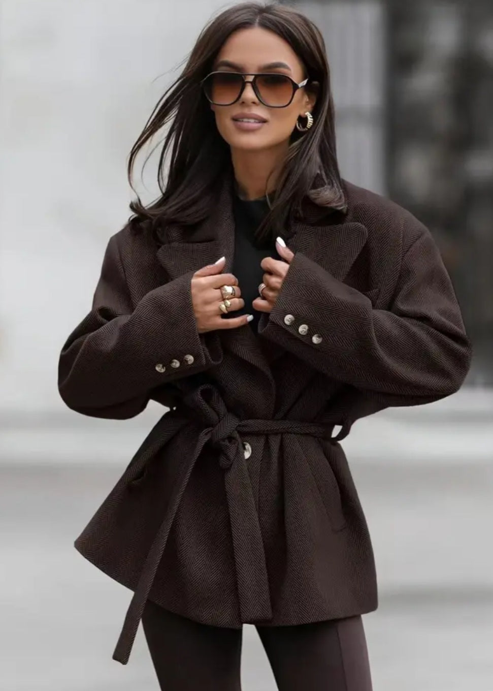 Snygg randig kavaj, 100 % polyester, perfekt för hösten. Snygg och praktisk med skärp och fickor.
