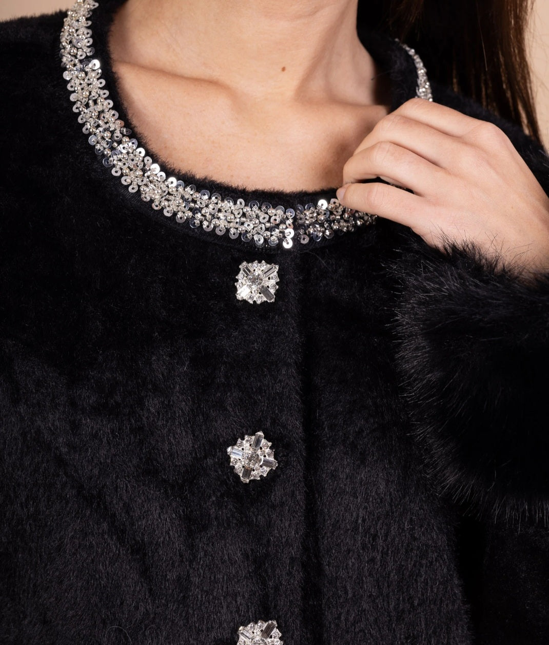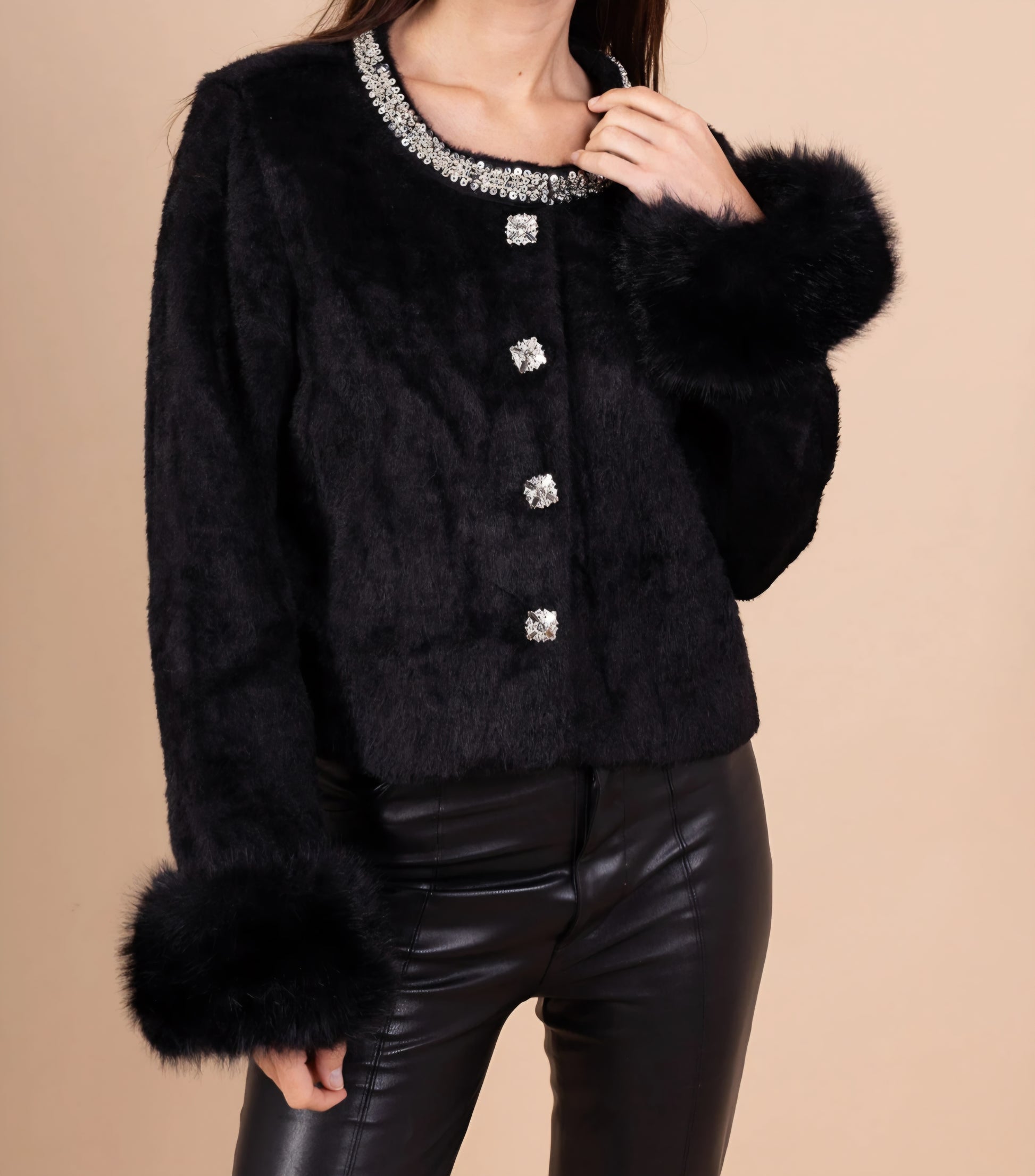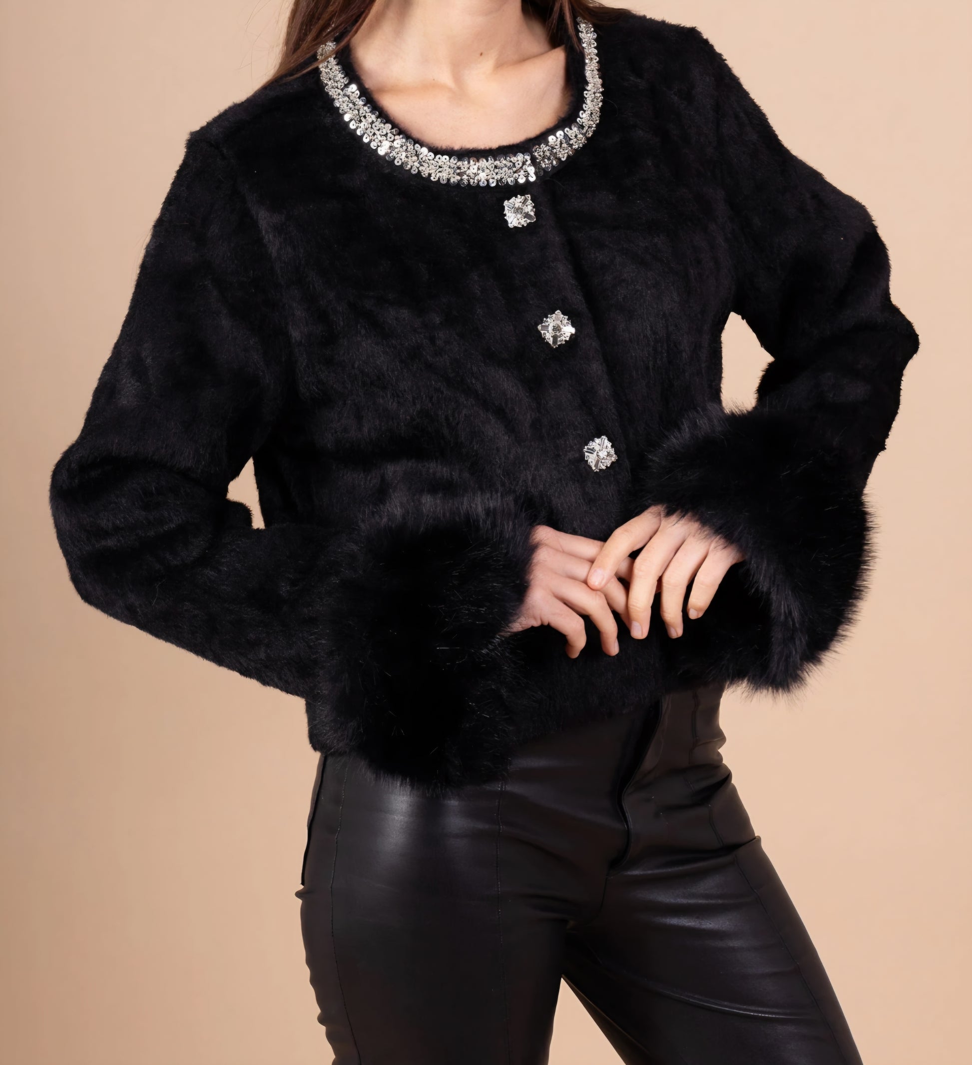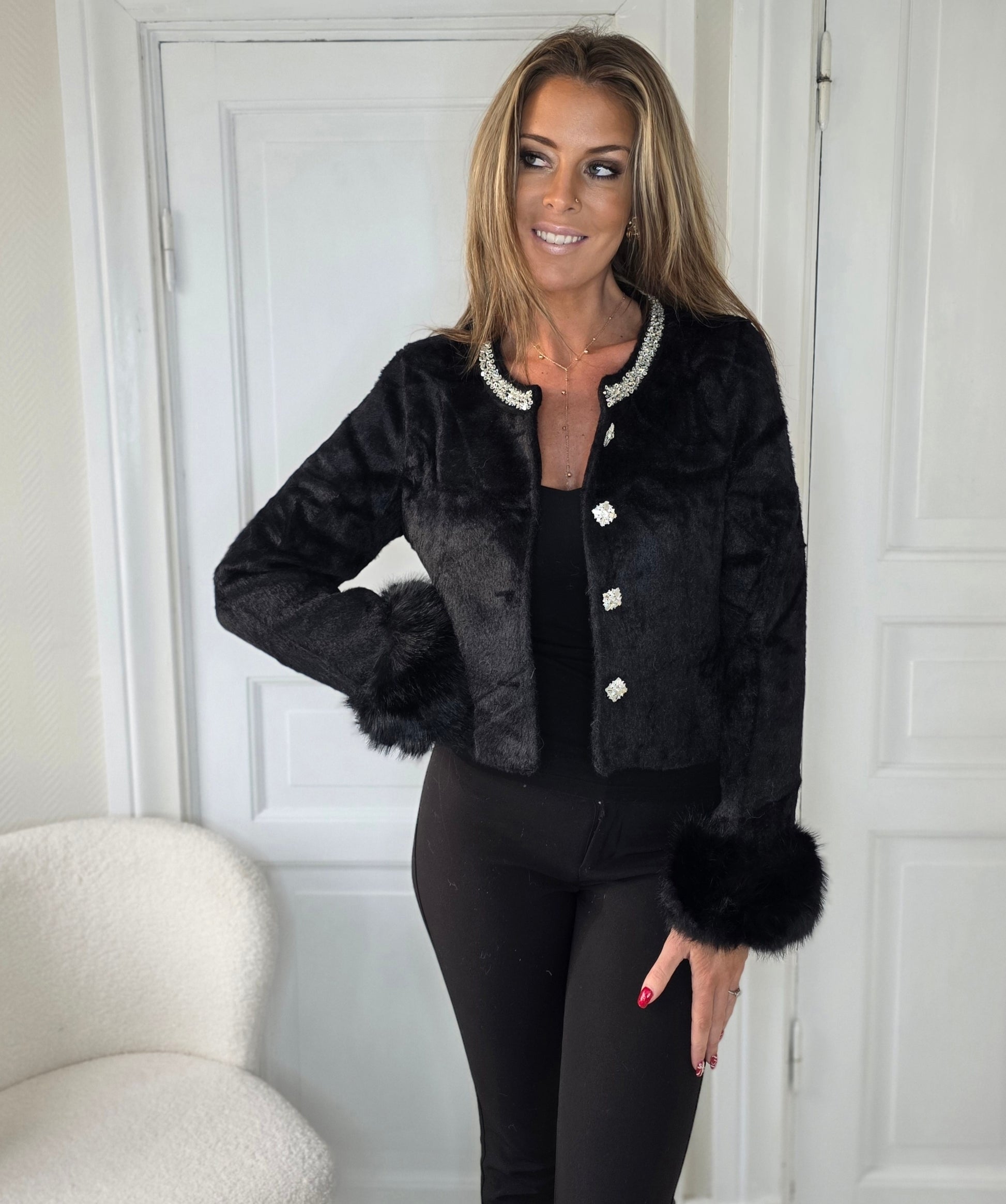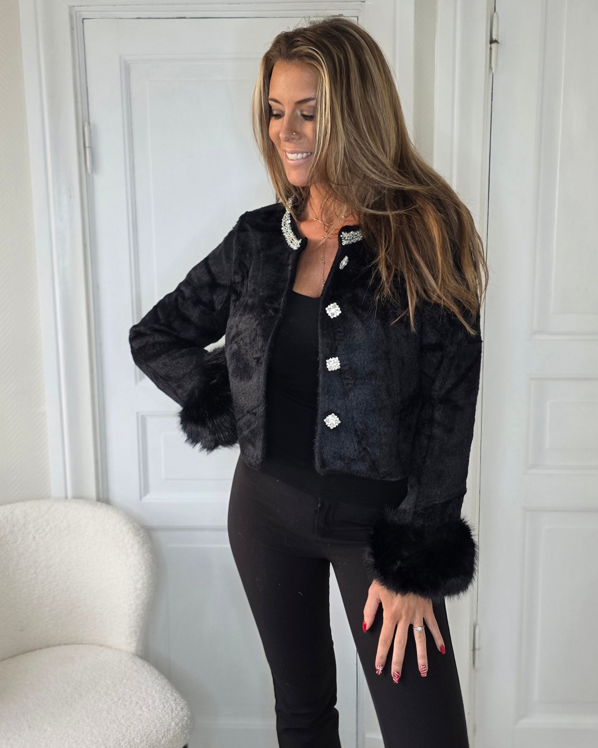 Svart Jacka i fuskpäls med snygg silver krage