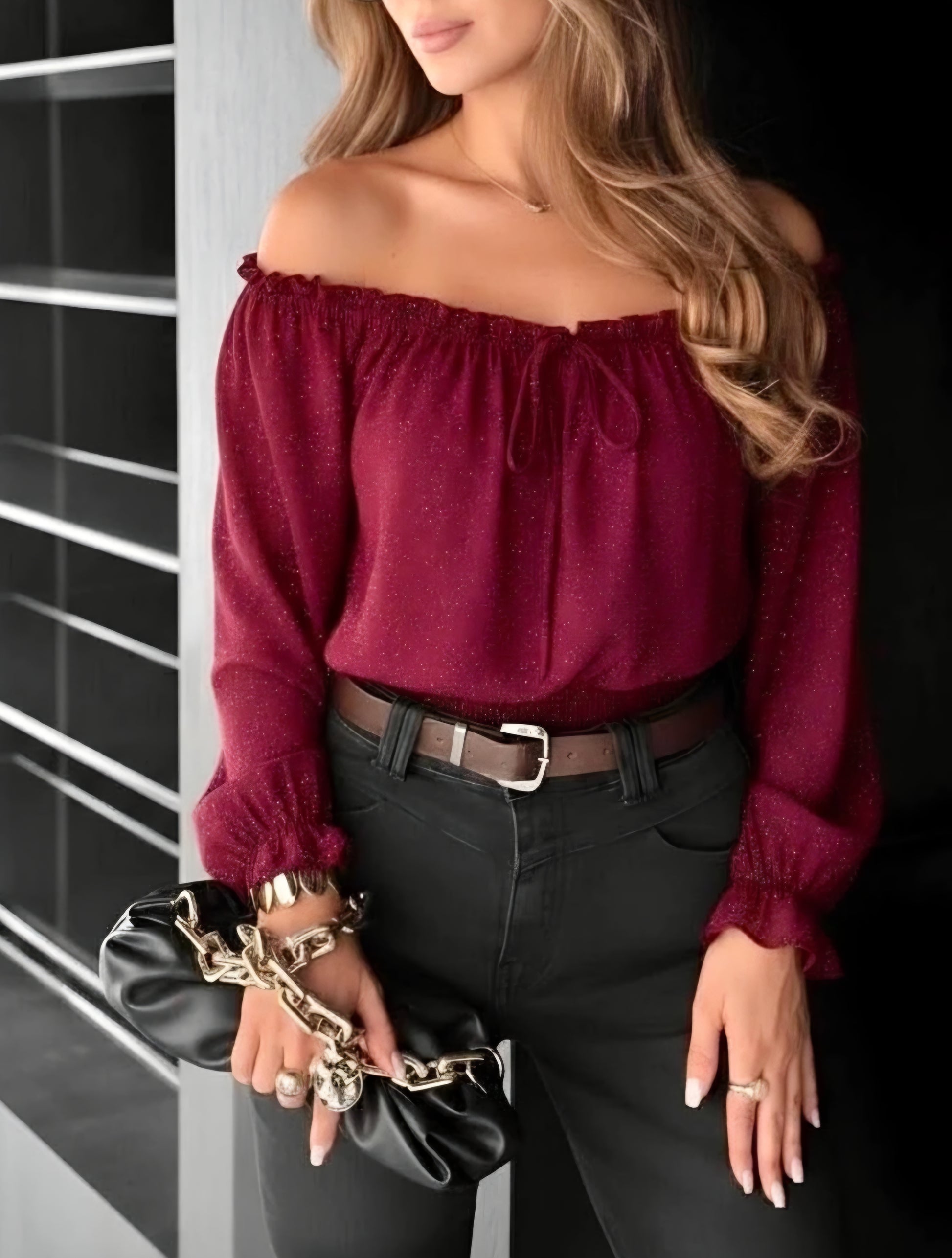 Böljande chiffongtopp, bara axlar, med små glittriga detaljer för en elegant och lysande look. Justerbar resår i halsringningen med knytband, långa, lätt puffärmar med volang. Smockad nederkant för perfekt stöd och en smickrande skärning. Perfekt för eleganta looks, utflykter och kvällar.