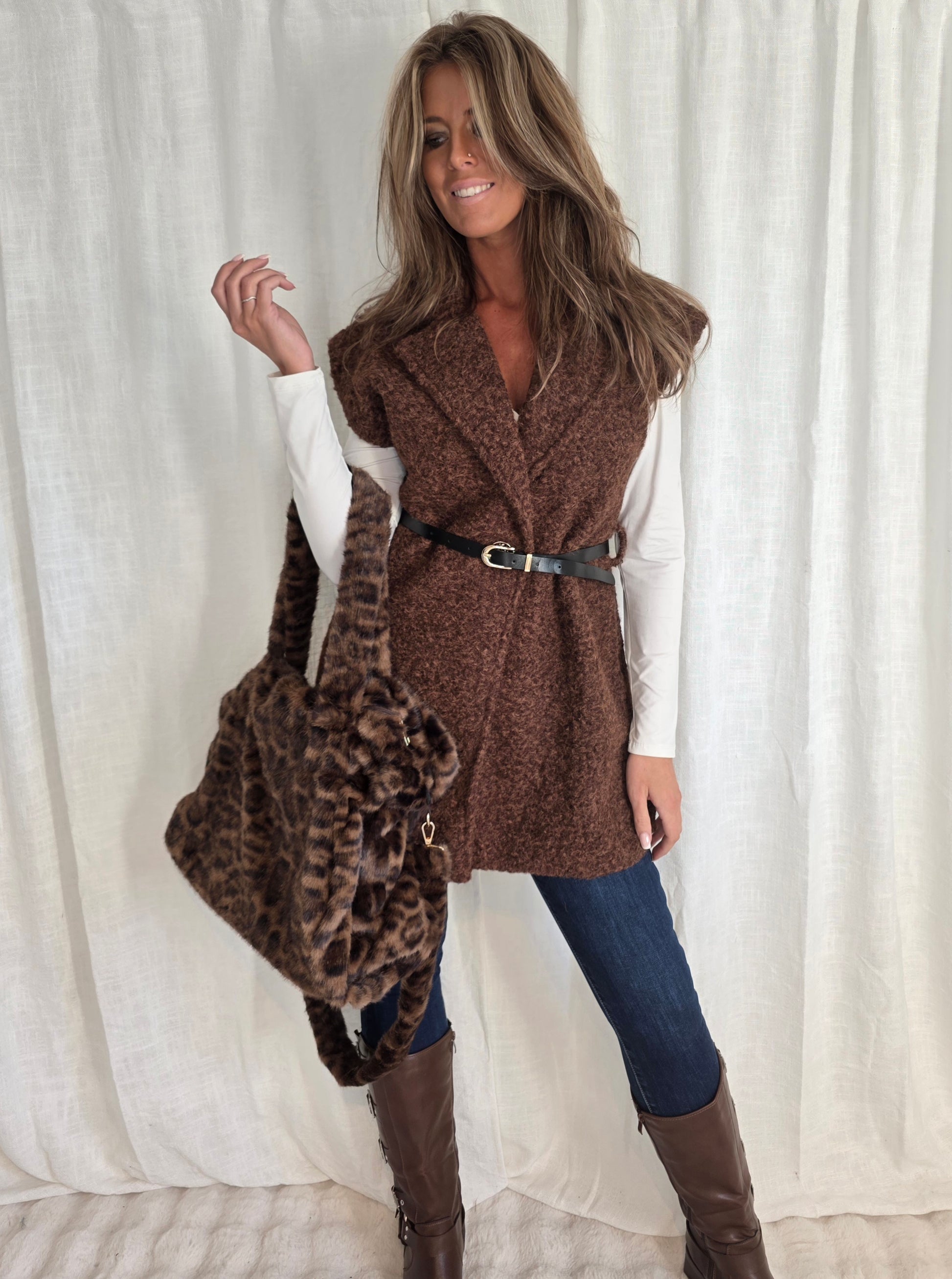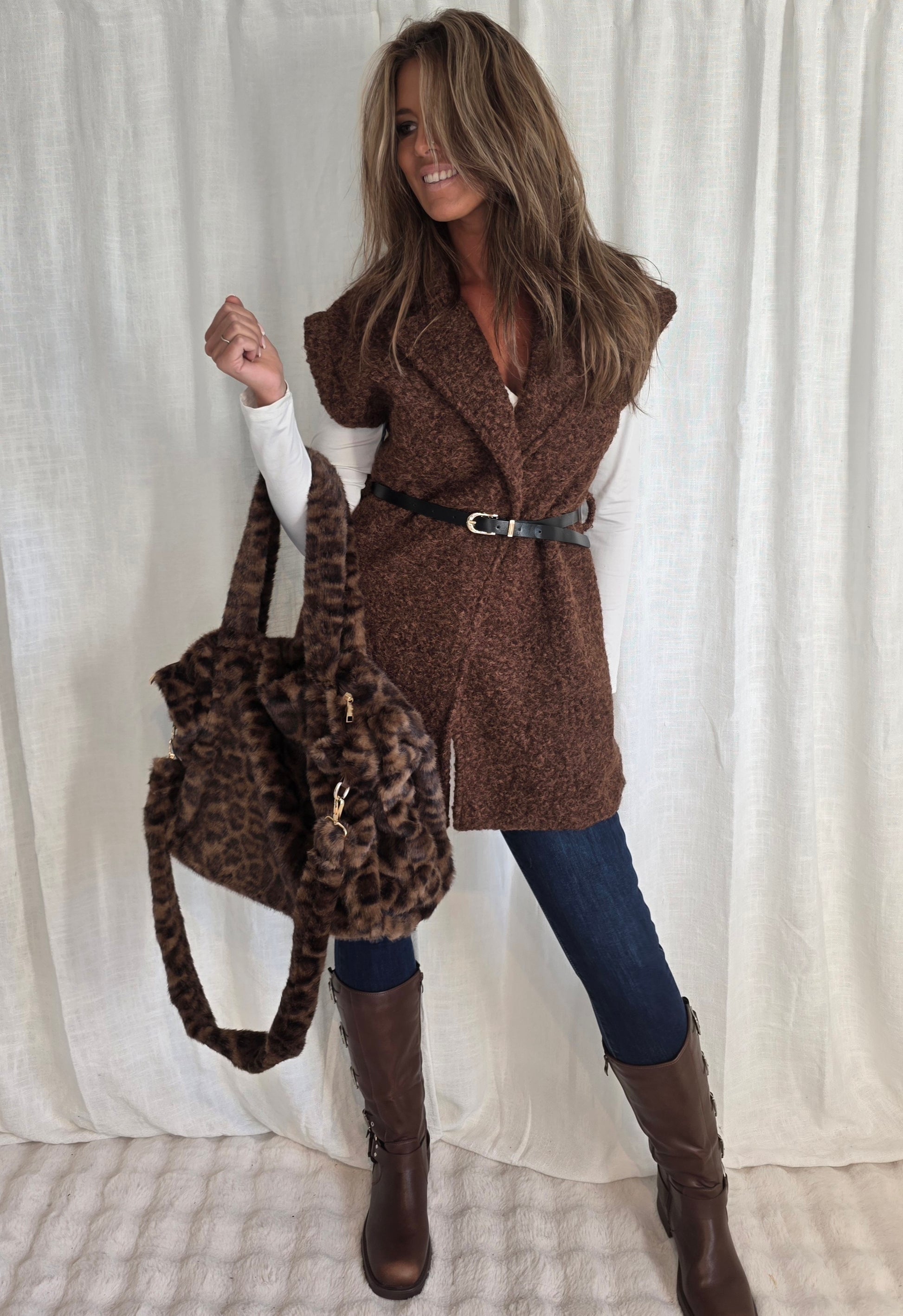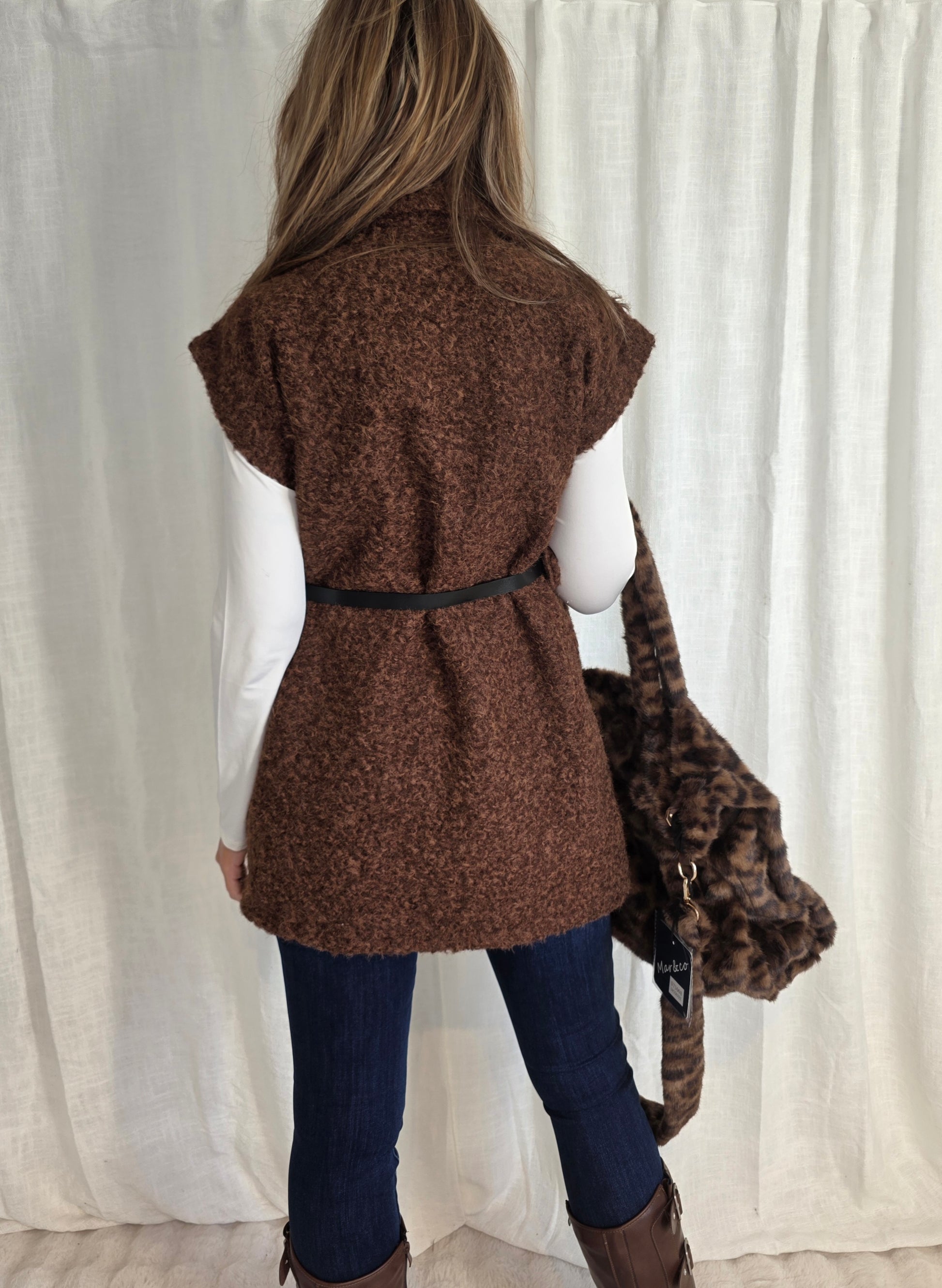 En långärmad väst tillverkad av varm, texturerad boucléull. Dess skräddarsydda krage och överdimensionerade passform ger elegans och modernitet, medan det smala bältet framhäver midjan. Perfekt att bära över en tröja eller skjorta för en elegant och trendig mellansäsongslook.