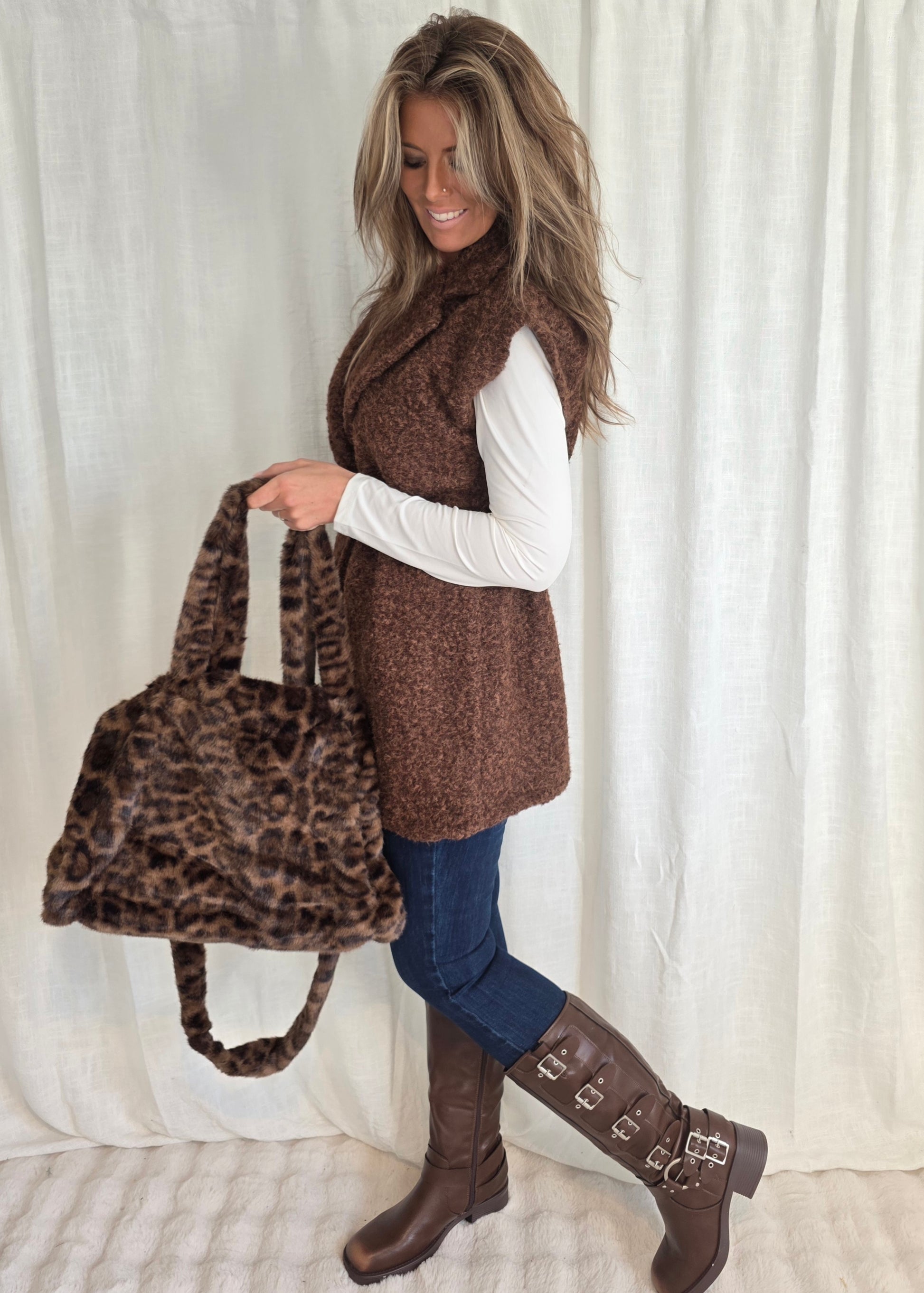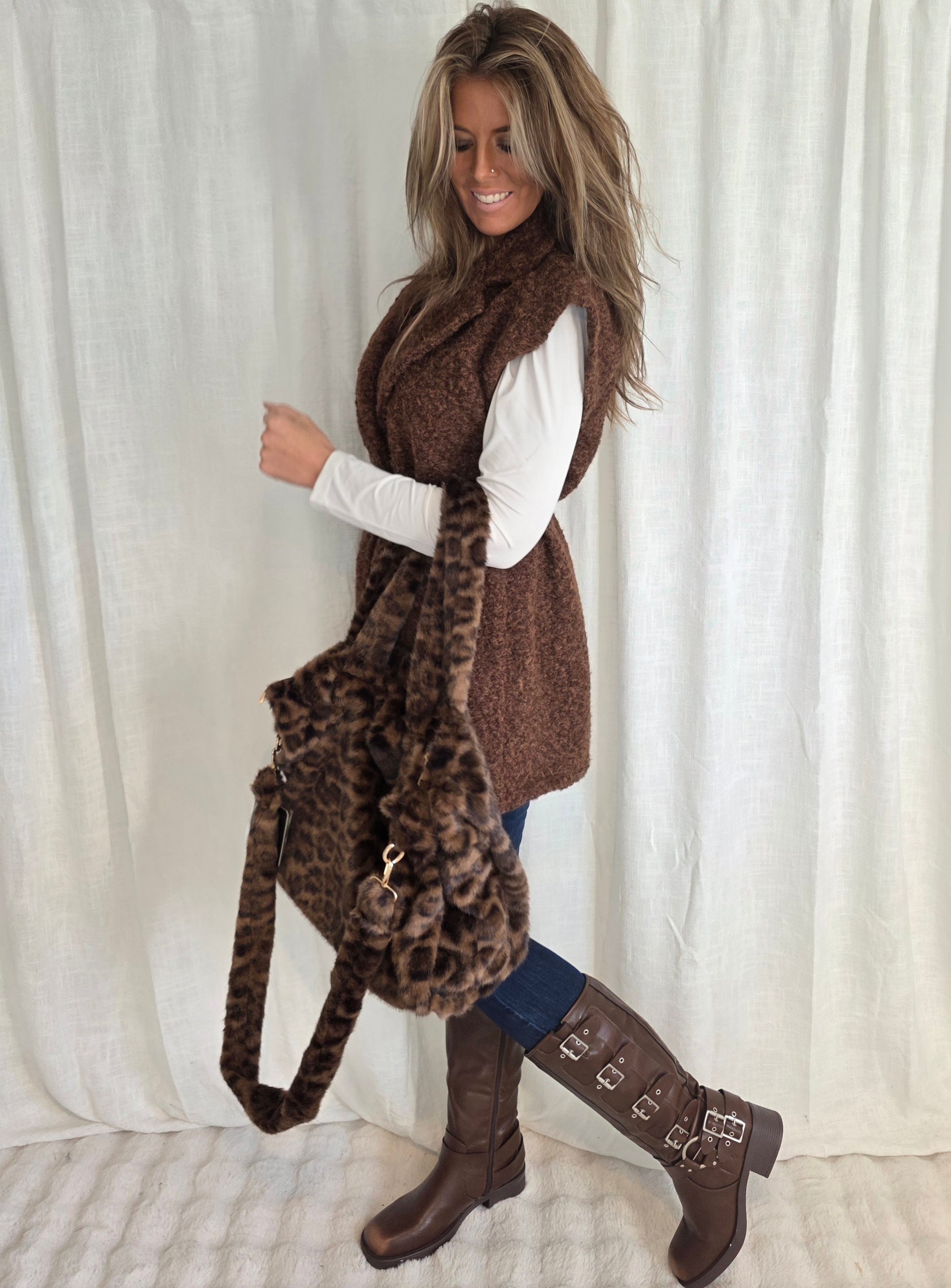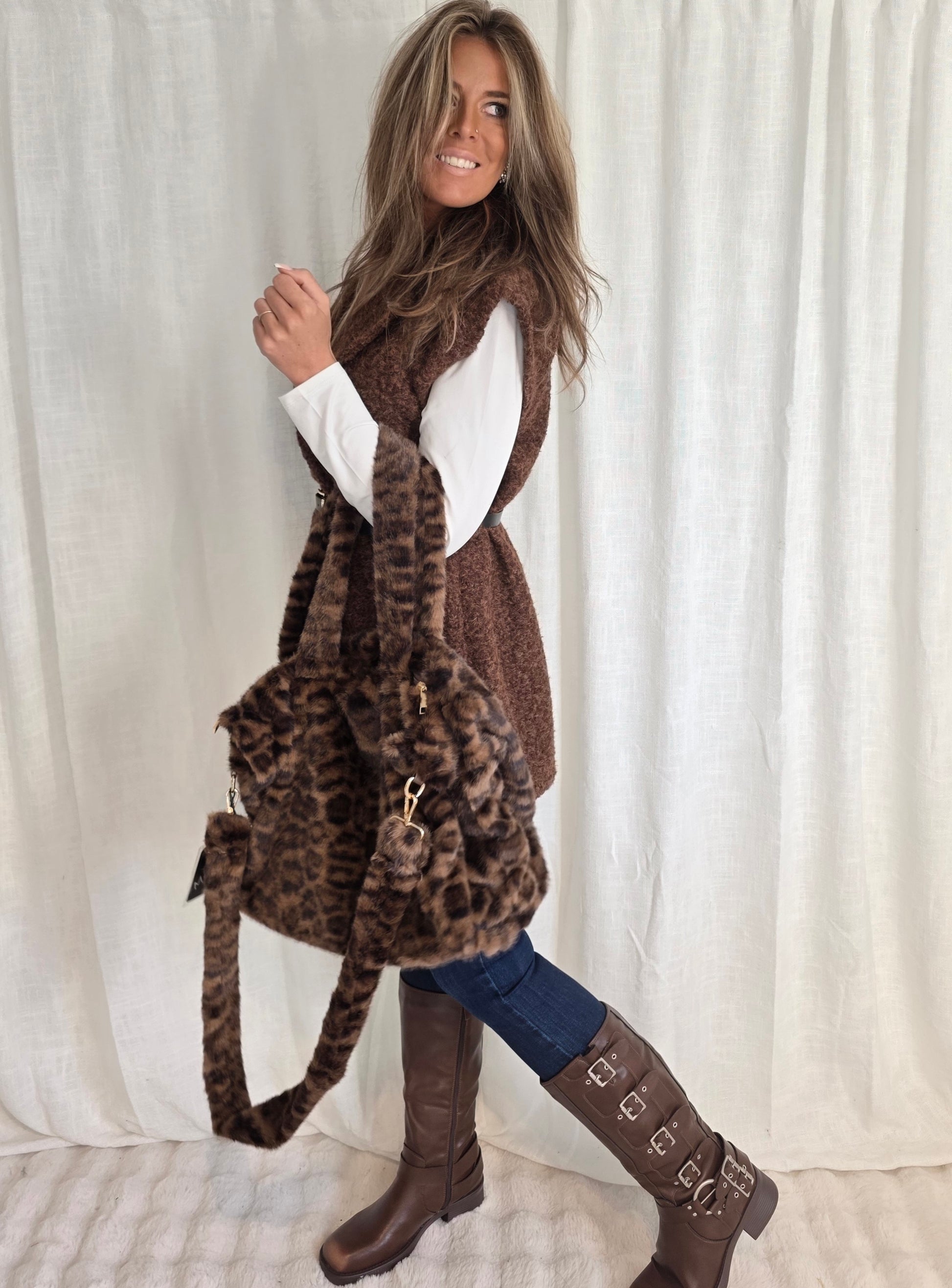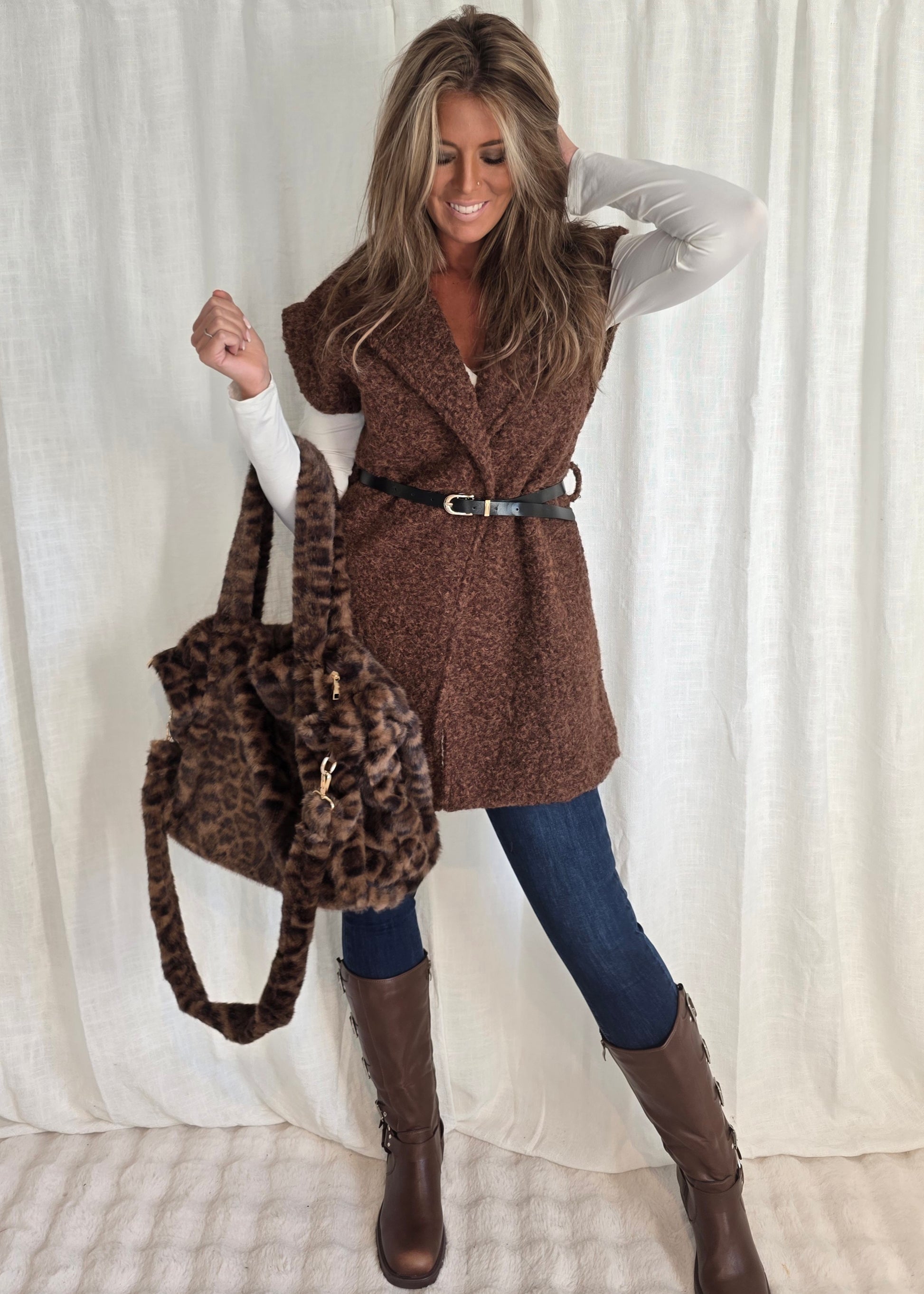 En långärmad väst tillverkad av varm, texturerad boucléull. Dess skräddarsydda krage och överdimensionerade passform ger elegans och modernitet, medan det smala bältet framhäver midjan. Perfekt att bära över en tröja eller skjorta för en elegant och trendig mellansäsongslook.