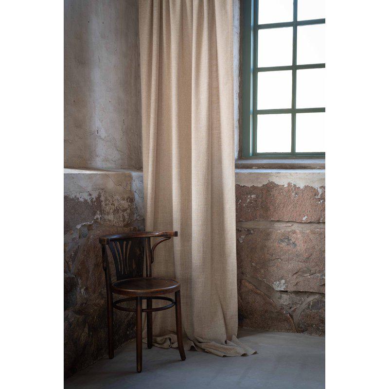 En elegant gardin med ett exklusivt utseende, tillverkad av ett tyg som ger ett tungt och vackert fall. Materialets mjuka tyngd skapar ett lyxigt och flytande uttryck som ramar in fönstret på ett stilfullt sätt.