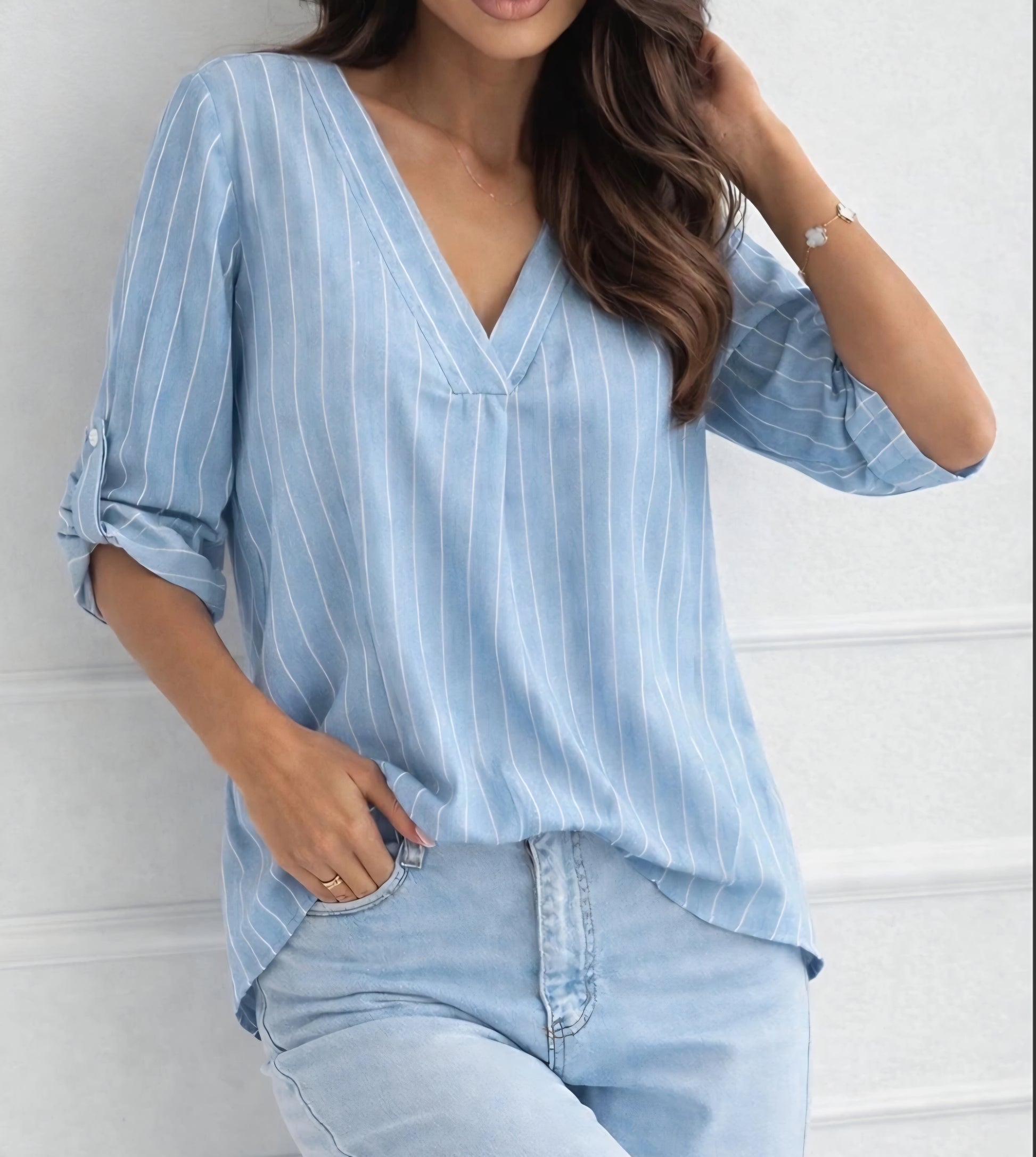 Randig blus i bomull med V-ringning Ljusblå