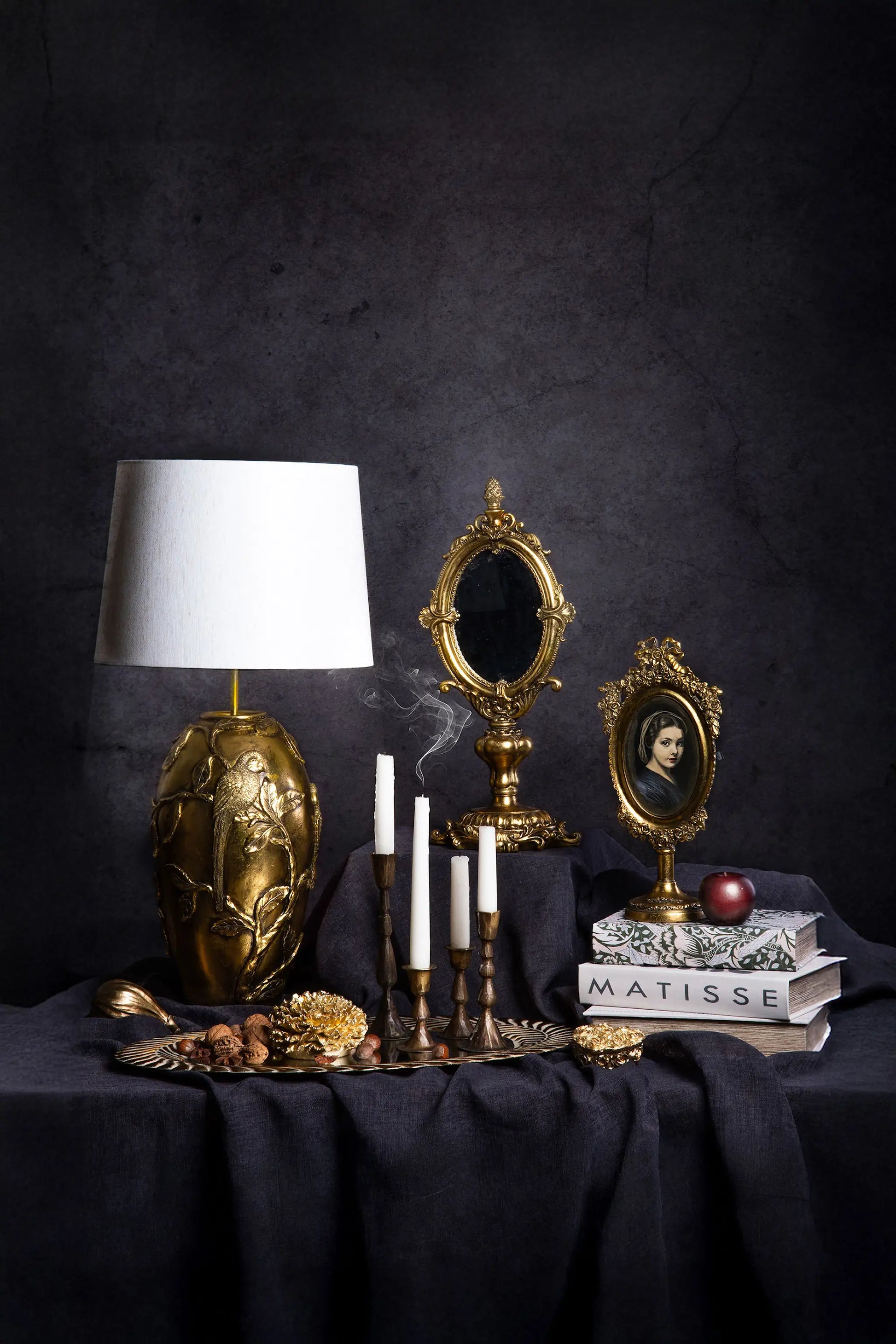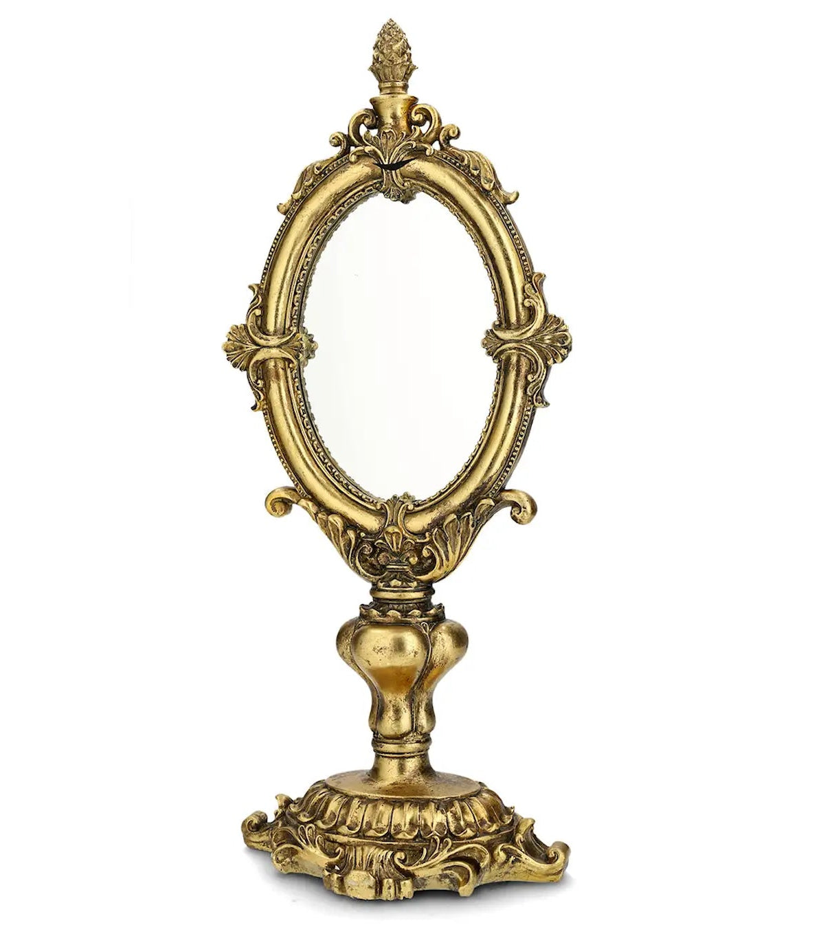 Vackert utsmyckad spegel på fot som är perfekt att ha på byrån eller i fönstret. Tillverkad i poly och spegelglas. 48 cm