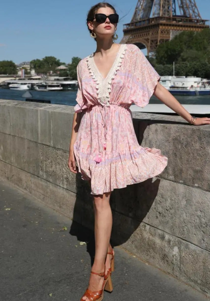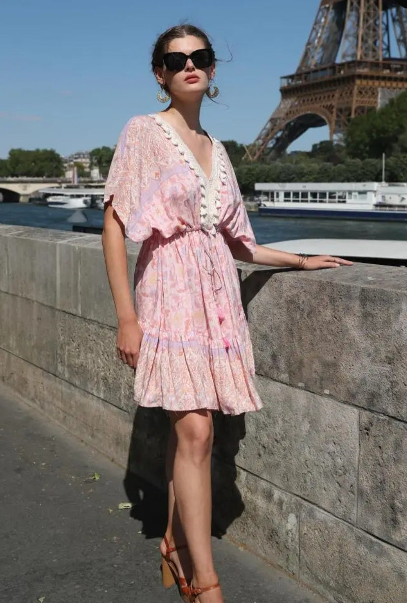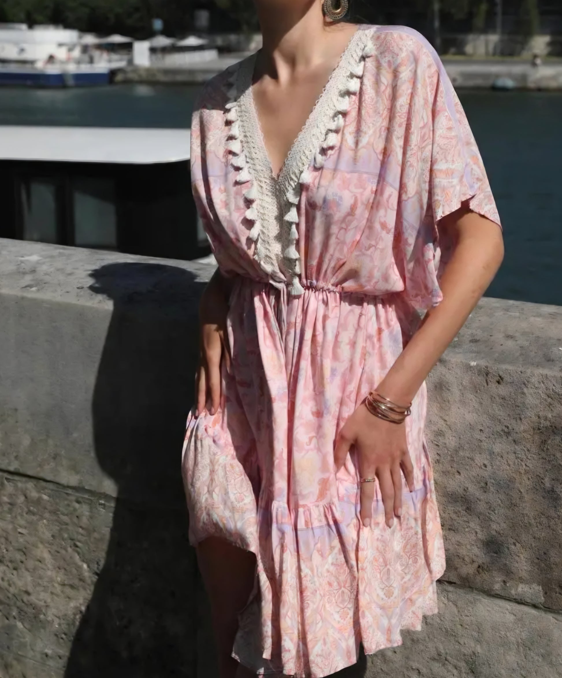 Mellanlång klänning broderad med snäckskal, åtsittande med klockor i midjan, modellen bär storlek S/M, längd: 90 cm