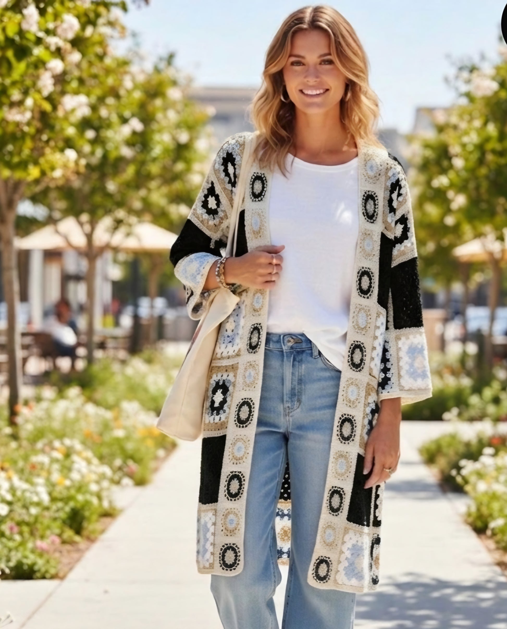 Lång, virkad kofta i lapptäcke med bohemisk chic-stil, med öppna rutor i mjuka nyanser. Dess hantverksmässiga hantverk framhäver olika geometriska och blommiga mönster, noggrant sammansatta för en autentisk och strålande look.