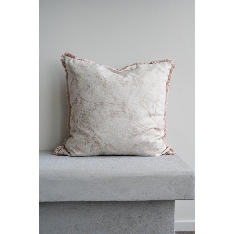 Elegant kuddfodral med ett lugnande ton-i-ton-mönster, där ett linnefärgat blom- och lövmönster skapar en harmonisk och naturlig känsla. Kuddfodralet är utsmyckat med en delikat och dekorativ frans runtom, vilket förstärker designen och tillför en sofistikerad detalj.