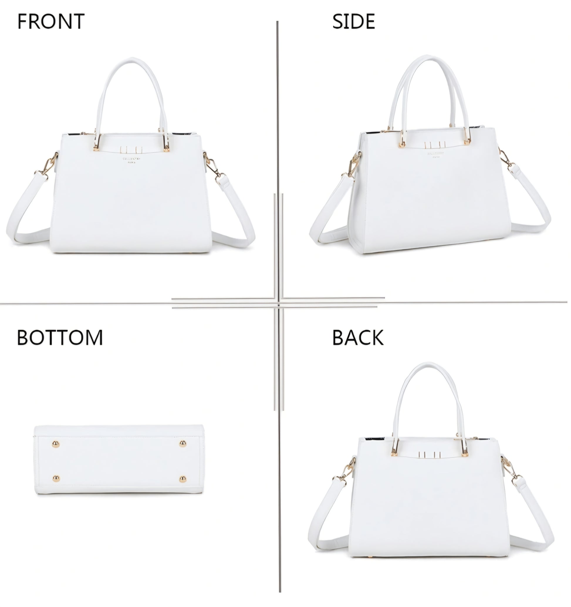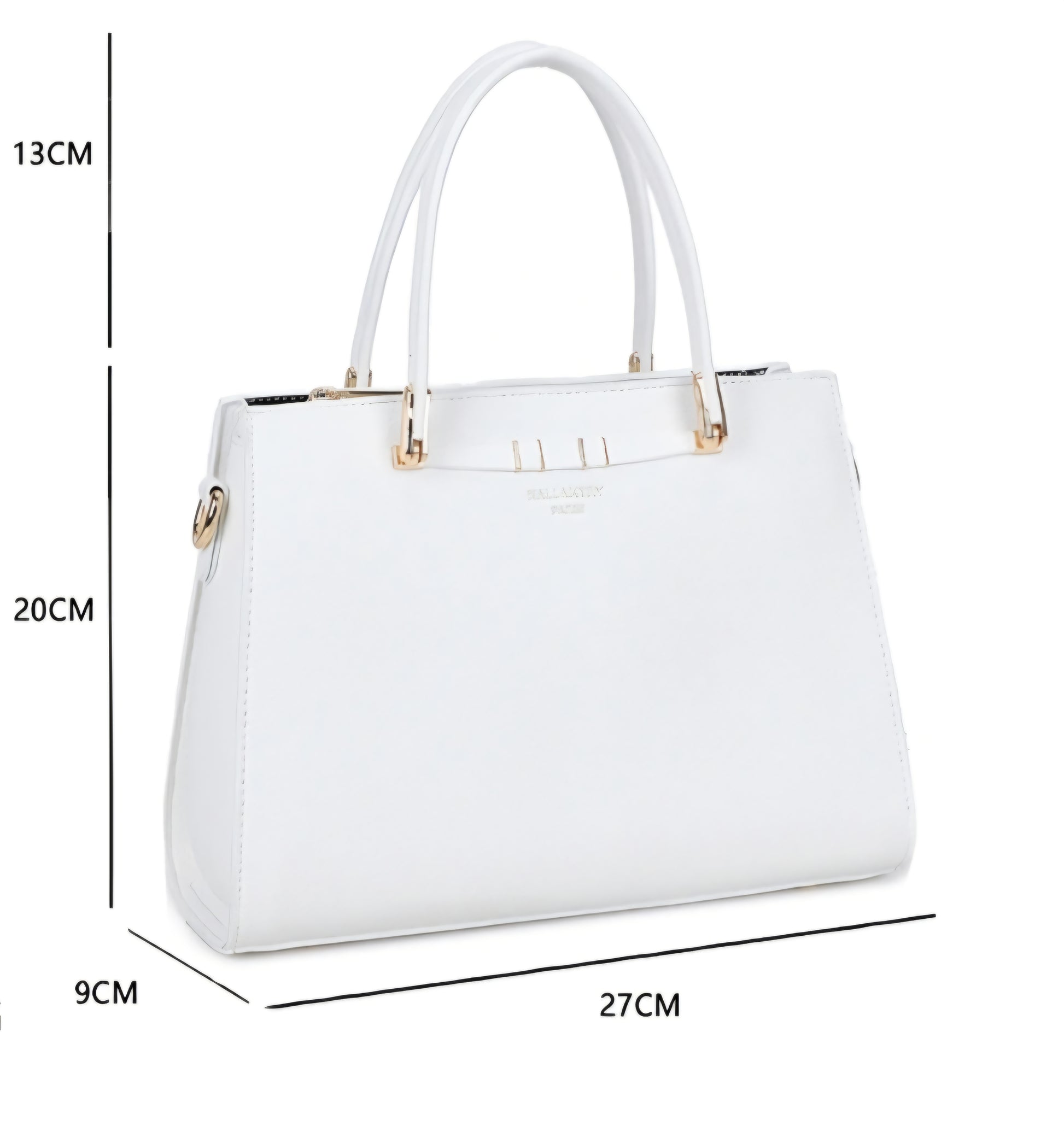 Denna handväska kombinerar elegans och praktiskhet för att följa med stil alla dina dagar. Dess strukturerade och moderna design förstärks av gyllene metalliska ytor som ger en raffinerad och feminin touch. Med sina två robusta handtag och avtagbara axelrem kan den bäras i handen eller över axeln beroende på dina önskemål.
