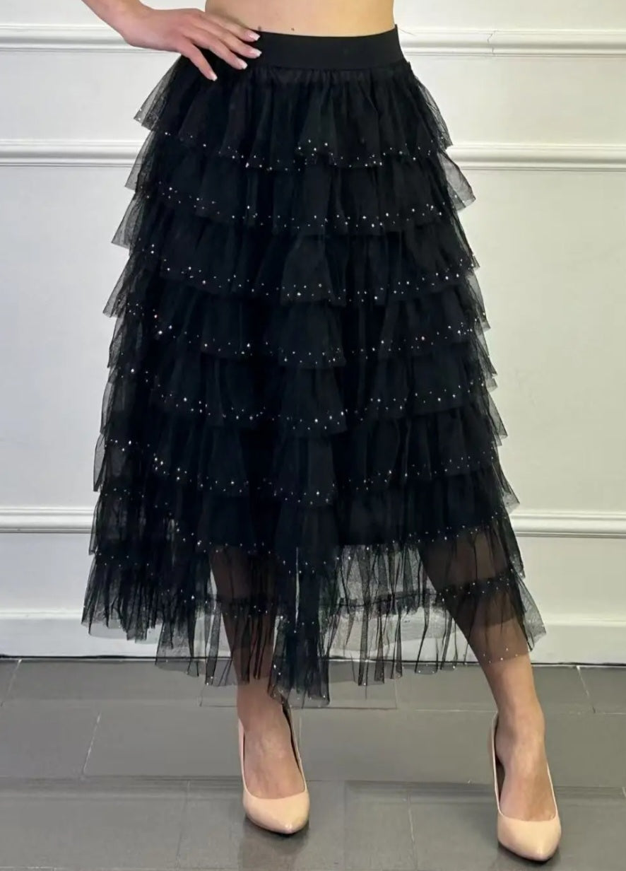 Kjol tillverkad av svart tyll med flerskiktad volangdesign, utsmyckad med mikroglitter eller små spridda paljetter. Midilängden är mångsidig, medan midjebandet är slätt och åtsittande.