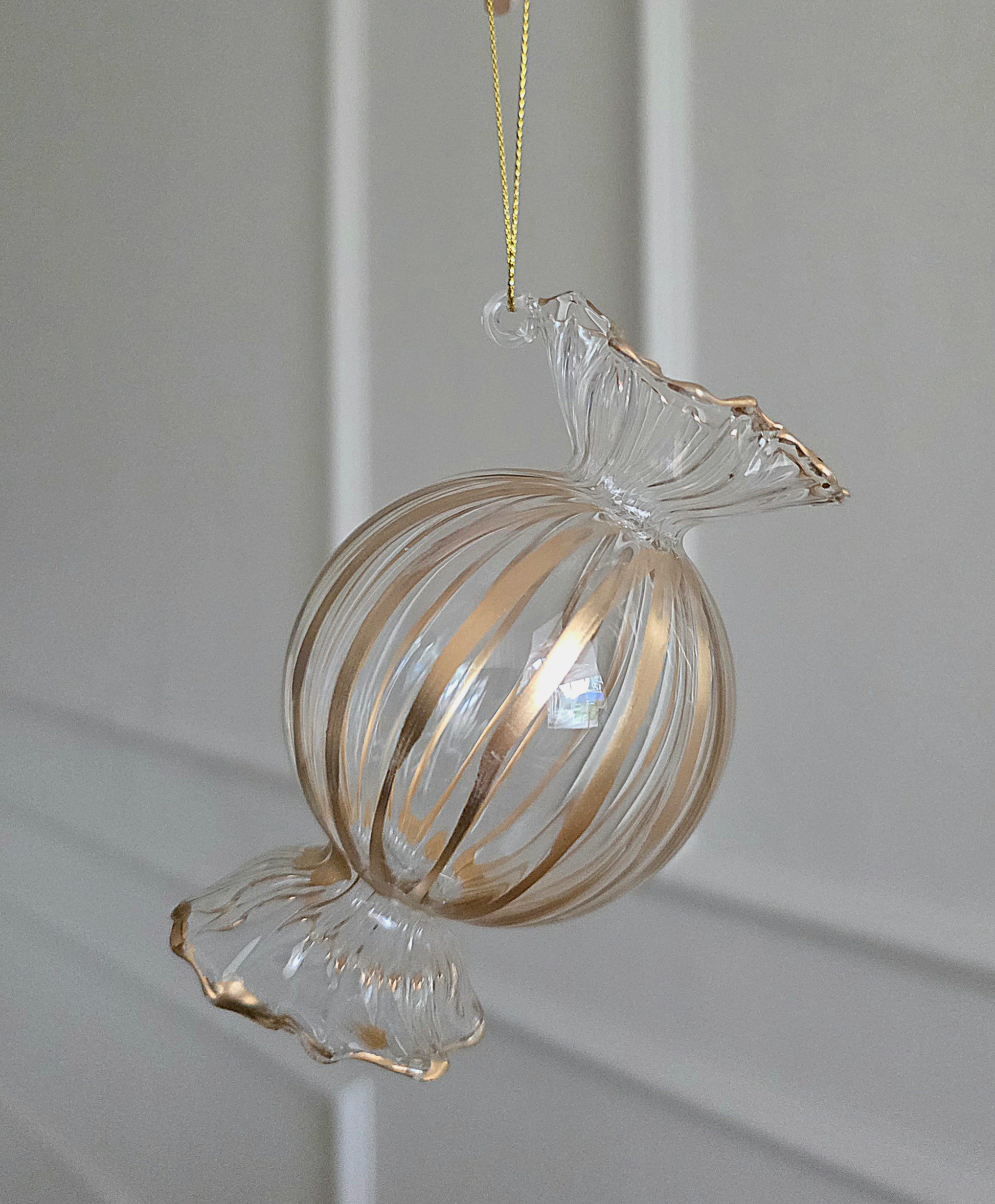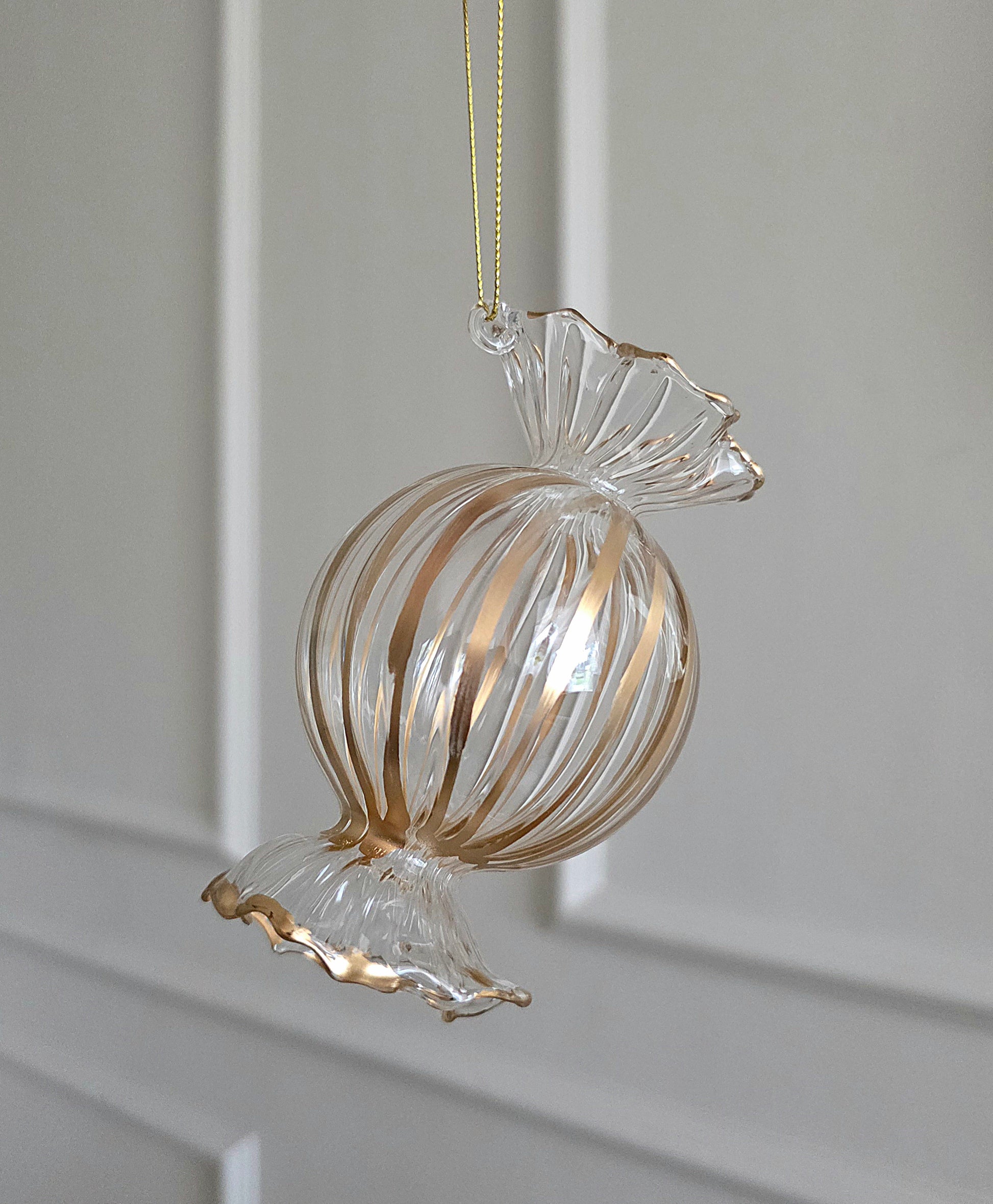 Klä julgranen eller dekorera ett blomsterarrangemang med en hängande dekoration som ser ut som karameller. Tillverkad av glas.