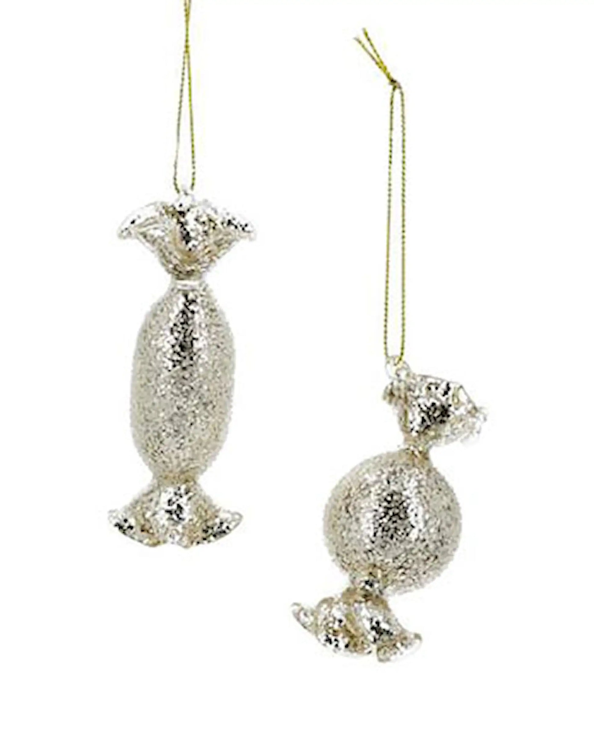 Klä julgranen eller dekorera ett blomsterarrangemang med en hängande dekoration som ser ut som karameller. Tillverkad av glas.