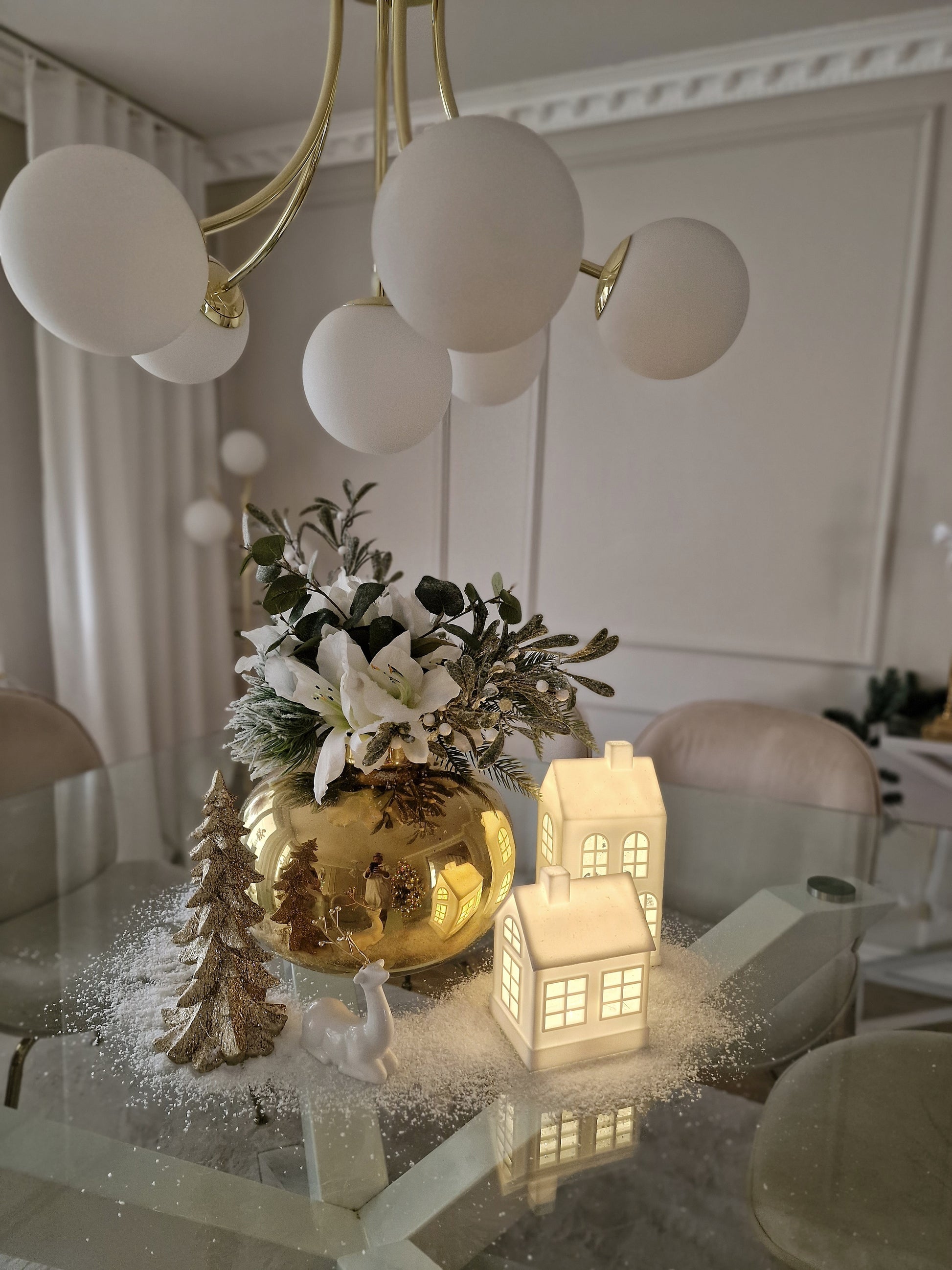 Fantastiskt vitt hus som juldekoration. Det snöar och lyser vackert när produkten är påslagen. Batteri driven med timer funktion. Placera på ett bord eller en hylla för en härlig advents och julstämning.