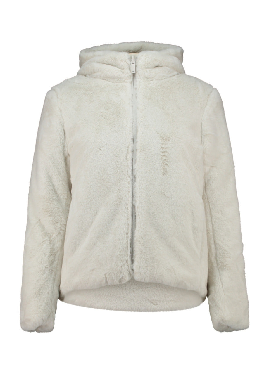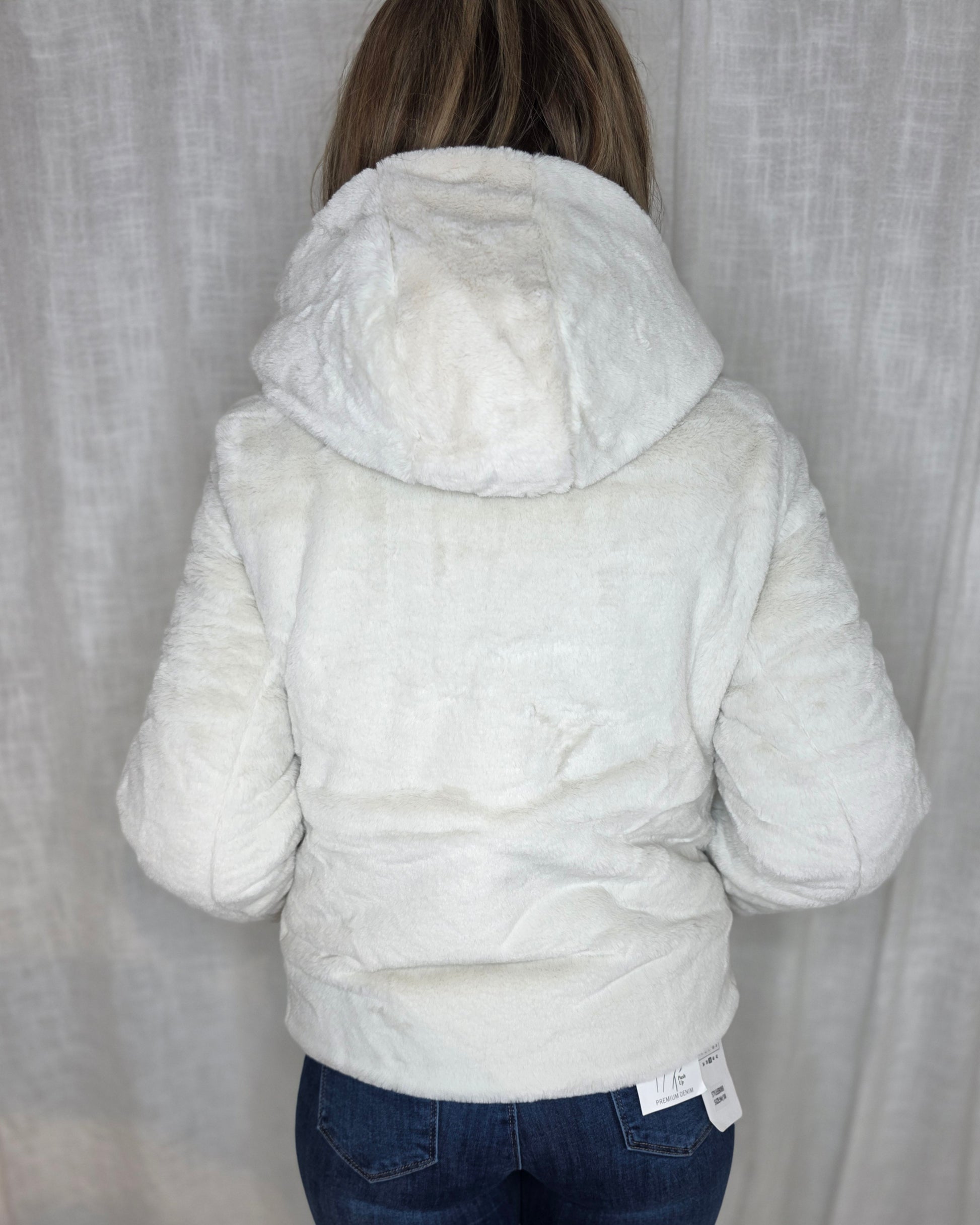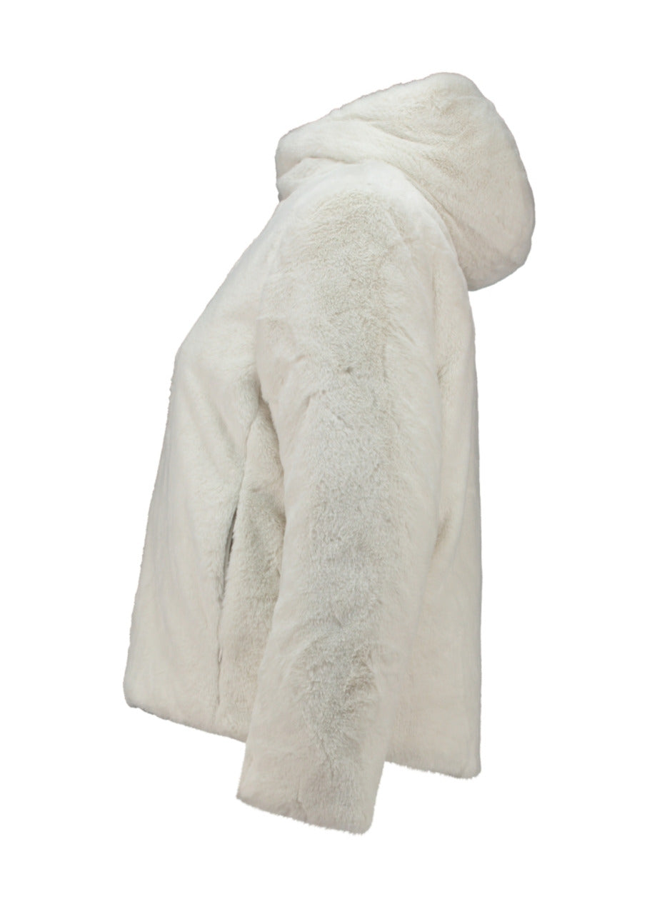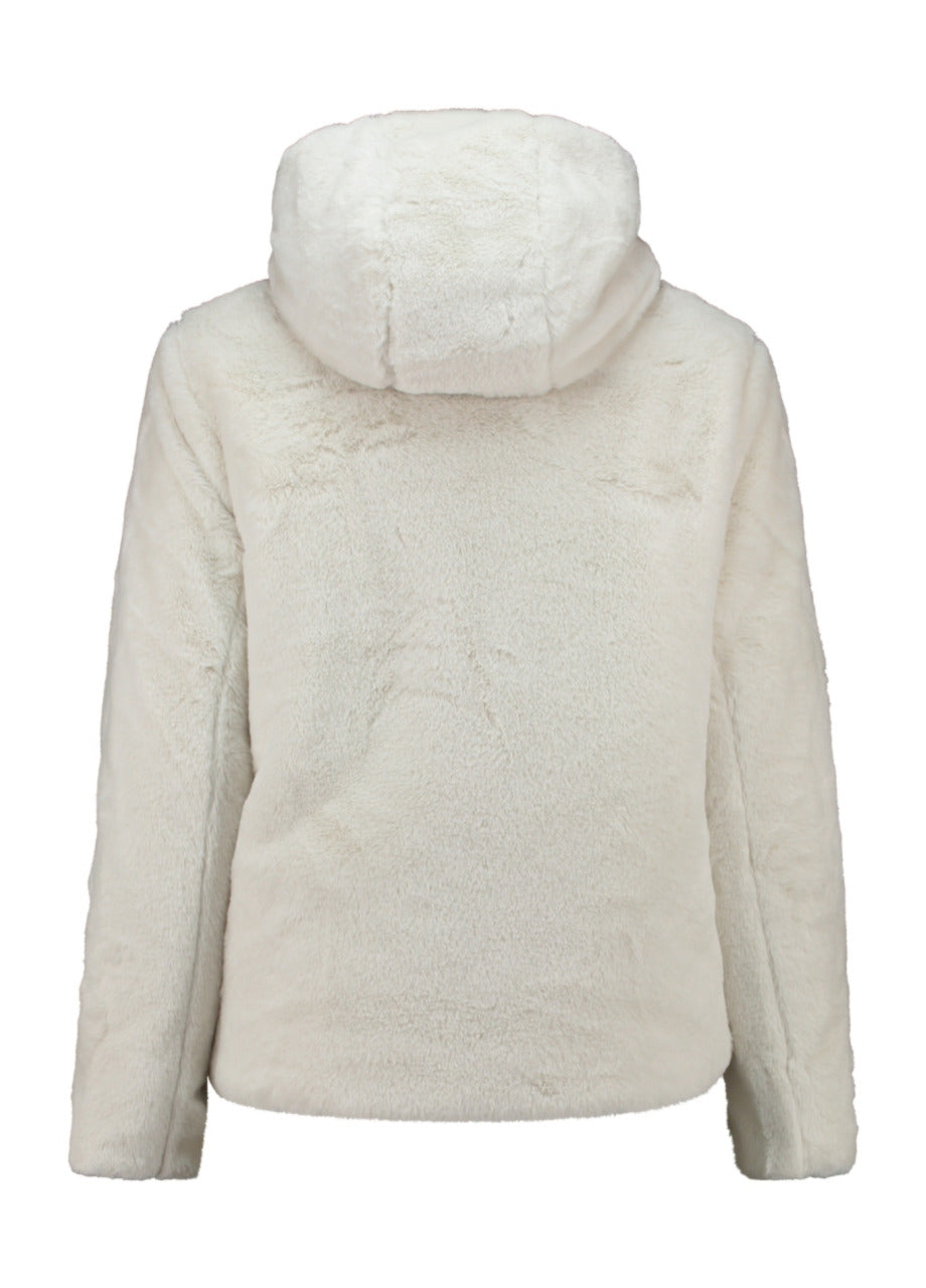 mysig fuskpäls jacka med fickor, dragkedja och luva.