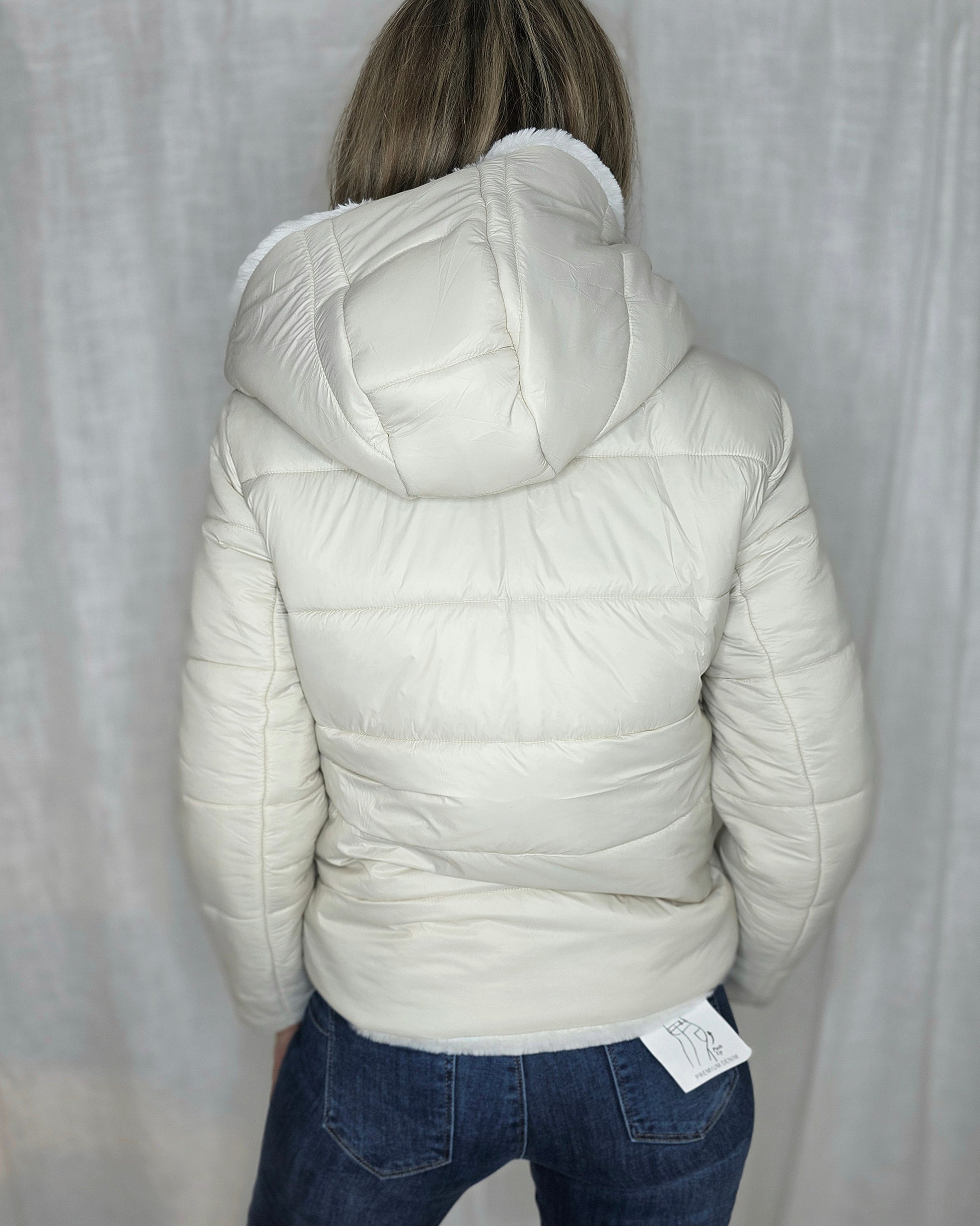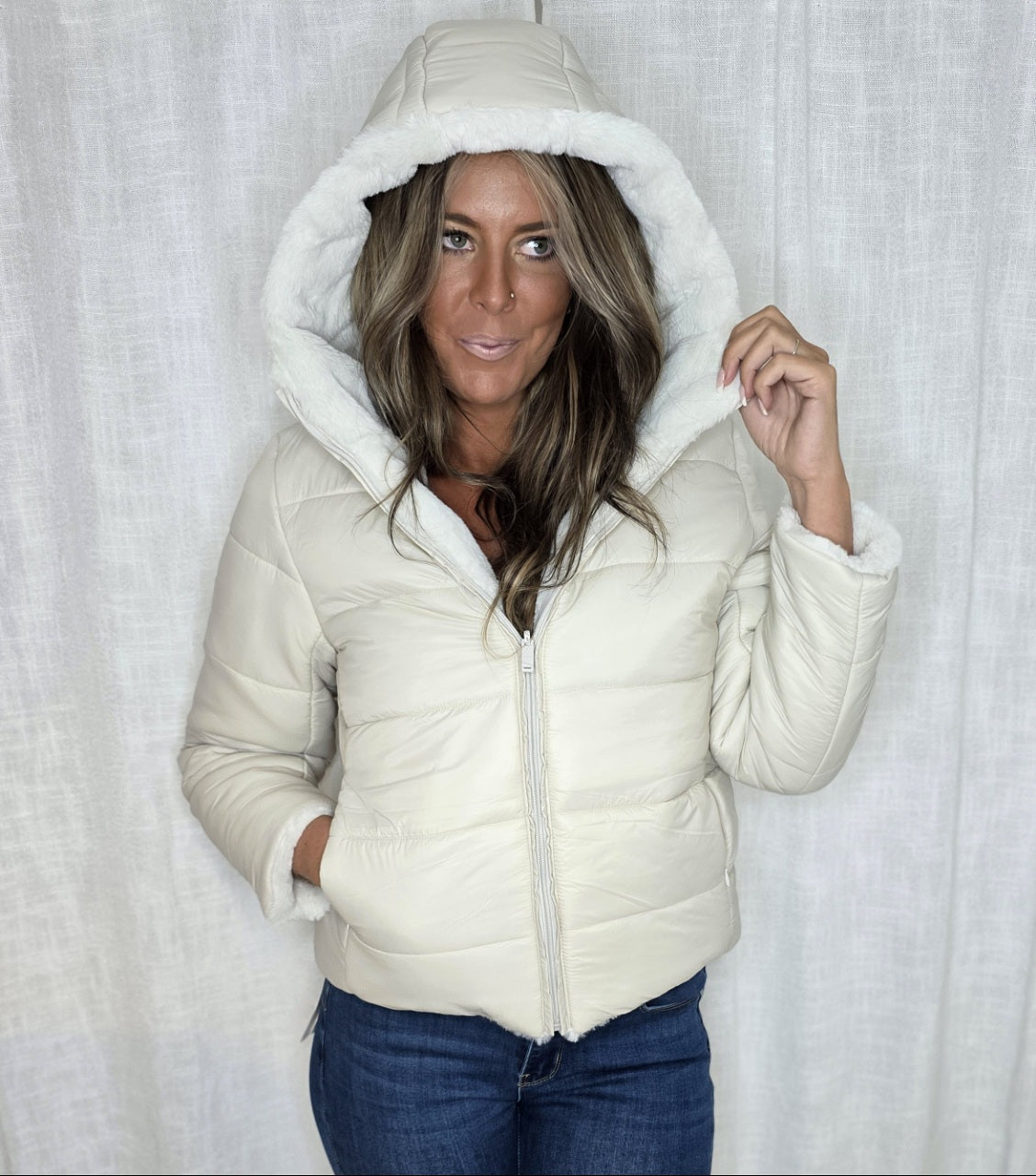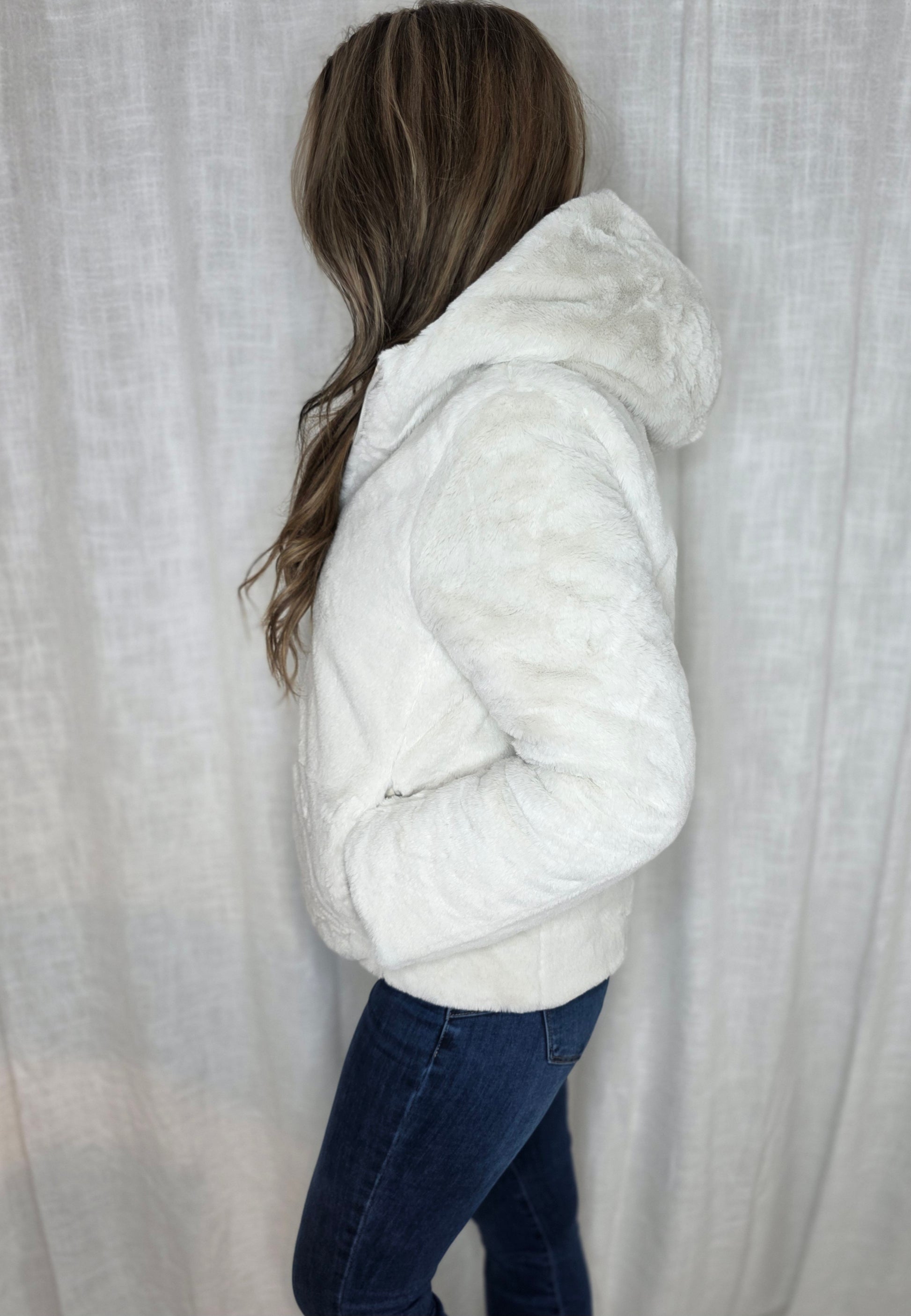 mysig fuskpäls jacka med fickor, dragkedja och luva.