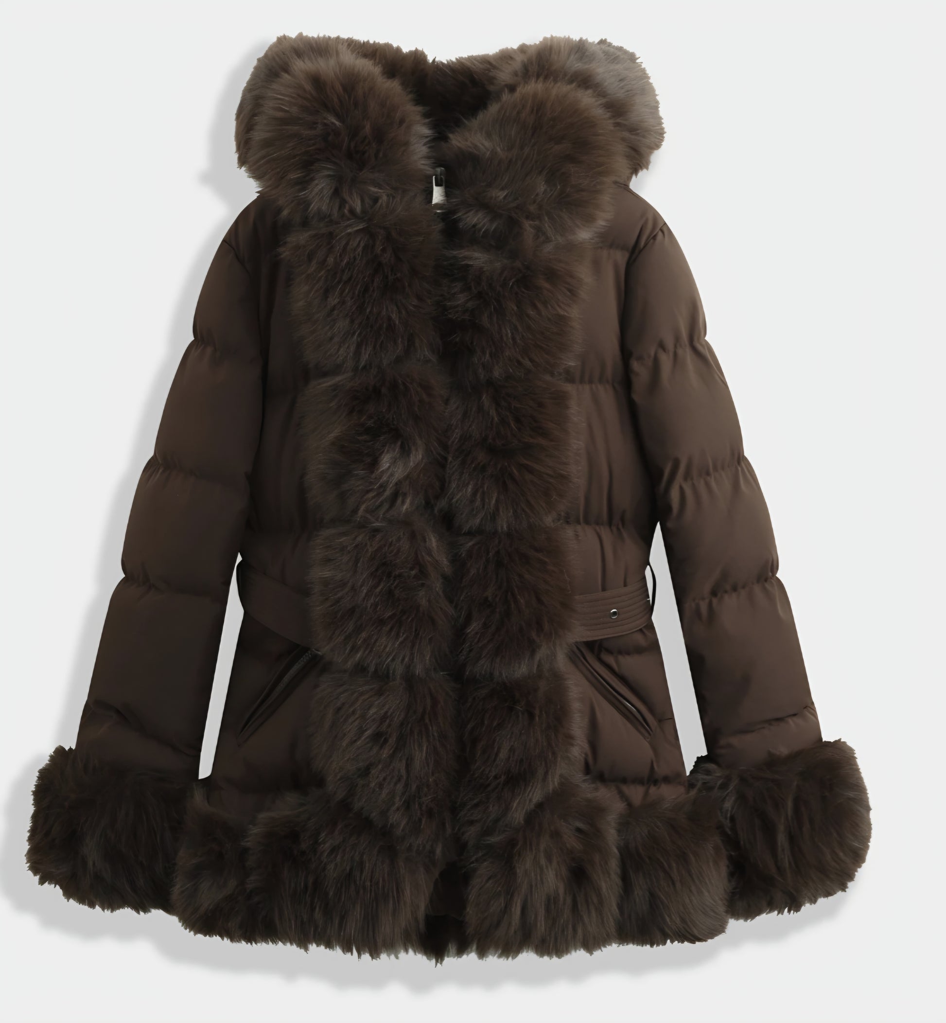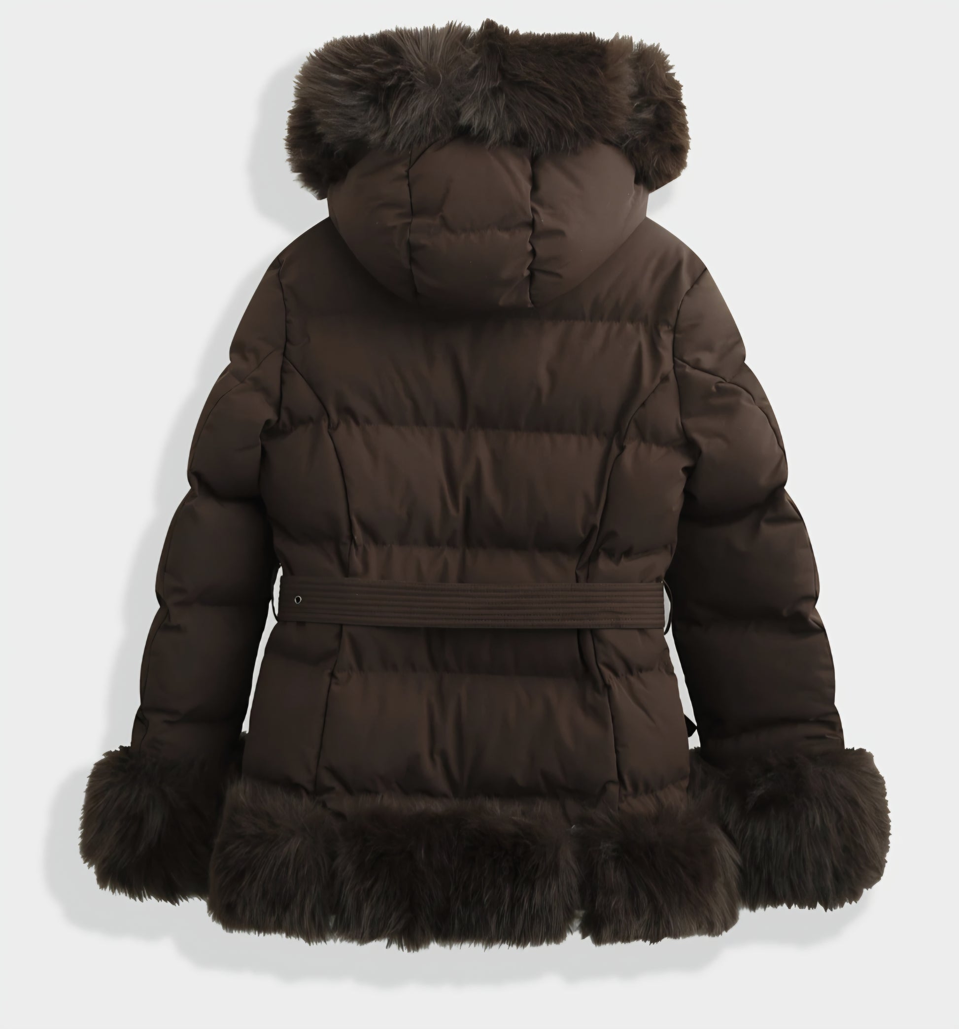 Quiltad pufferjacka med fast huva. Avtagbar fuskpälskant framtill, i huvan, i nederkant och vid ärmslut. Dold dragkedja framtill. Inbyggt bälte med öglor och justering med tryckknapp. Långa ärmar. Dolda sidofickor.