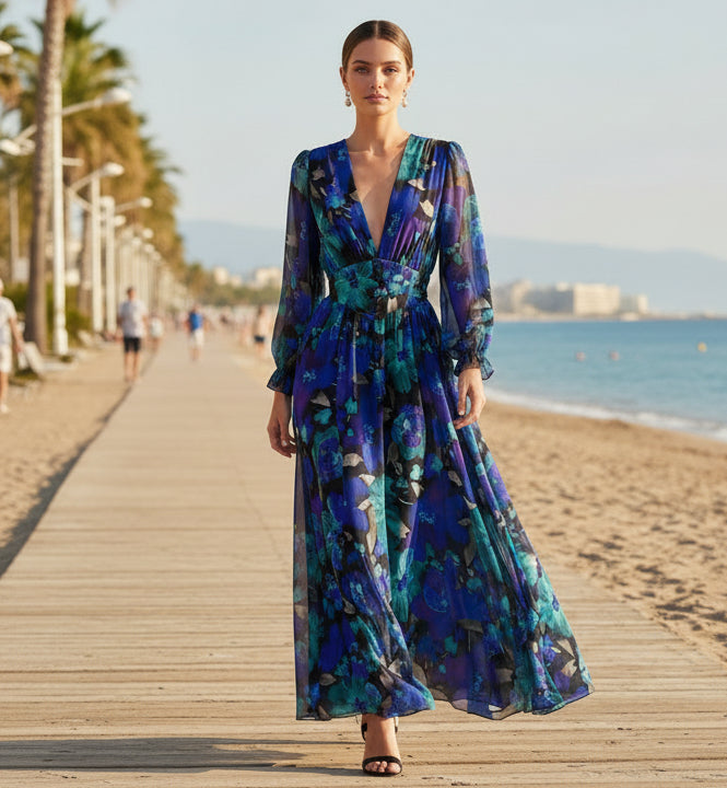 Klänning med långa armar, knappar, resår i ryggen och viskosfoder med slits.