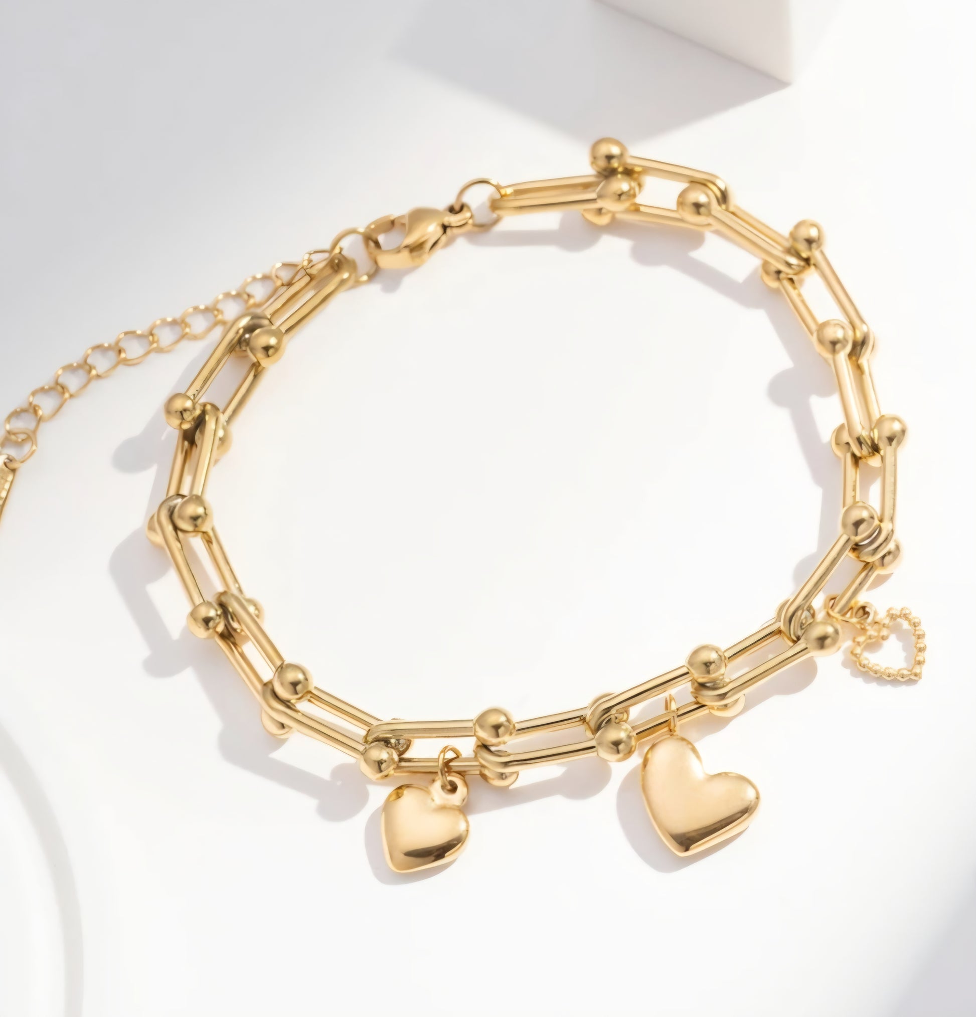 Detta guldfärgade armband i rostfritt stål fängslar med sina avlånga länkar och tre hjärtberlocker – två släta och en med fint pärlor. Som en symbol för kärlek och ömhet lyser det elegant upp handleden. Dess justerbara spänne garanterar perfekt komfort. Slitstarkt, allergivänligt och tidlöst, det kompletterar alla stilar, från romantiska till moderna. Ett raffinerat smycke att ge bort eller unna sig själv, för dig som älskar accessoarer som bär på känslor och ljus.