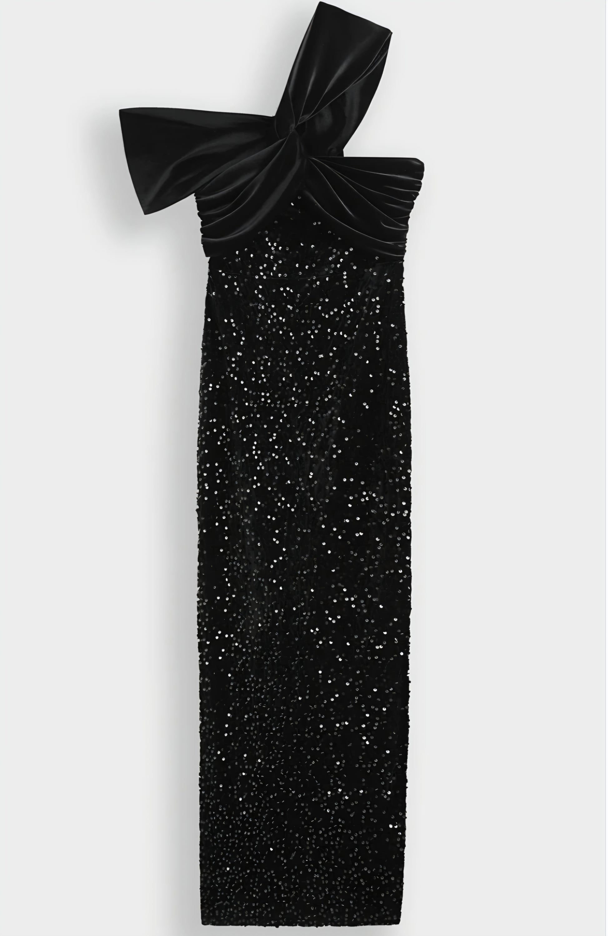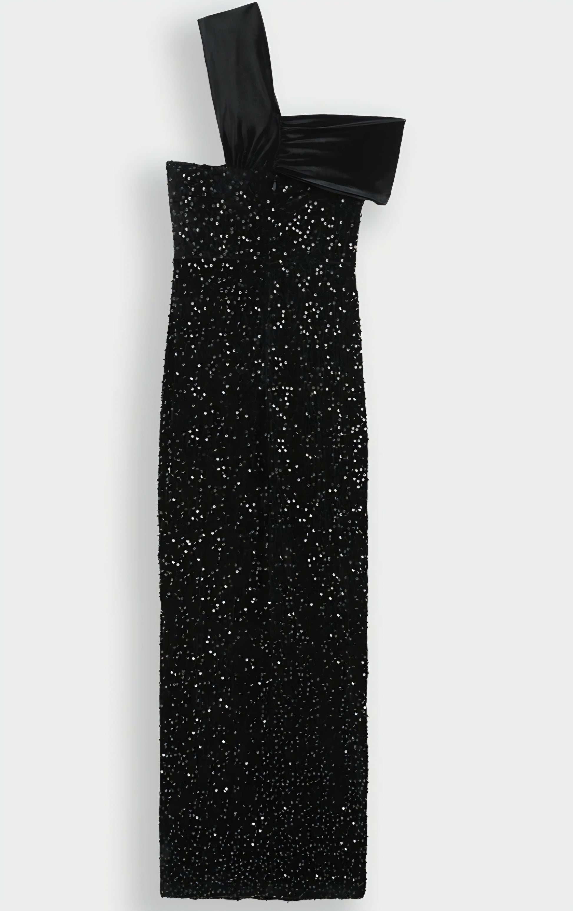 Asymmetrisk långklänning i glittertyg. Draperad halsringning som faller över ena axeln. Slits i sidan. Dold dragkedja i sidsömmen.