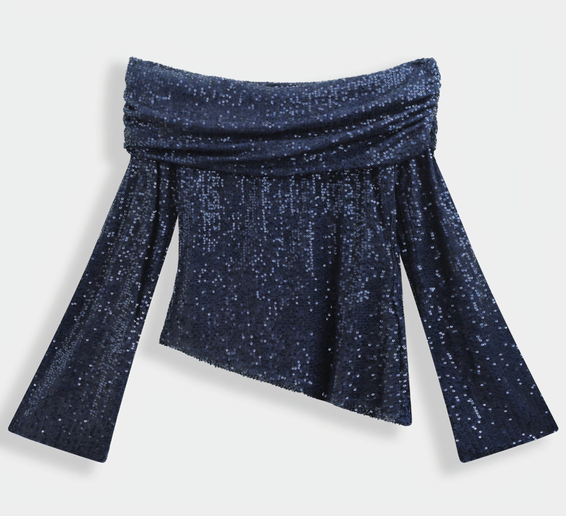 Draperad topp med asymmetrisk nederkant. Utsvängda långa ärmar. Helt tillverkad i glittrigt paljetttyg. Rak passform vid halsringningen.