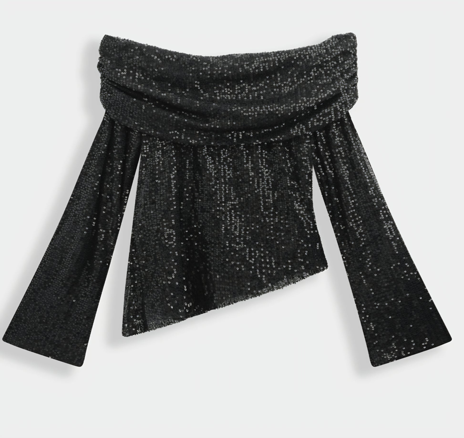 Draperad topp med asymmetrisk nederkant. Utsvängda långa ärmar. Helt tillverkad i glittrigt paljetttyg. Rak passform vid halsringningen.