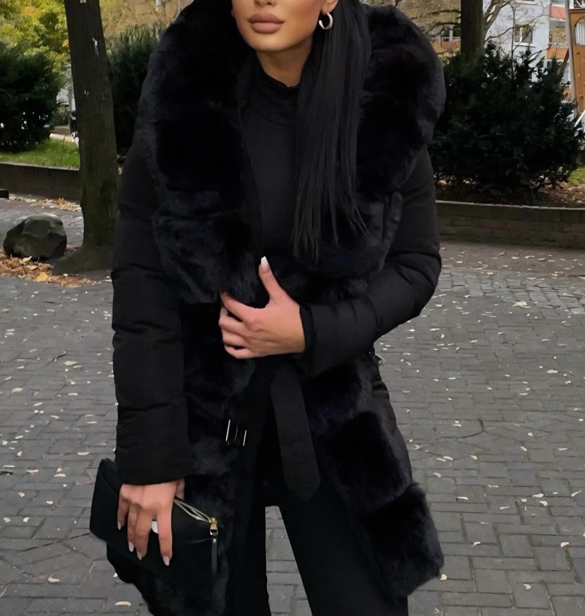 Medellång, åtsittande dunjacka i quiltat tyg. Modell med huva och kant täckt med fuskpälsinlägg runtom och överallt, avtagbar med knappar. Långa ärmar med infällda ärmhål. Muddar med ribbstickning inuti ärmsluten. Trapetsskuren och åtsittande i midjan. Dubbel dragkedja framtill, dold under päls. Snedställda fickor med dragkedjor i sidan. Avtagbart, justerbart ribbat bälte med nitar och spänne. Fodrad inuti. Modellen är 174 cm lång.