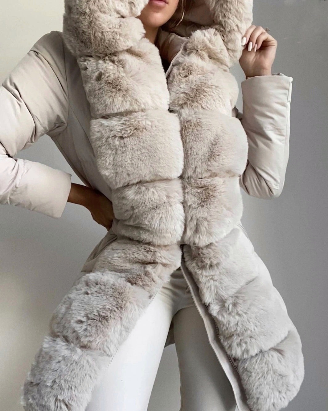 Medellång, åtsittande dunjacka i quiltat tyg. Modell med huva och kant täckt med fuskpälsinlägg runtom och överallt, avtagbar med knappar. Långa ärmar med infällda ärmhål. Muddar med ribbstickning inuti ärmsluten. Trapetsskuren och åtsittande i midjan. Dubbel dragkedja framtill, dold under päls. Snedställda fickor med dragkedjor i sidan. Avtagbart, justerbart ribbat bälte med nitar och spänne. Fodrad inuti. Modellen är 174 cm lång.