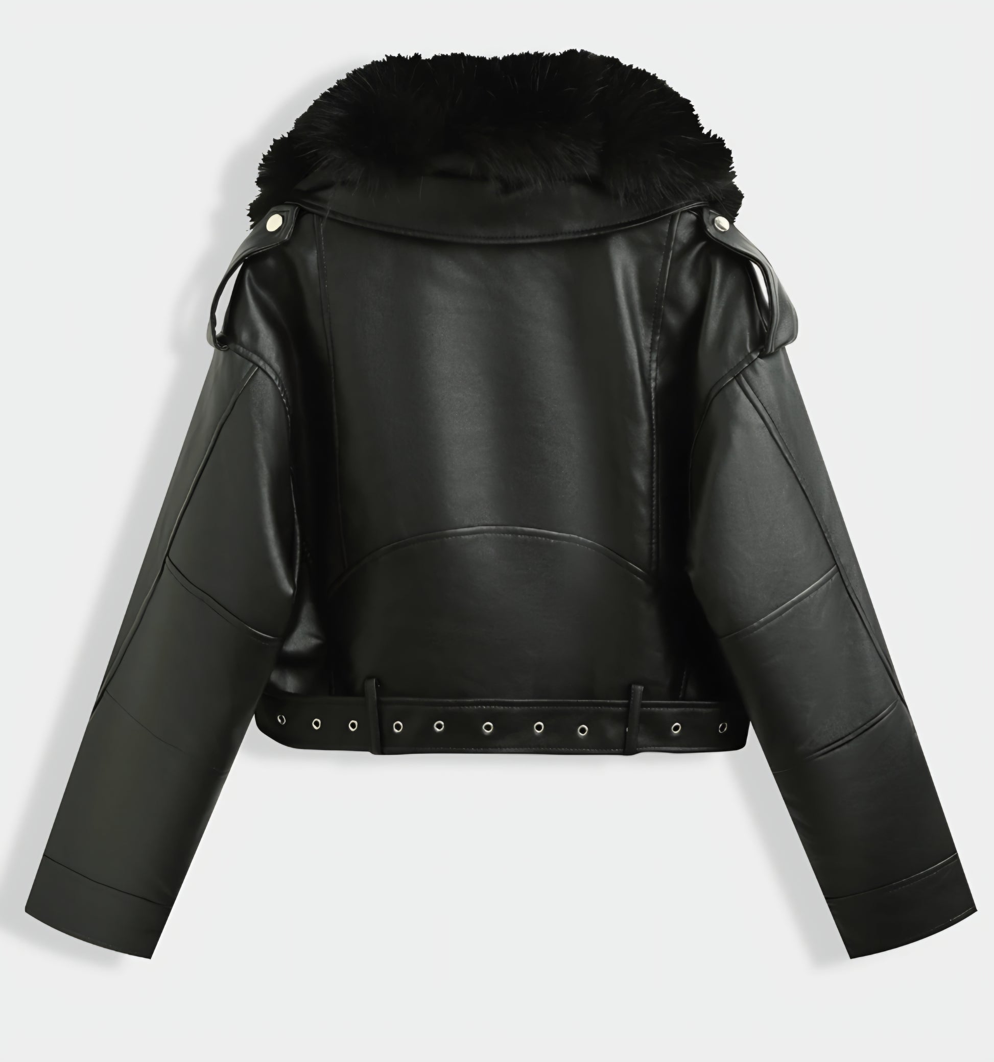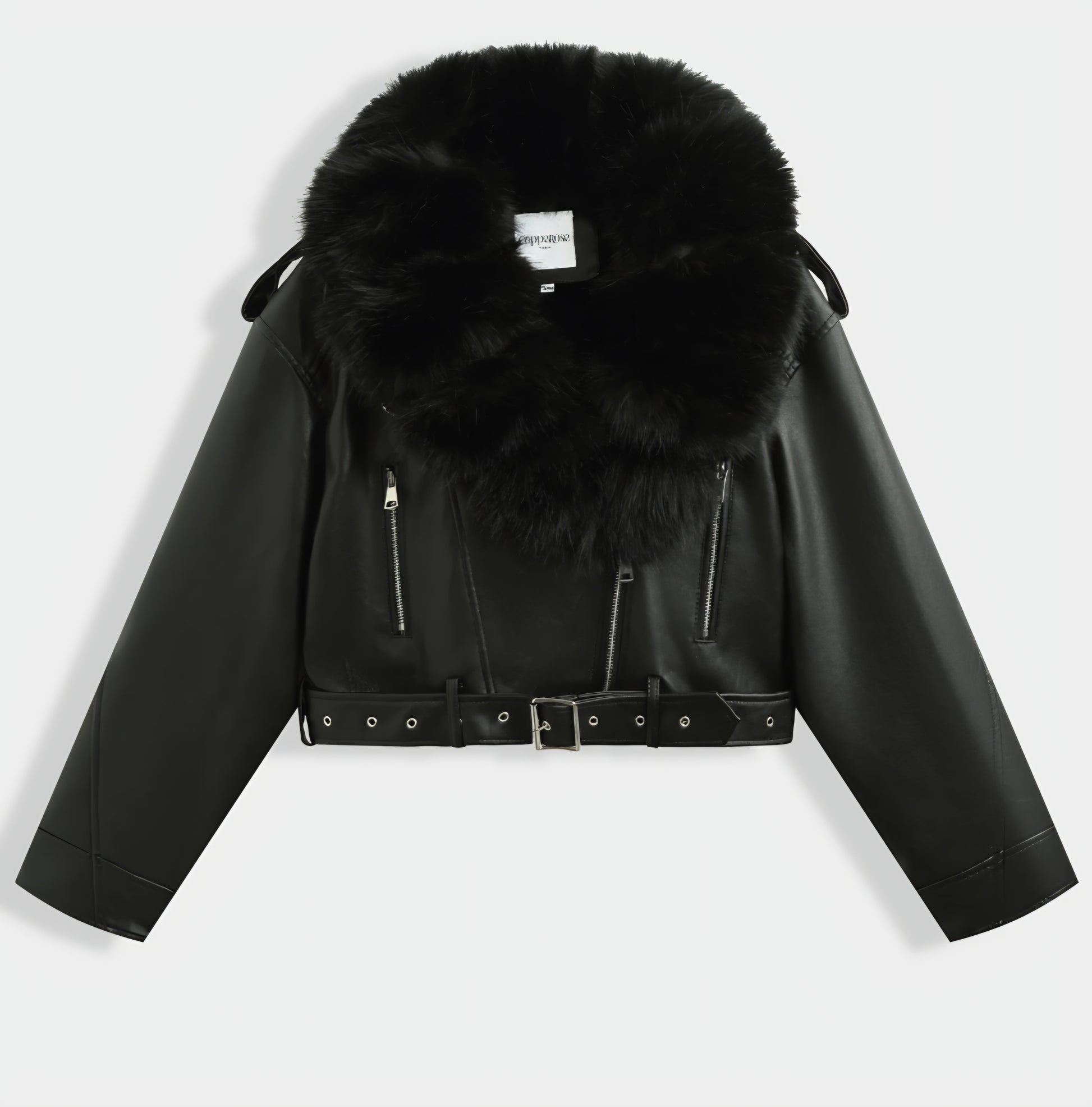 Kort jacka med överdimensionerad, avtagbar krage i fuskpäls. Metallisk dragkedja fram. Knäppta axelflikar, vertikala fickor med dragkedja och justerbart spännesbälte nedtill. Foder i samma färgton.