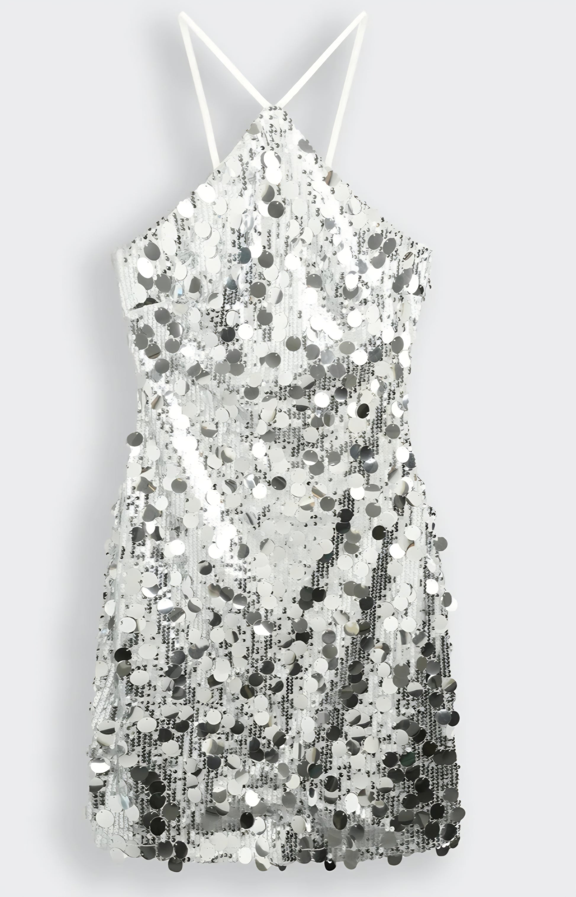 Rak kort klänning med halterneck. Tunna axelband korsade bak med knytband. Tyg klädd med stora runda paljetter. Öppen rygg. Fodrad. Sidoknäppning med dold dragkedja.