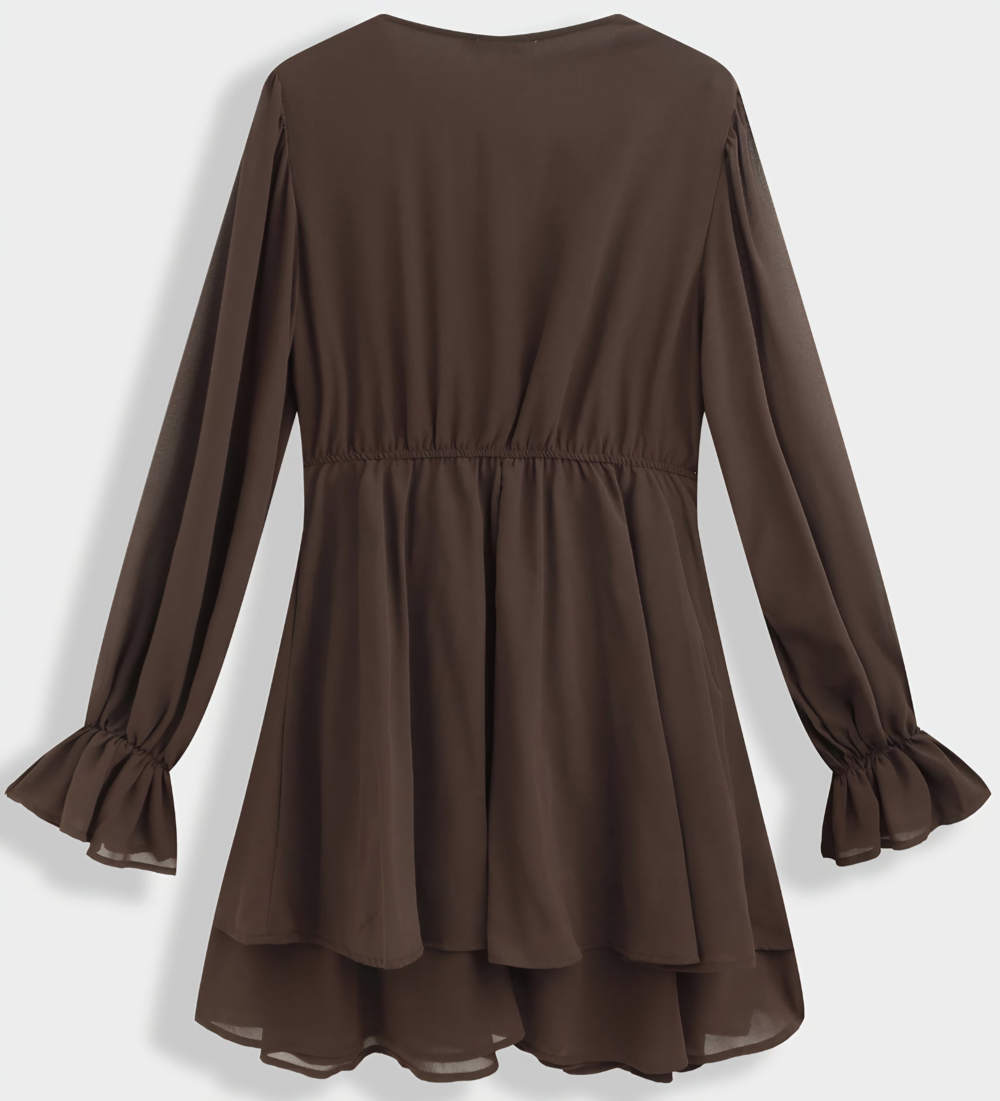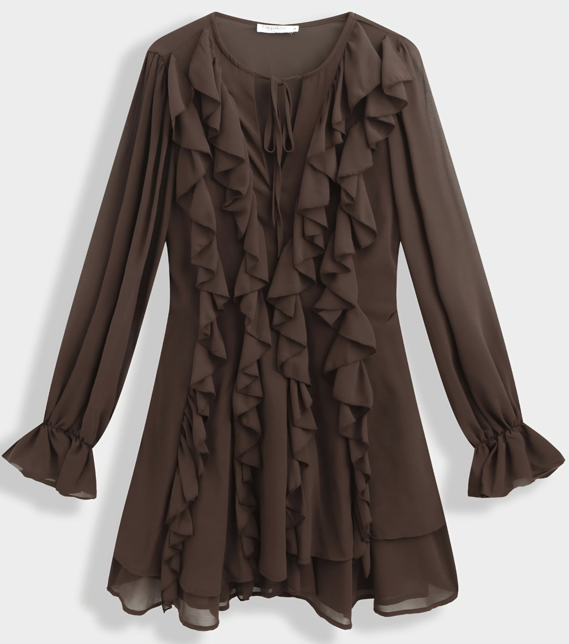 Kort klänning i böljande georgette-crêpe. Rund halsringning med slits som knyts med ett knytband. Volanger framtill och längs den mittersta knappen. Långa ärmar, lätt puffade med volangkanter och resår. Midja bak med rynkad effekt. Utsvängd nederkant med lager-på-lager-volanger. Knäppning bak med knapp och nyckelhål.