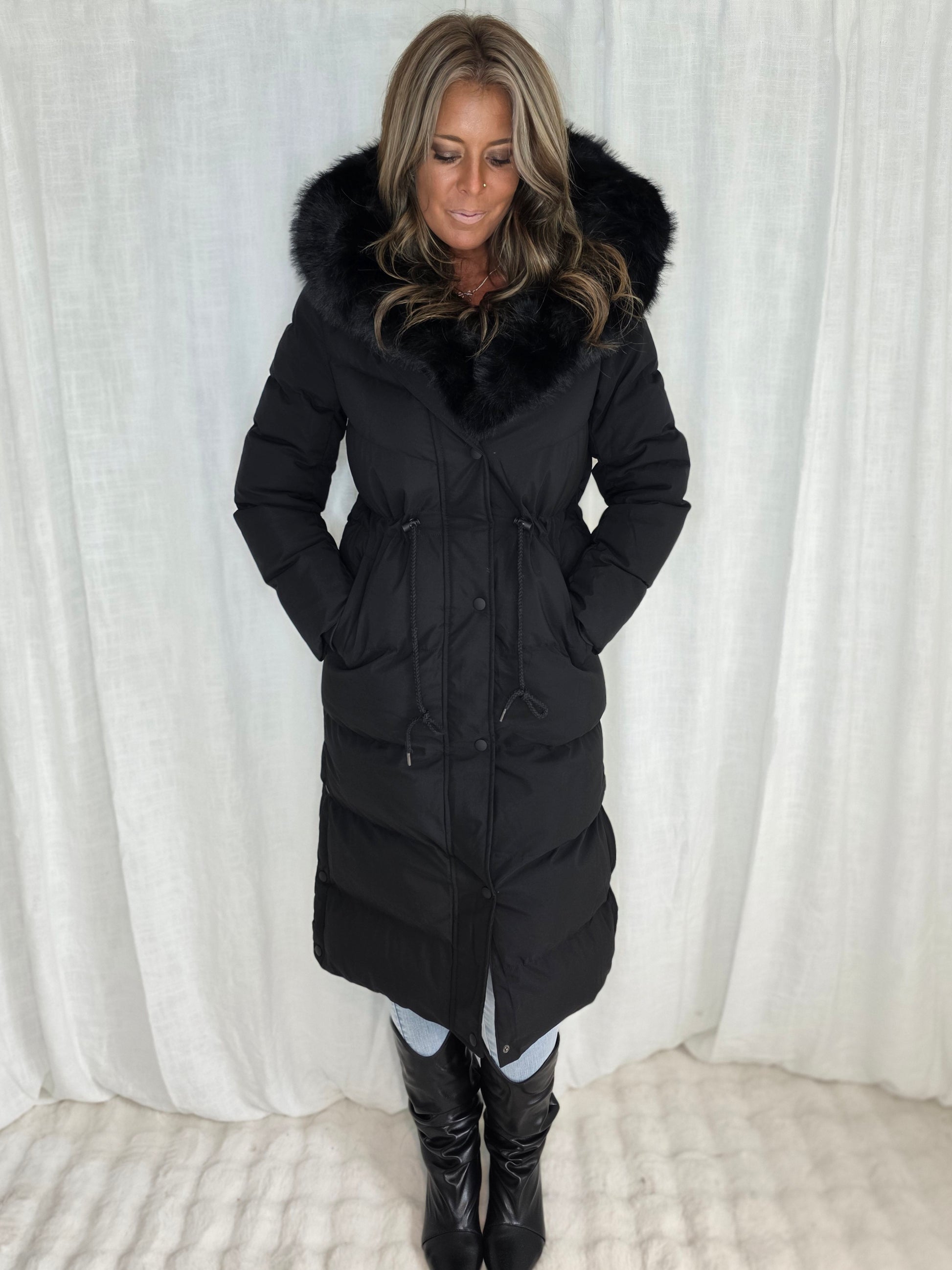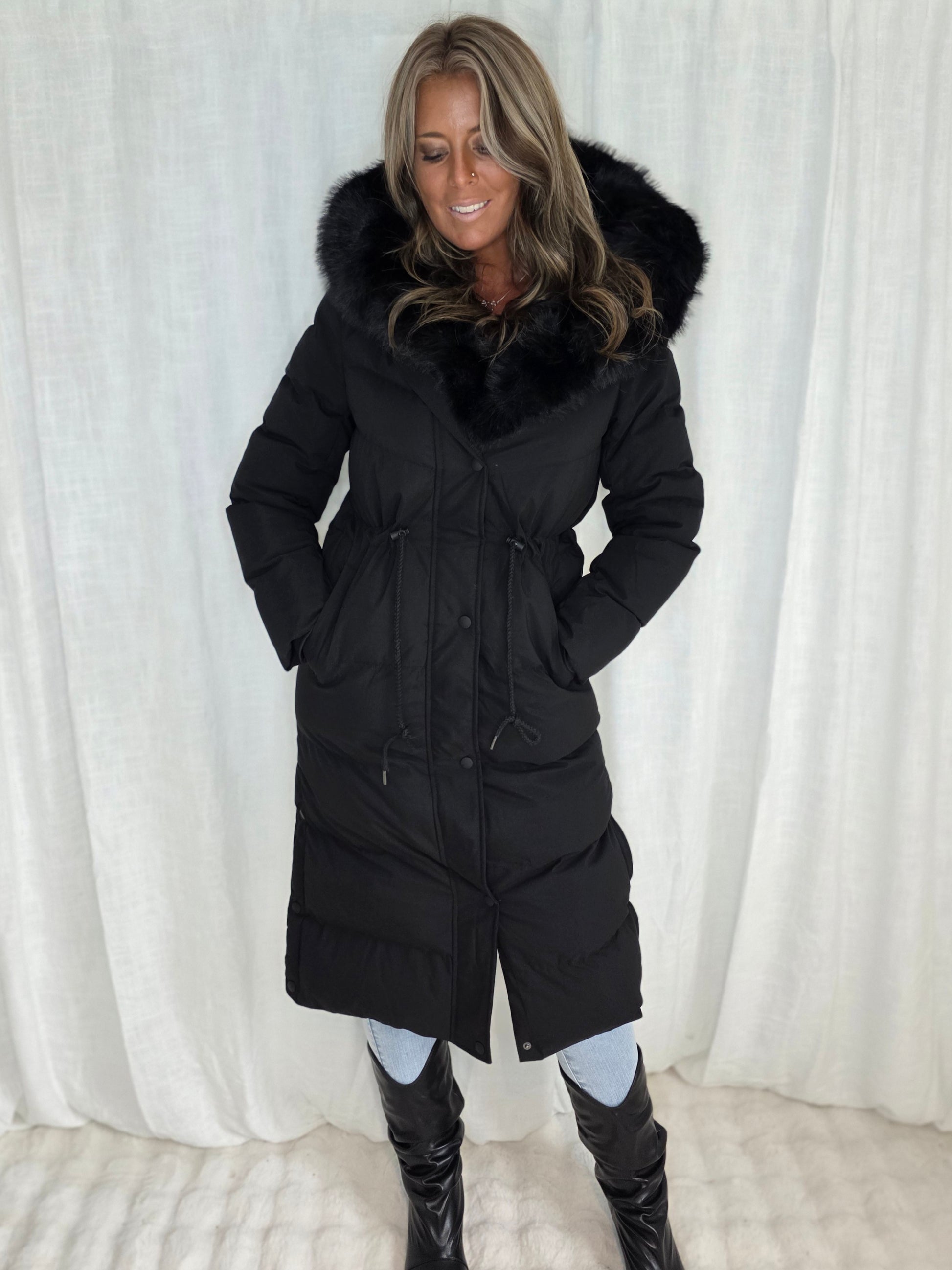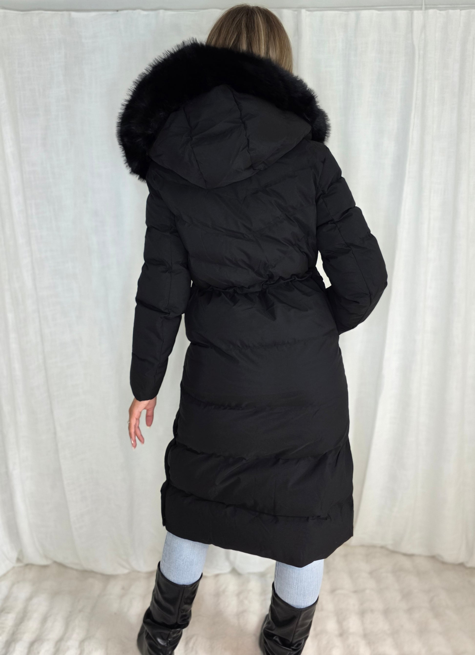 Lång dunjacka Bella med pälsfodrad huva och dragsko Svart