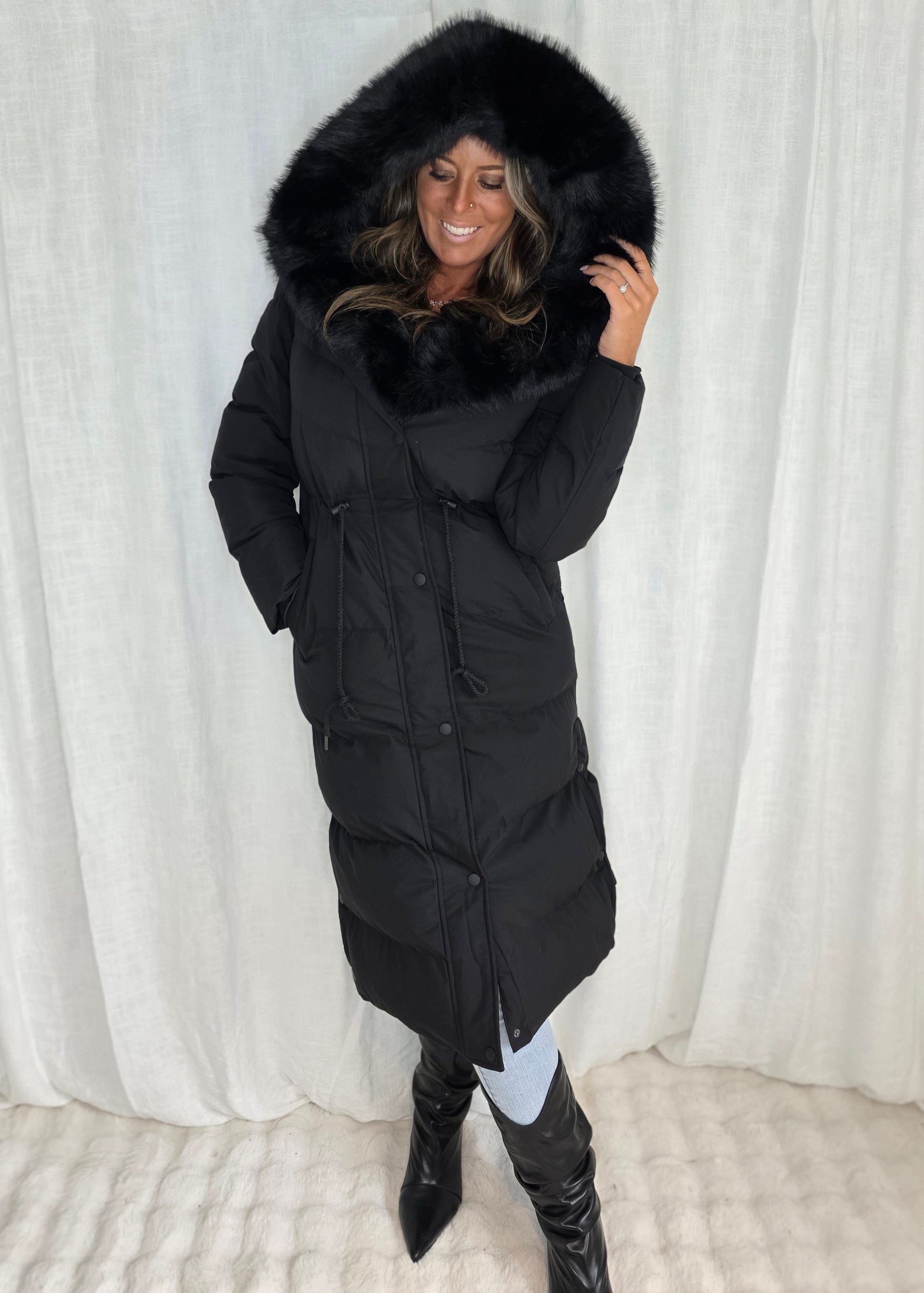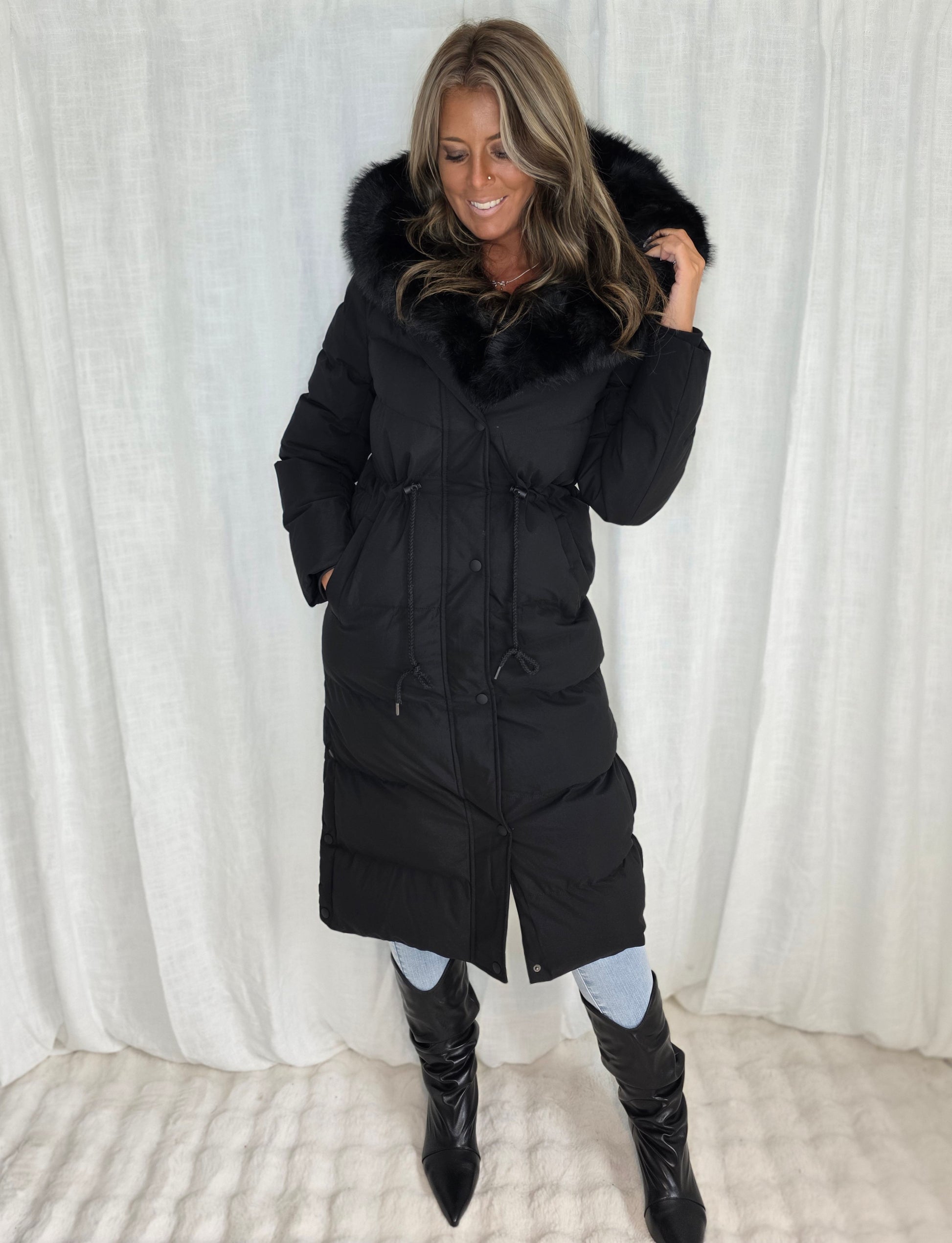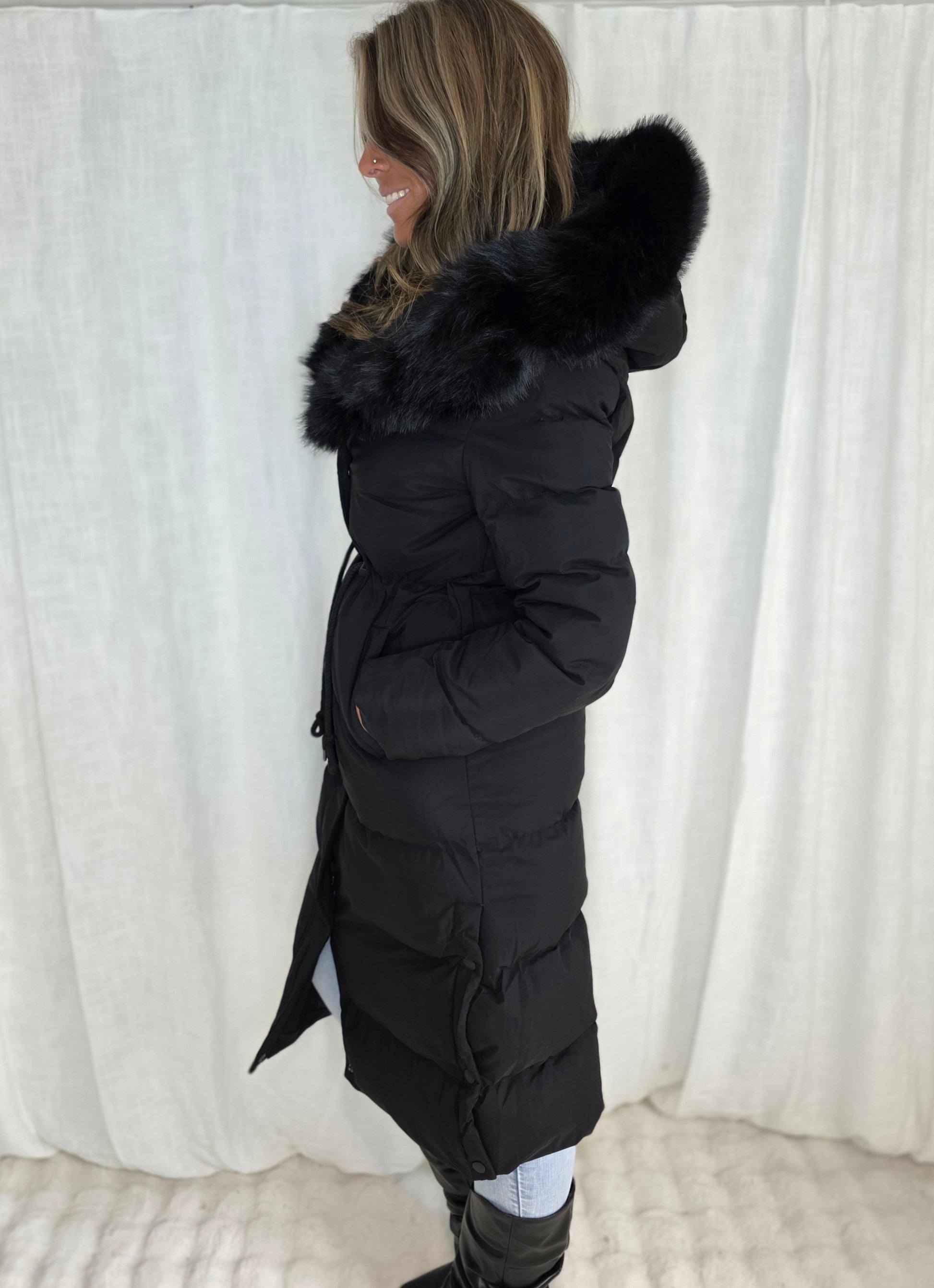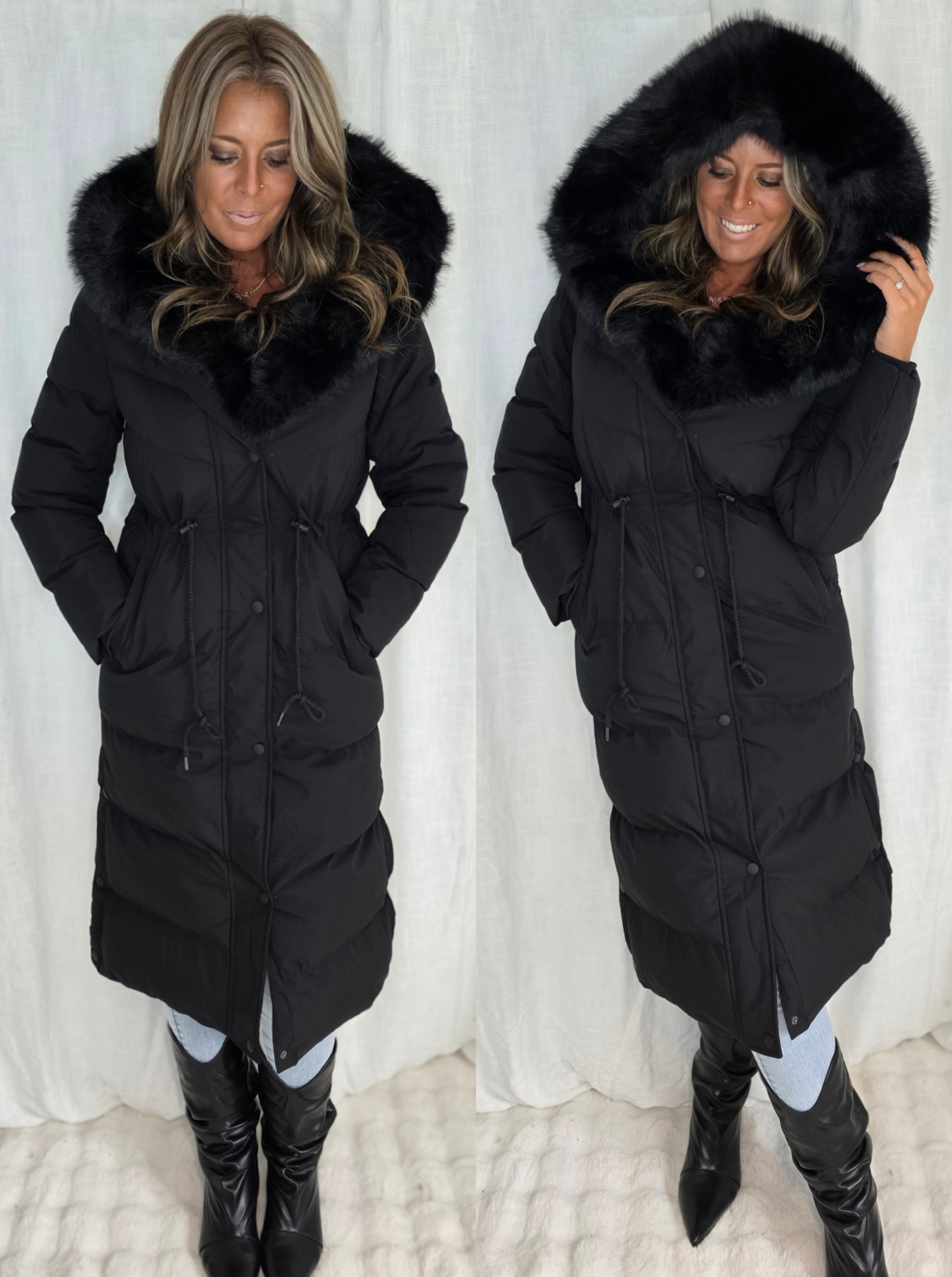 Lång dunjacka Bella med pälsfodrad huva och dragsko Svart