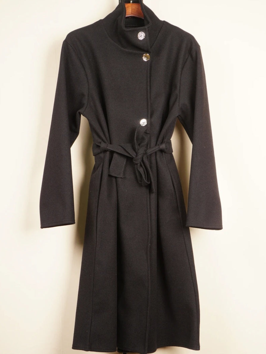 • Stängning: Asymmetrisk öppning framtill med tre dekorativa knappar på en förskjuten knappslå.